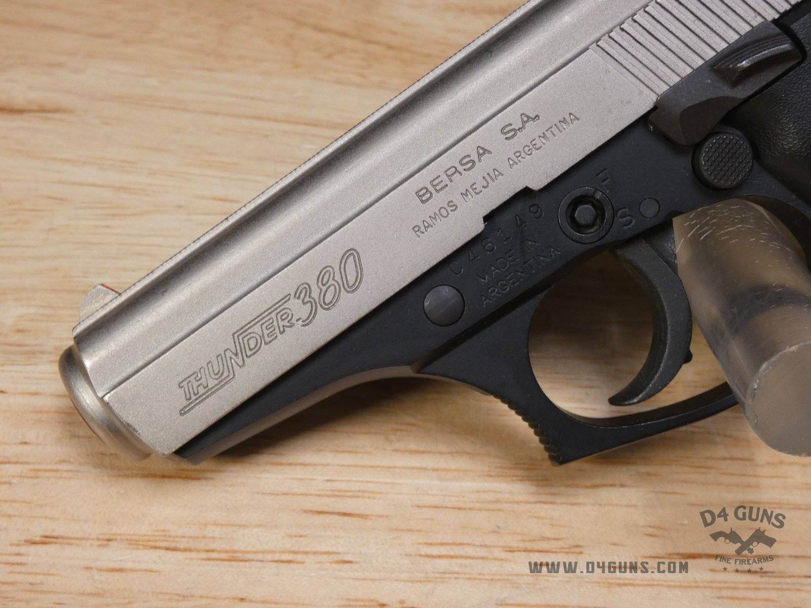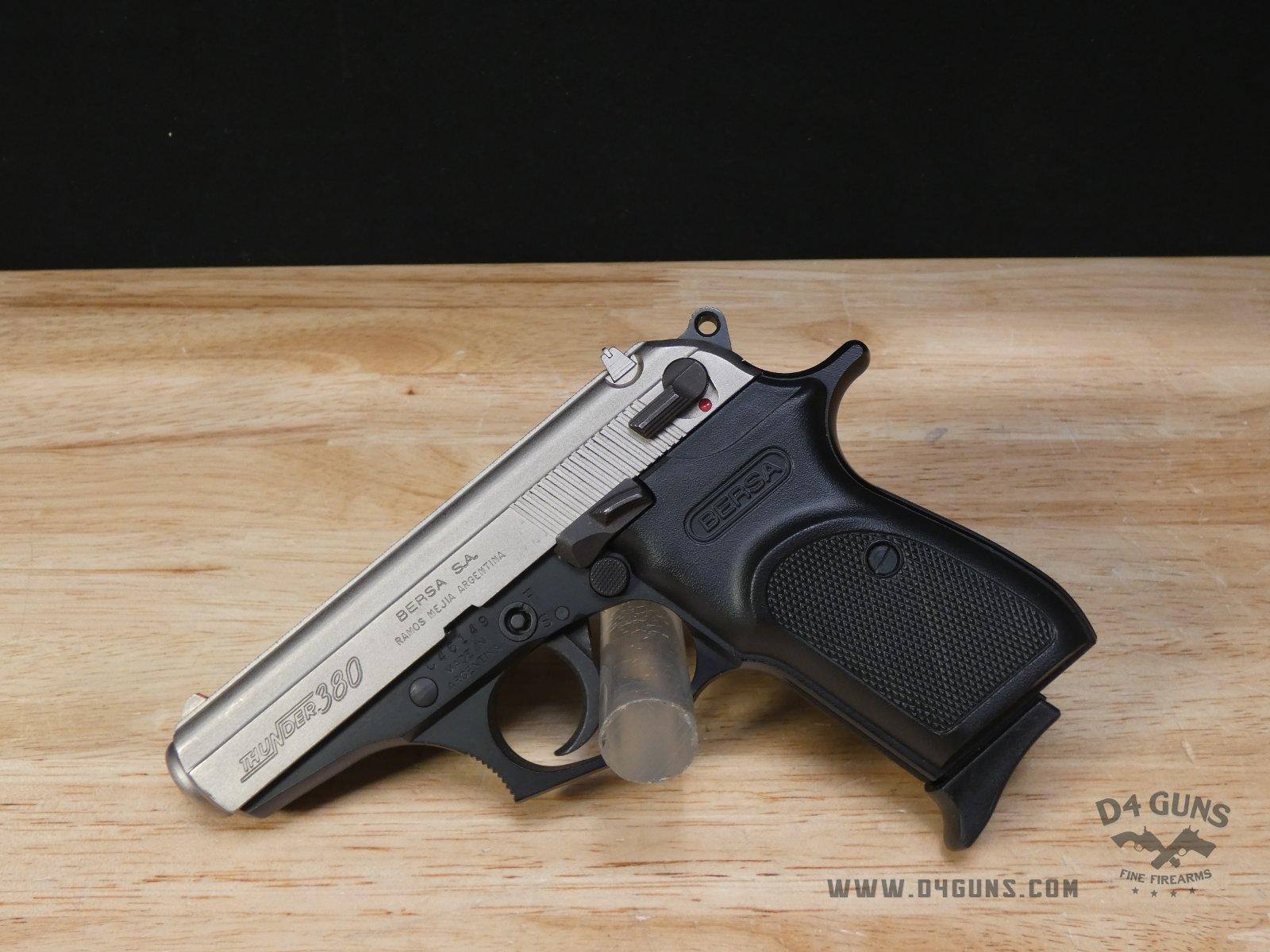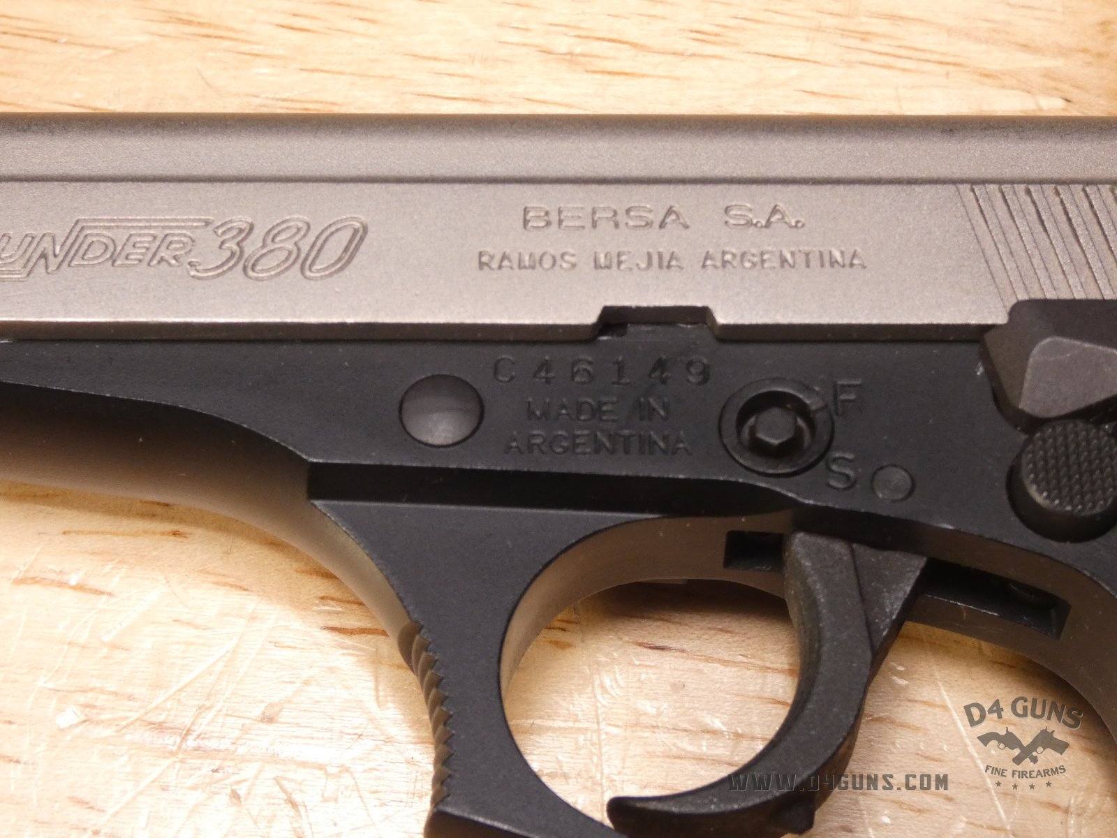 For sale is a Bersa Thunder 380 semi-automatic pistol in .380. Serial number-C46149. This pistol is in great condition and comes with one magazine. Throughout its history, the Thunder 380 model pistols have impressed anyone requiring concealment, accuracy and reliability. The 380 Plus’s alloy frame provides strength and superior balance – at a reduced weight. V2-E3 Barrel Length: 3.54 Bore condition: Good