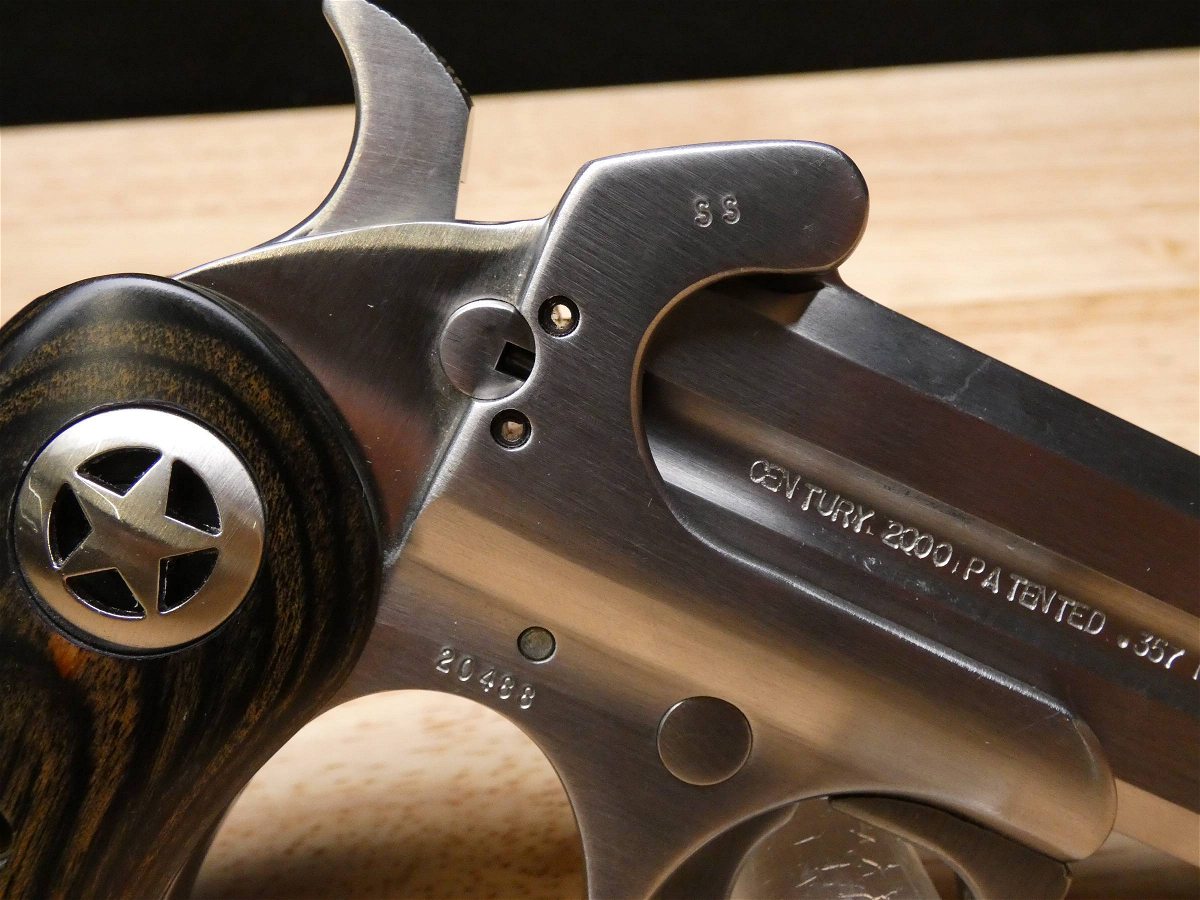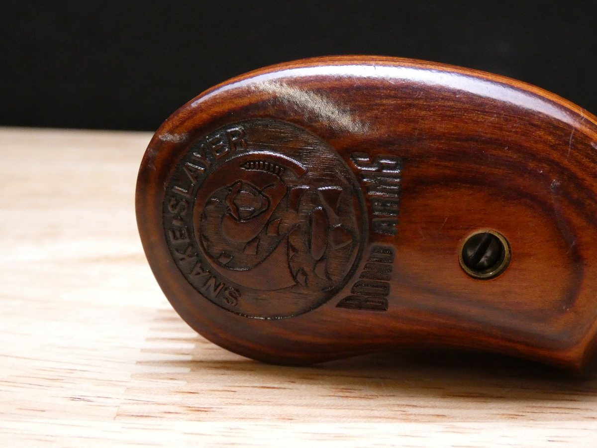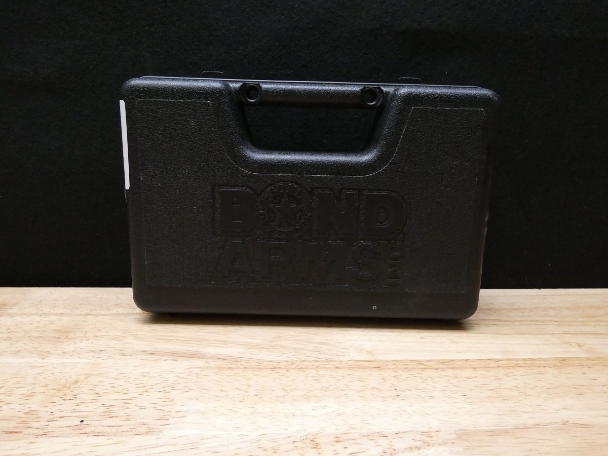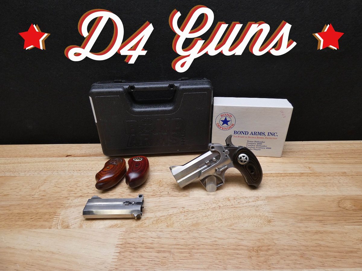For sale is a Bond Arms Snake Slayer derringer in .45LC/.410 and .357/ 38 SPL. Serial number- 20488. This derringer is in excellent condition and comes with 2 extra grips, 2 interchangeable barrels, hardcase, and OG box. Features a stainless steel double-barrel and frame, rosewood grips, automatic spent casing extractor, retracting firing pins, cross-bolt safety, and a spring-loaded, cammed locking lever. The Snake Slayer is Bond Arms most popular model is the perfect protection for hikers, campers, fishermen and others that enjoy the great outdoors. V2-D2 Barrel Length: 3.5 Bore condition: Excellent