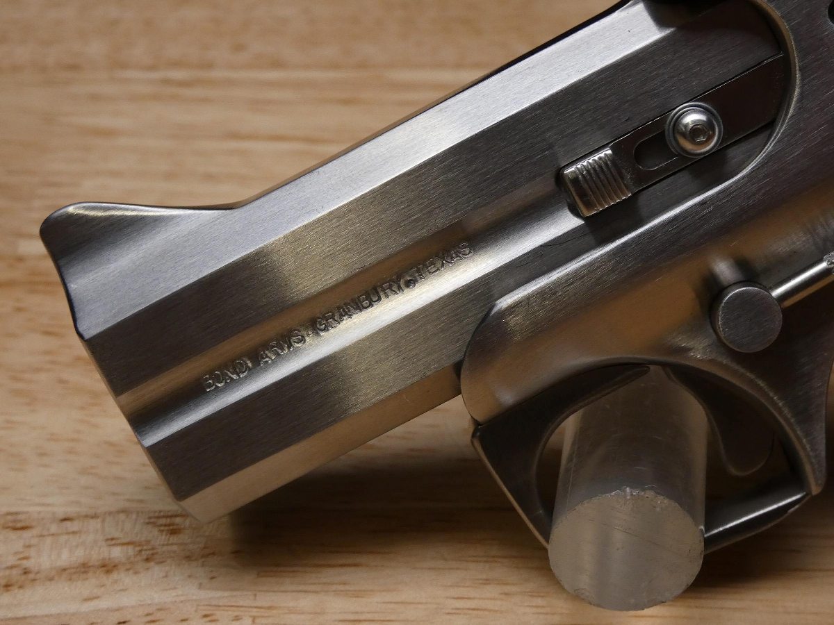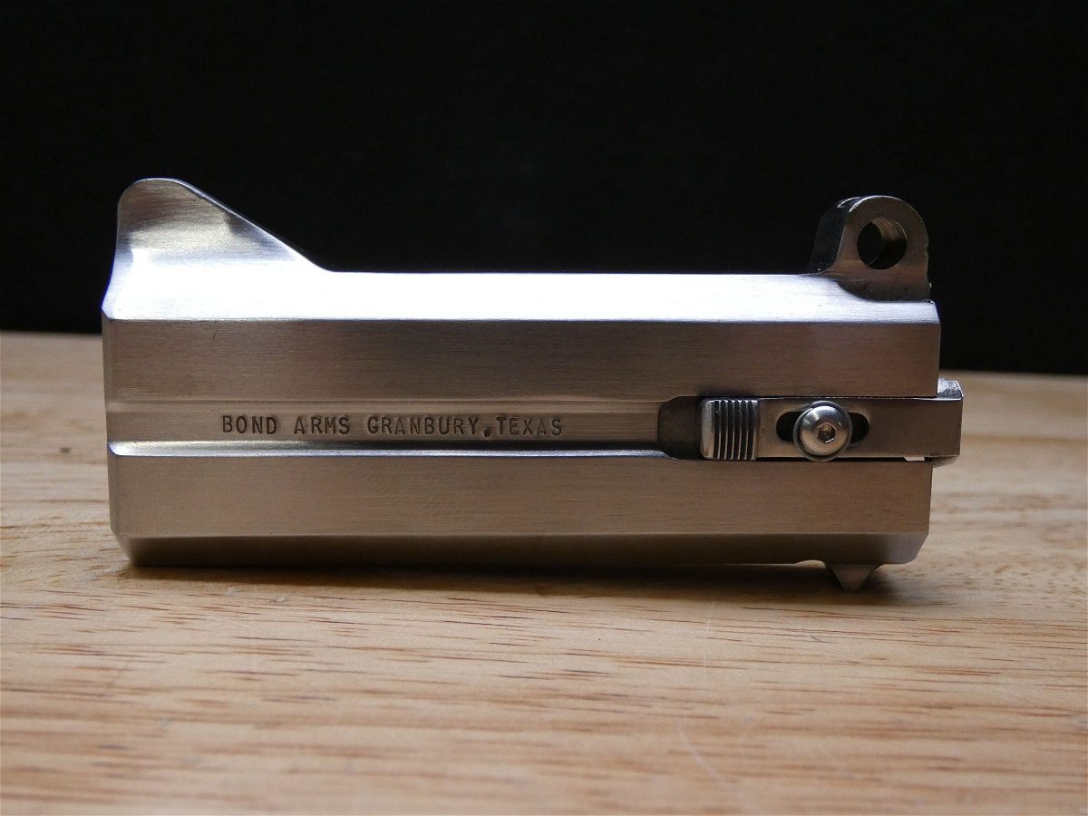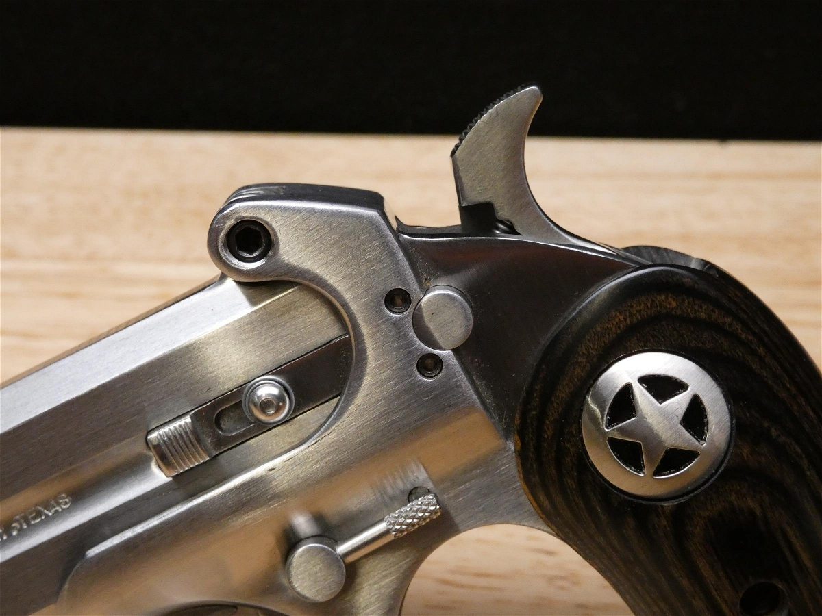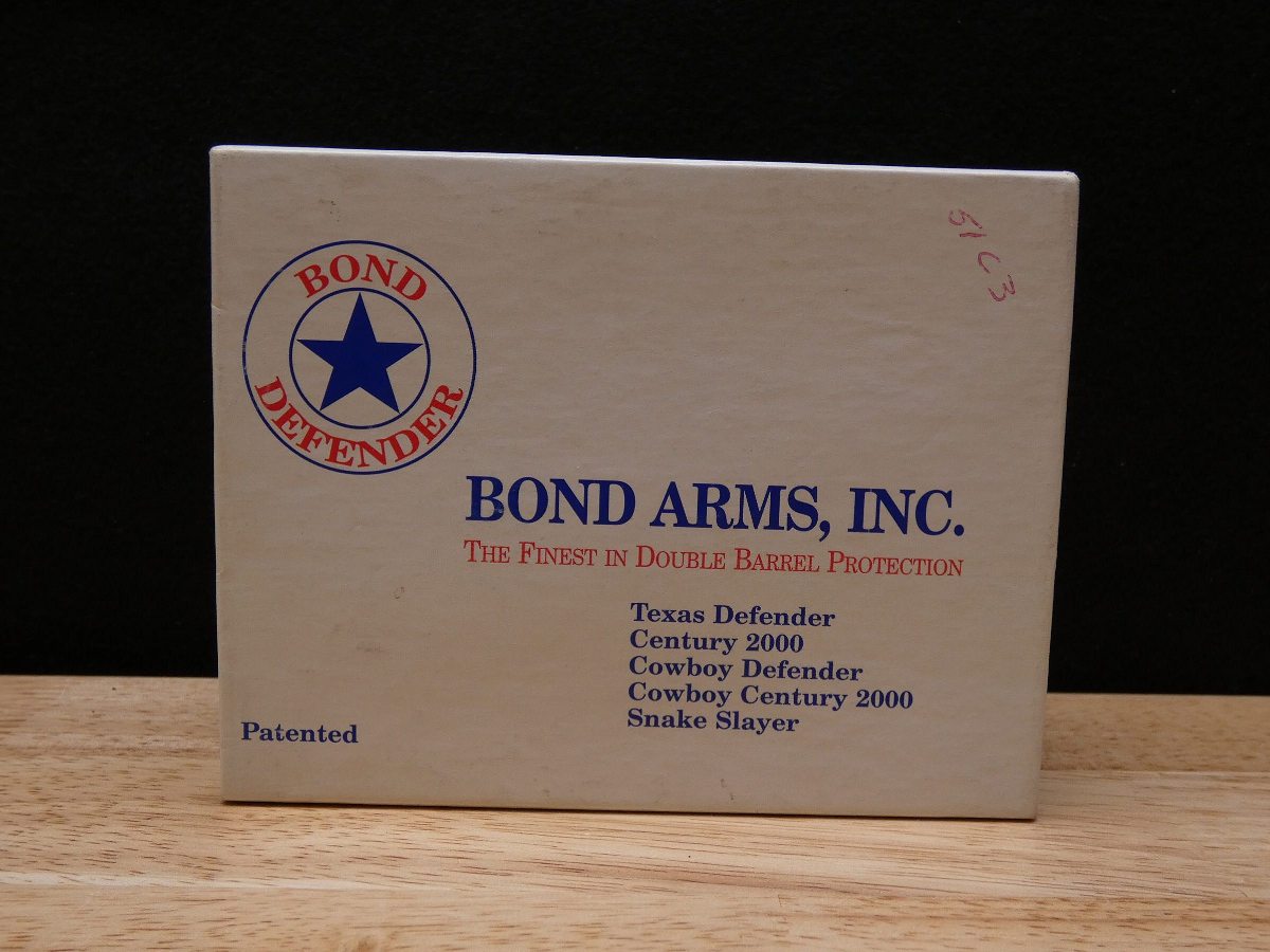 For sale is a Bond Arms Snake Slayer derringer in .45LC/.410 and .357/ 38 SPL. Serial number- 20488. This derringer is in excellent condition and comes with 2 extra grips, 2 interchangeable barrels, hardcase, and OG box. Features a stainless steel double-barrel and frame, rosewood grips, automatic spent casing extractor, retracting firing pins, cross-bolt safety, and a spring-loaded, cammed locking lever. The Snake Slayer is Bond Arms most popular model is the perfect protection for hikers, campers, fishermen and others that enjoy the great outdoors. V2-D2 Barrel Length: 3.5 Bore condition: Excellent