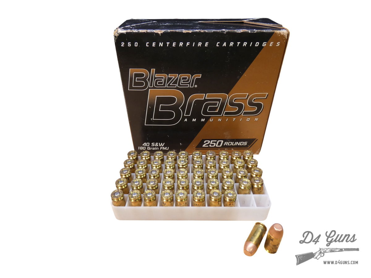 CCI Blazer – .40 S&W – 180gr – FMJ – 250 Rounds Per Box – MFG PART #52201 – UPC: 076683522016. Blazer Brass brings shooters the reliability and quality of ammunition built to SAAMI standards, and is backed by stringent ISO certified quality systems. Blazer Brass is loaded in reloadable brass cases for added value.
