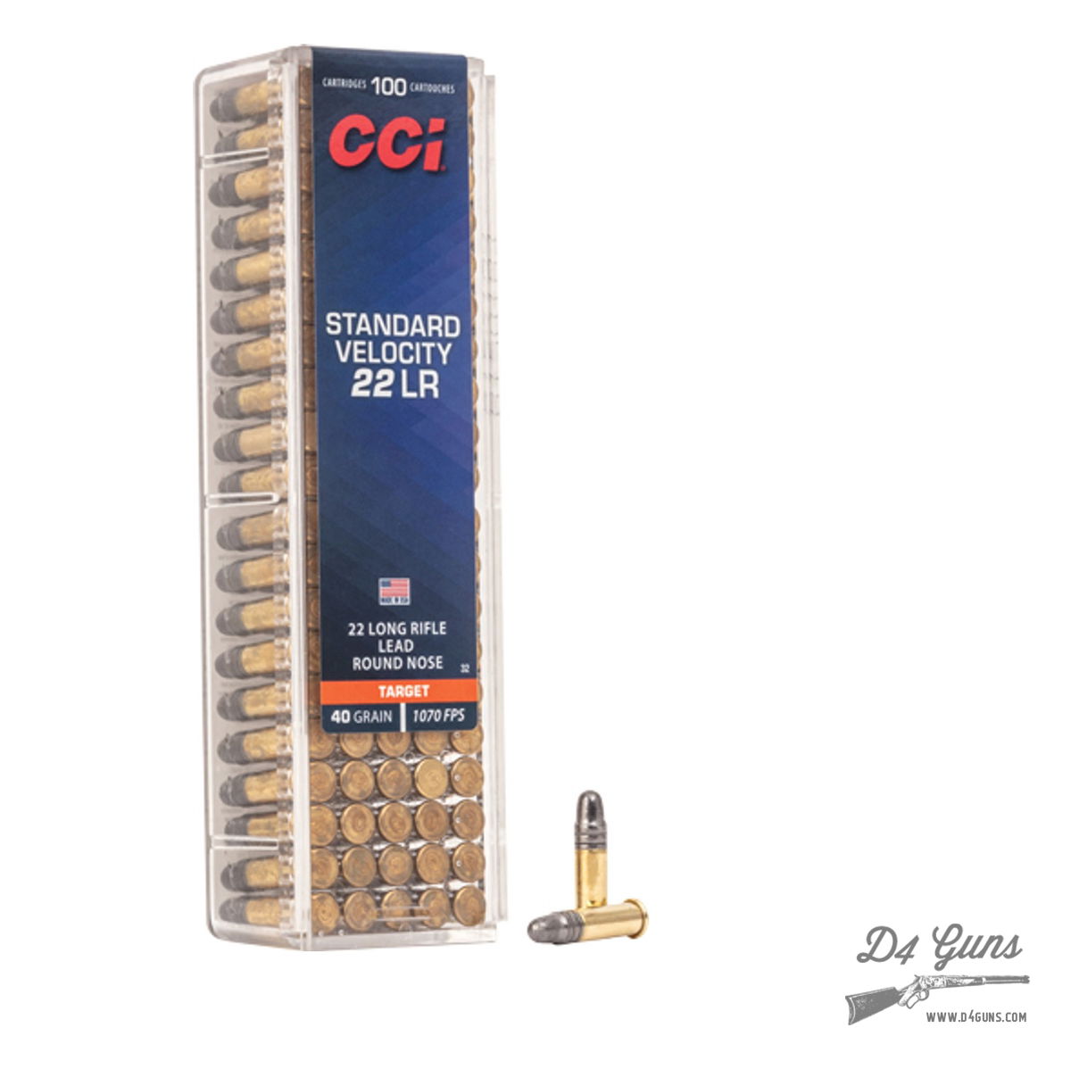 CCI Standard Velocity – .22LR – 40gr – Lead Round Nose – 100 Rounds Per Box – MFG PART #0032 – UPC: 076683000323. CCI 22 Long Rifle ammo is loaded with a 40 grain bullet that is great for small game hunting and casual plinking. The 22 Long Rifle High Velocity gives you great performance. Please Note: The manufacturer's box artwork and design may differ from what is depicted in the photo.