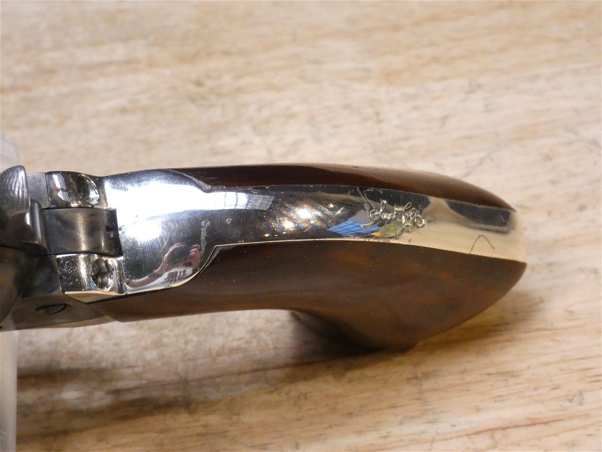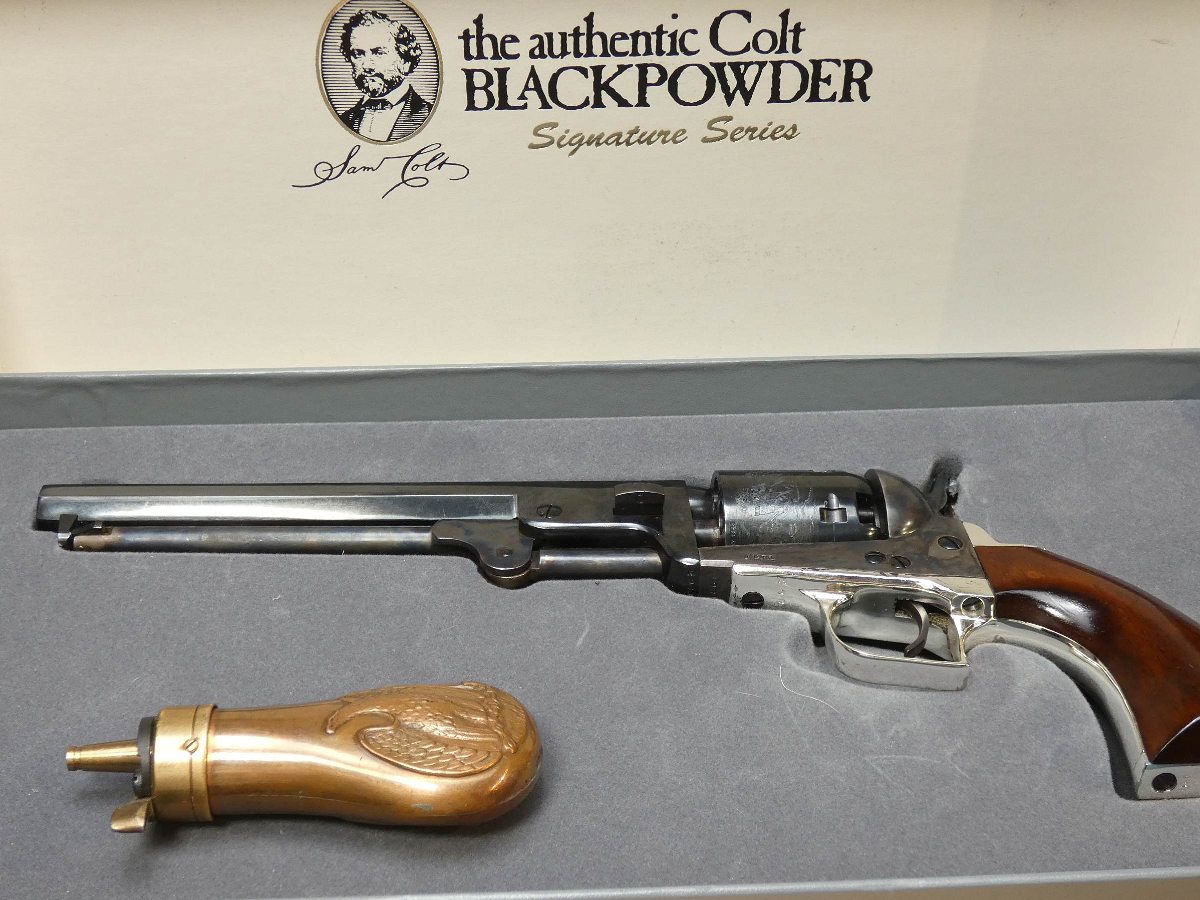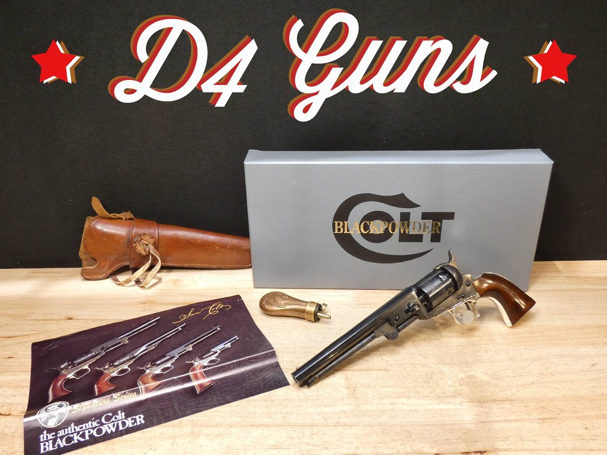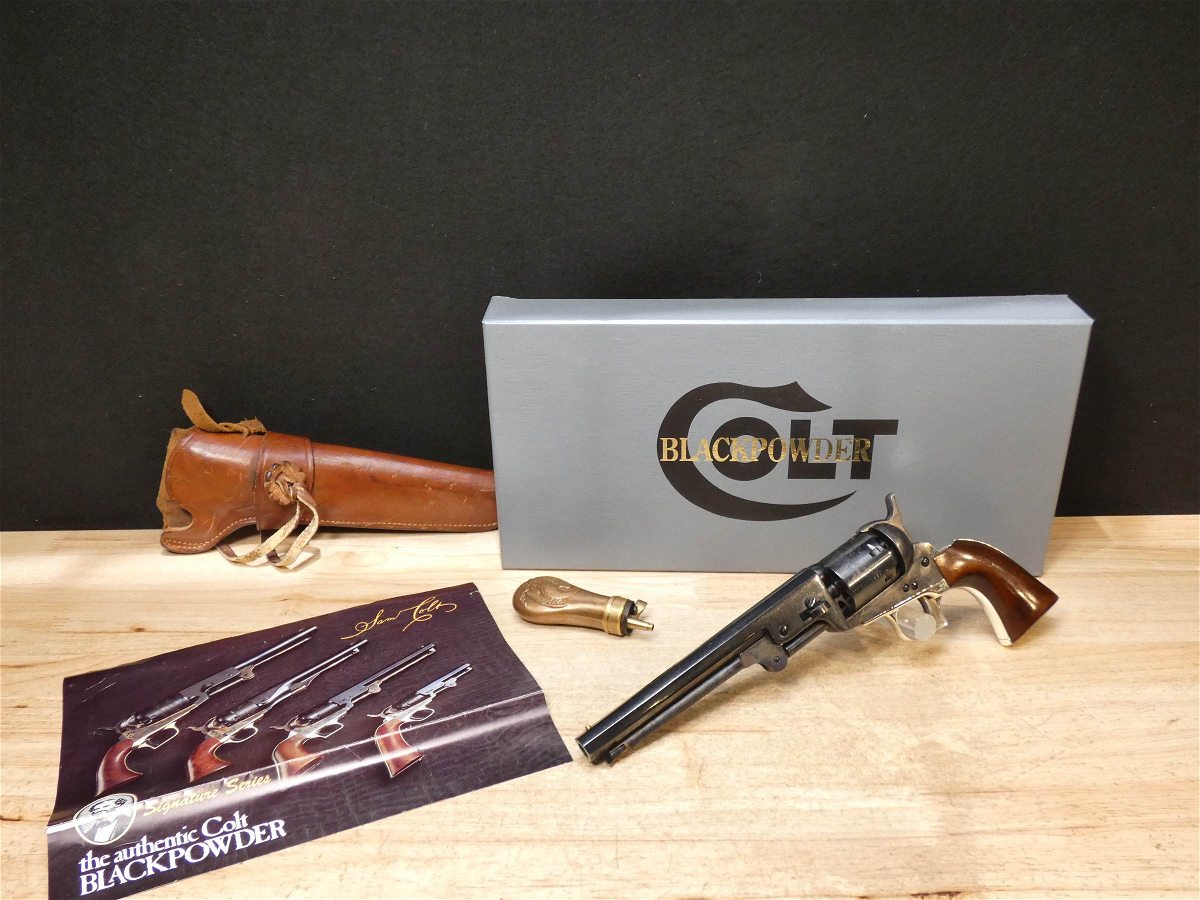 For sale is a Reproduction Colt 1851 Navy black-powder revolver in .36 CAL BP. Serial number – 31861. Signature Series production. This revolver is in good condition and comes with the powder flask and a holster. It does have a scratch on the receiver as seen in the pictures as well as the backstrap. The "Colt Revolving Belt Pistol of Naval Caliber," as the 1851 Navy was originally called, was Colt’s first practical revolver, coming after its 4-lb., 8-oz., .44-cal. Dragoon and the less-powerful .31-cal. Pocket Models. The well-balanced .36-cal. ’51 Navy packed an impressive punch and was a favorite of such diverse pistoleros as "Wild Bill" Hickok and Frank James. V2-E1 Barrel Length: 7.5 Bore condition: Excellent