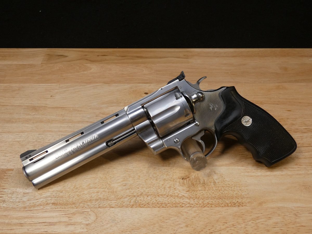 For sale is a Colt Anaconda single/double action revolver in .44 Mag. Serial number- MM58795. This revolver is in great condition and comes with the original box, and manual. The bore is in excellent condition. Mfg in 1994. This revolver features a factory 6" ported barrel with full-length vented top-rib and full-length underlug. The Colt Anaconda is a large-frame double-action revolver featuring a full-length under-barrel ejection-rod lug and six-round cylinder, designed and produced by Colt's Manufacturing Company in 1990. V2-I1-NV Barrel Length: 6 Bore condition: Excellent Year Manufactured: 1994