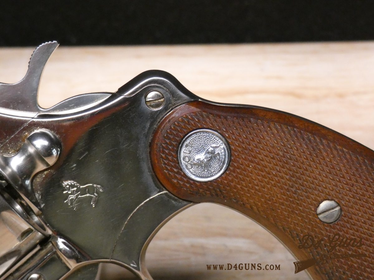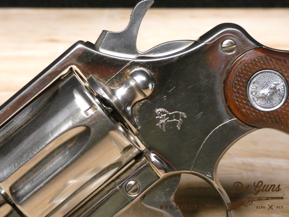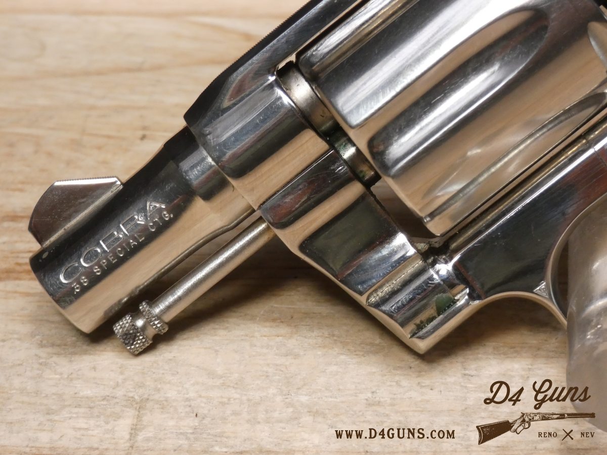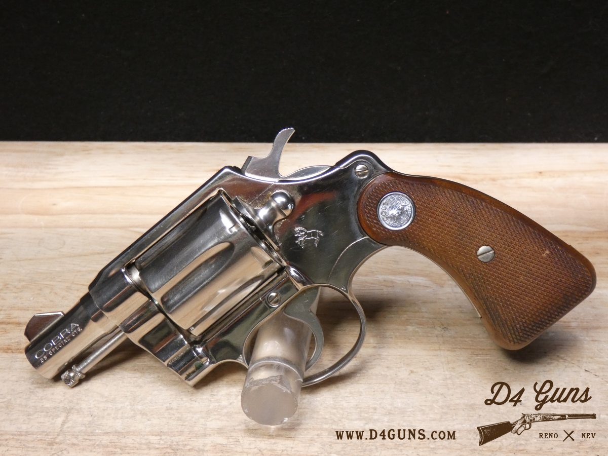 For sale is a Colt Cobra revolver pistol in .38 SPL. Serial number- A62108. MFG dated to 1969. This revolver is in great condition but there are some blemishes on the backstrap of the revolver. We are not sure if the finish is chrome or nickel but the blemishes on the backstrap of the frame seem to coincide with nickel wear. The cylinder release is also a little sticky but the timing and lock up are good.
