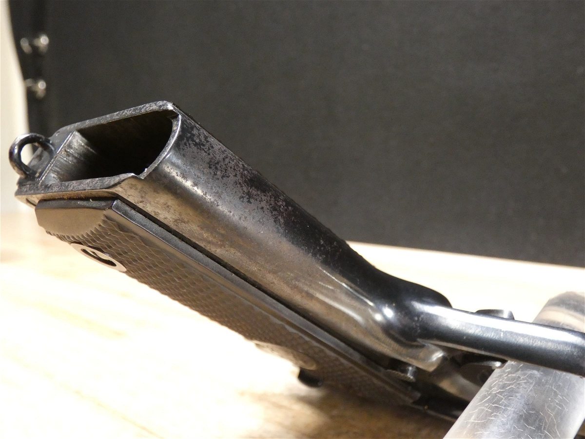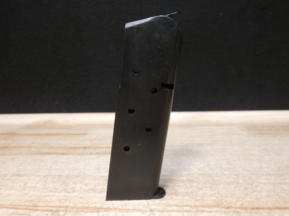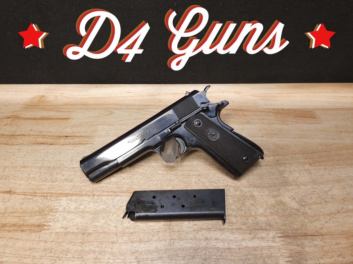 For sale is a Colt Model 1911 semi-automatic pistol in .45 ACP. Serial number- 94604. This Colt Model 1911 is in good condition and comes with 1 magazine. The magazine is stamped "S" for Scoville which places it as a time period correct magazine! PLEASE NOTE: The frame is from an original Colt 1911 Military WWI Model and the slide is from a later Colt Government Model making this mismatched. It also appears it may have been refinished at some point but we are uncertain. The frame's serial number dates back to a 1914 manufacture date. The M1911, also known as the Colt 1911, or the Colt Government, is a single-action, semi-automatic, magazine-fed, recoil-operated pistol chambered for the .45 ACP cartridge. The U.S. military procured around 2.7 million M1911 and M1911A1 pistols during its service life. The pistol served as the standard-issue sidearm for the United States Armed Forces from 1911 to 1985. It was widely used in World War I, World War II, the Korean War, and the Vietnam War. The 1911 is generally viewed as one of the finest combat pistols ever designed and the first successful self-loading pistol. 1911 was designed by American firearms inventor John Browning and is the oldest service pistol in the world, still used in over 25 nations for over 100 years; it has proven itself to be one of the most popular and timeless handguns ever made. V2-F3 Barrel Length: 5 Bore condition: Excellent