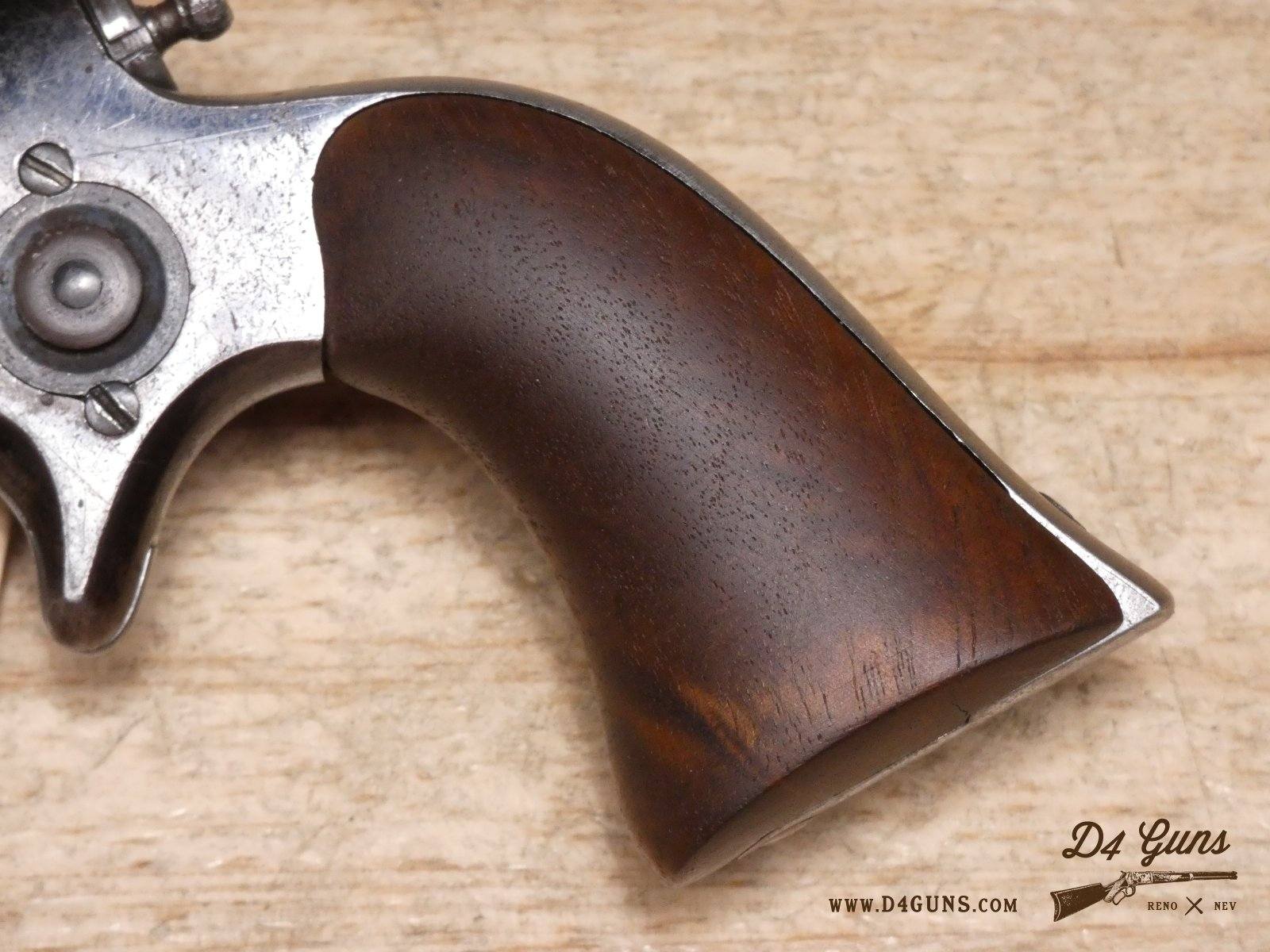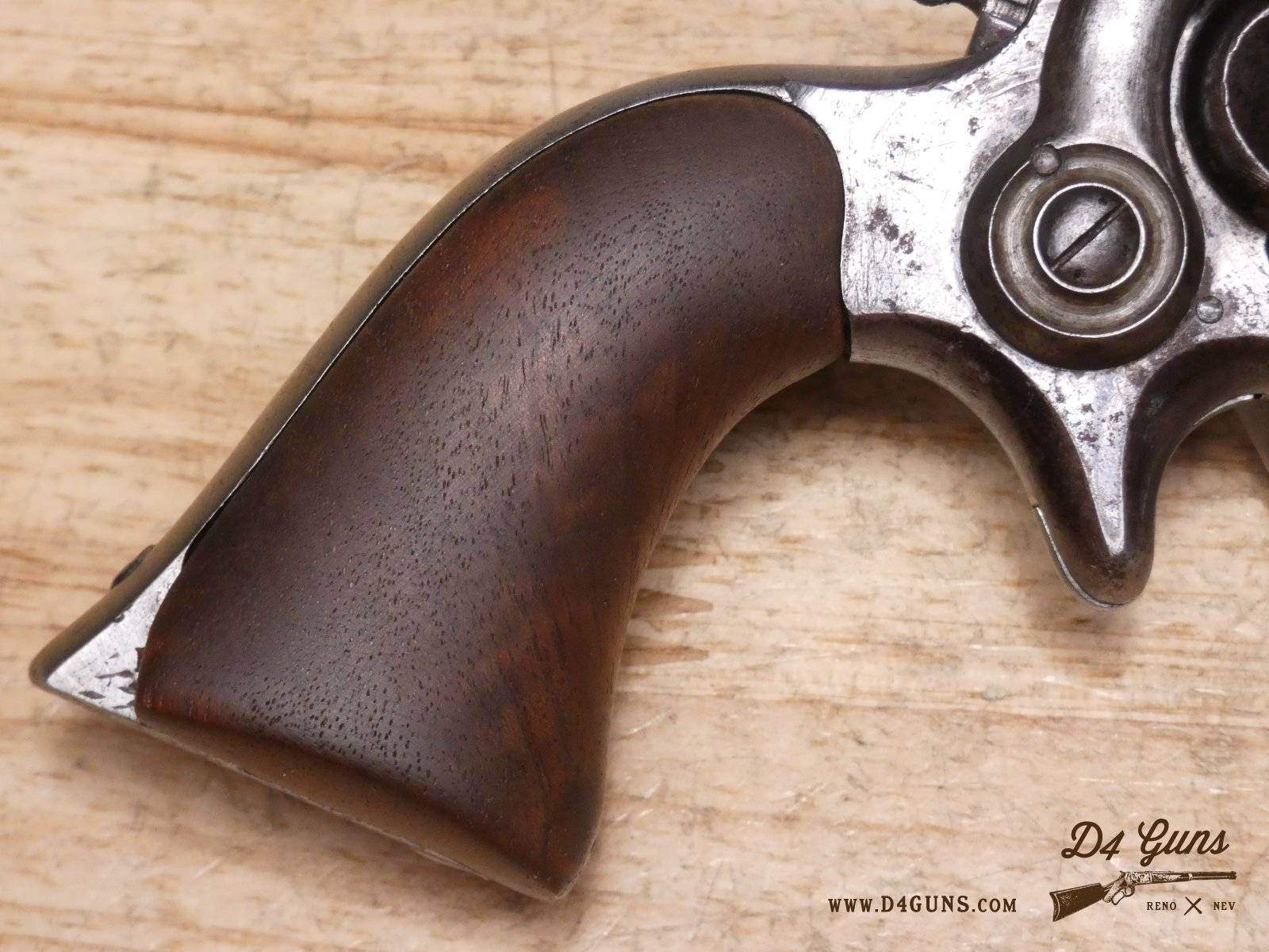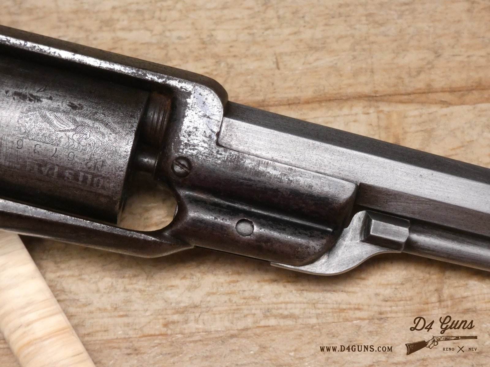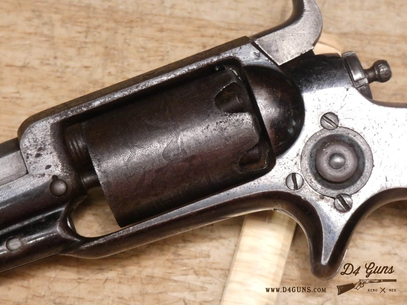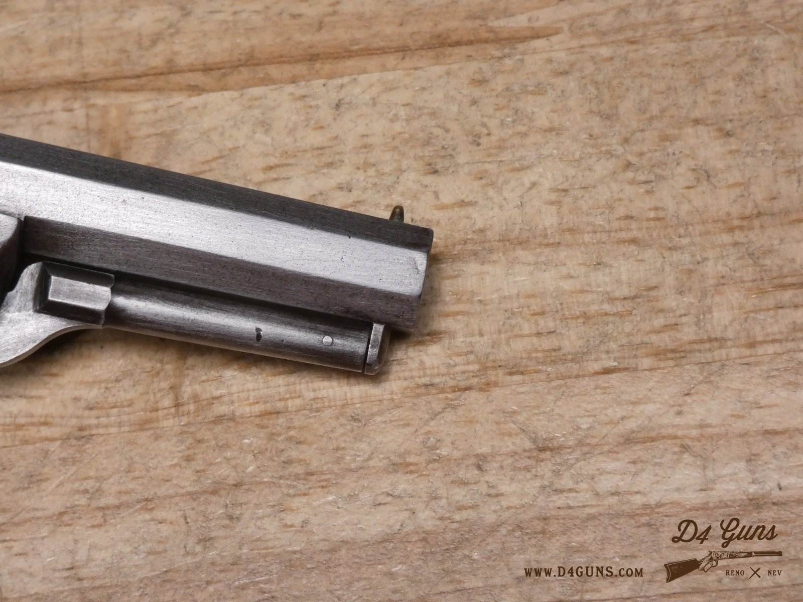 The Model 2 was in .28 caliber and in serial range #476 – #25000; Hartford barrel address with pointing hand motif, octagon barrel 3 ½ inch long, cylinder with Cabin and Indian scene. Nipples integral with the cylinder. V2-E3 Barrel Length: 3 Bore condition: Fair