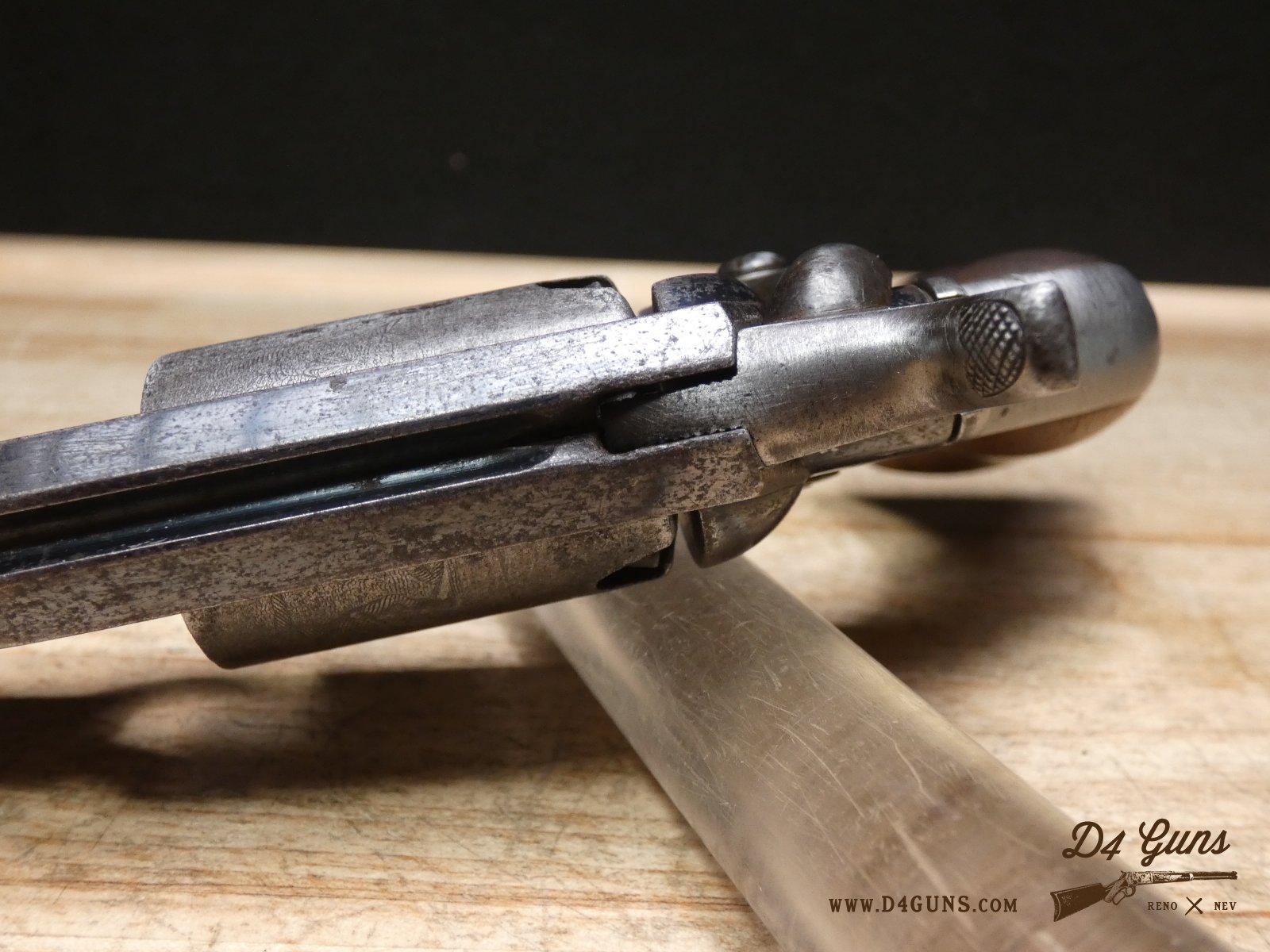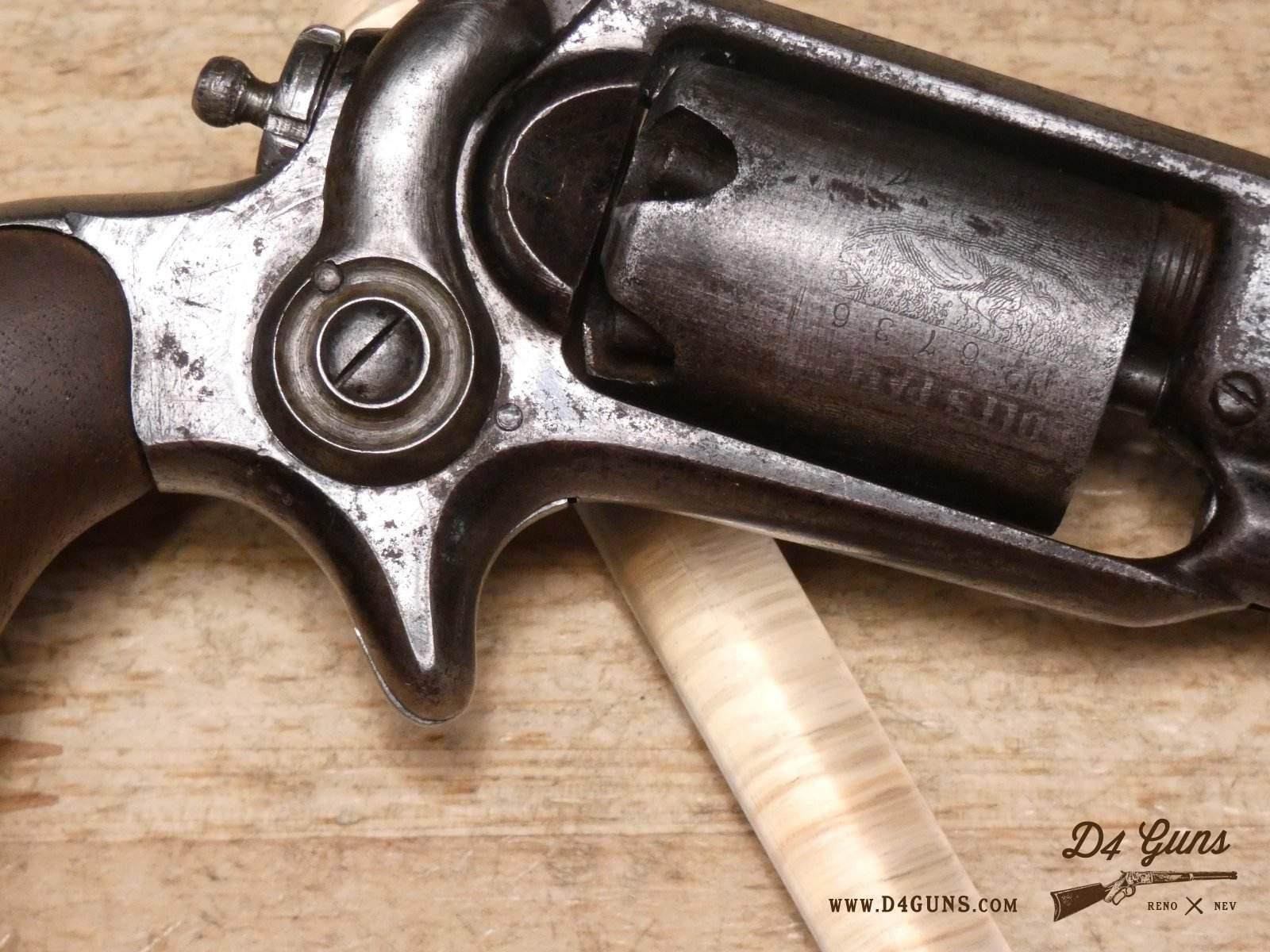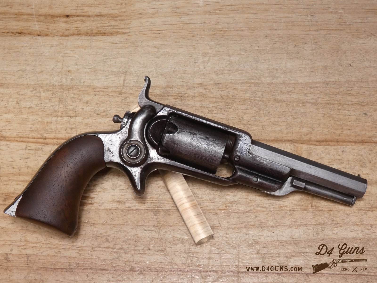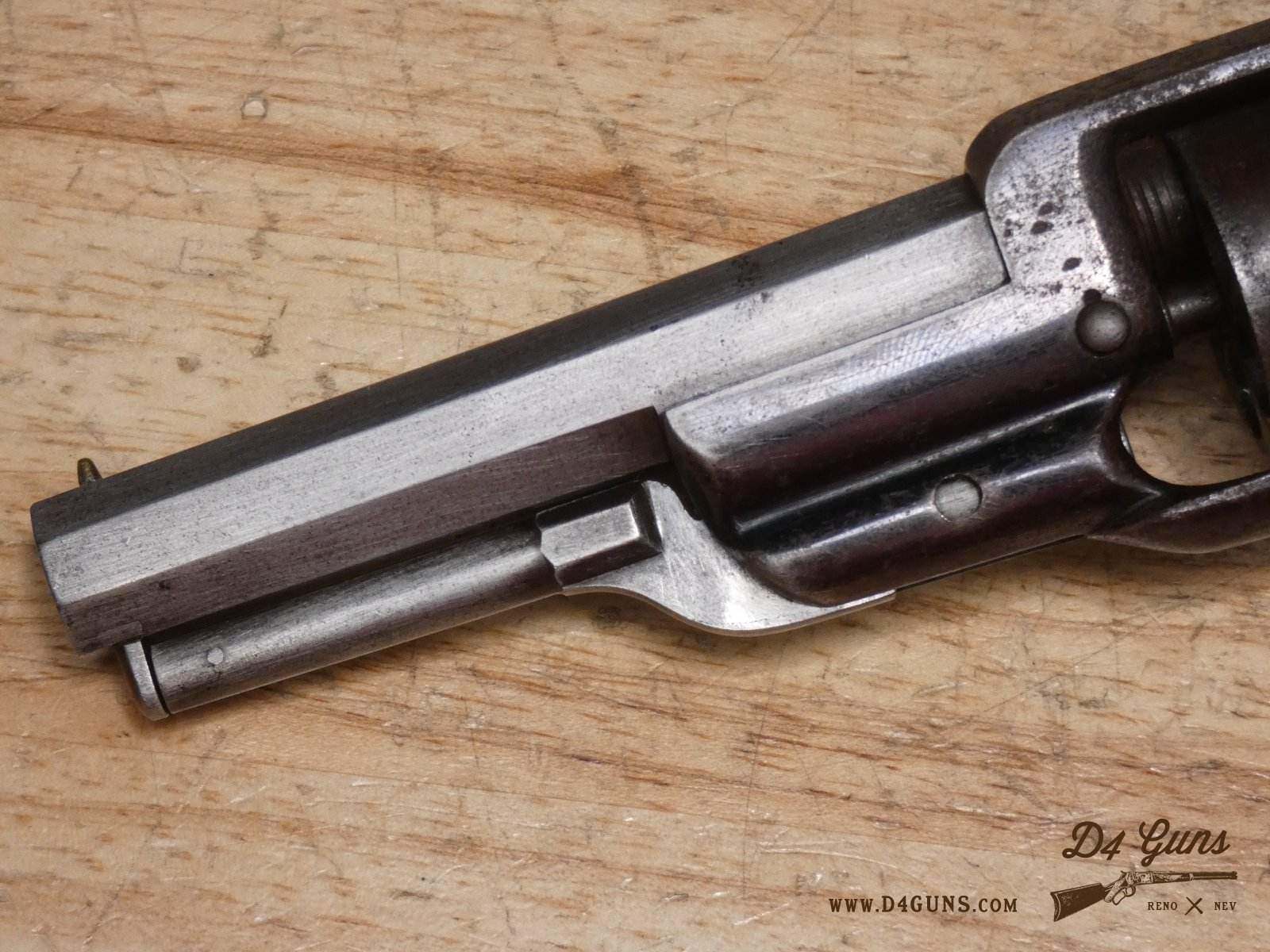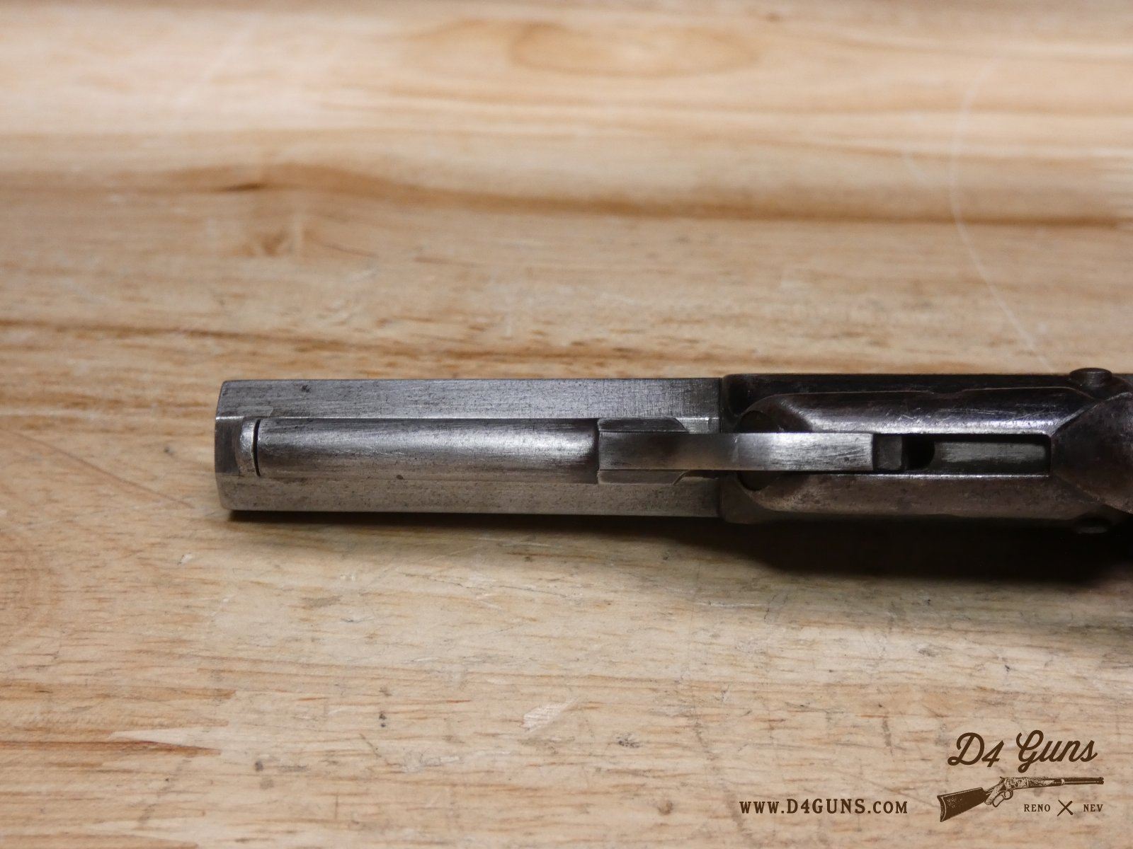 The Model 2 was in .28 caliber and in serial range #476 – #25000; Hartford barrel address with pointing hand motif, octagon barrel 3 ½ inch long, cylinder with Cabin and Indian scene. Nipples integral with the cylinder. V2-E3 Barrel Length: 3 Bore condition: Fair