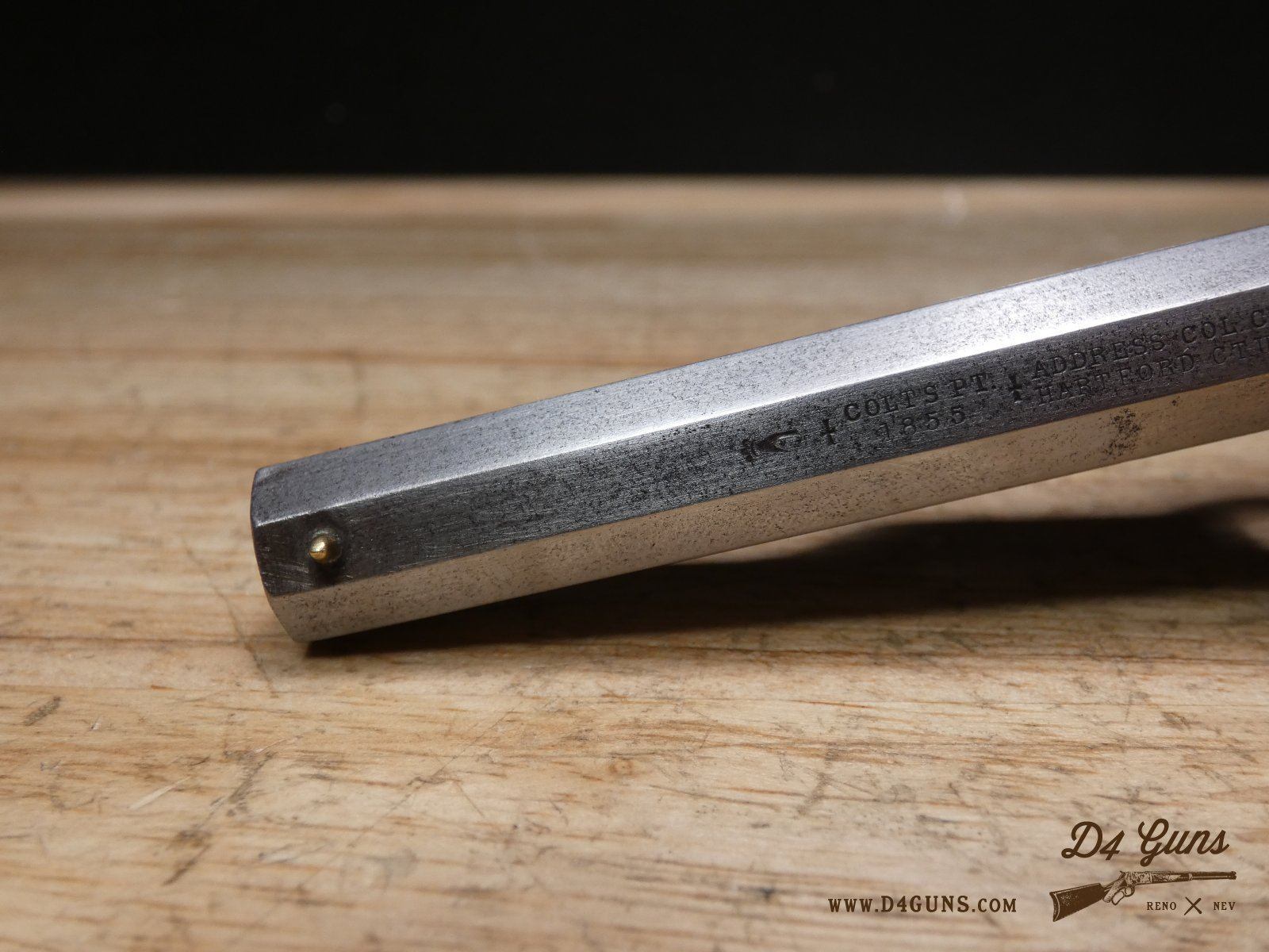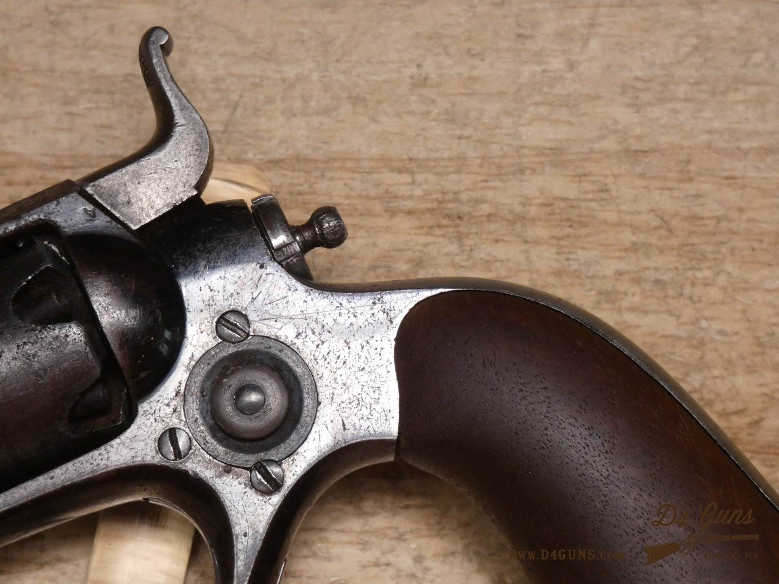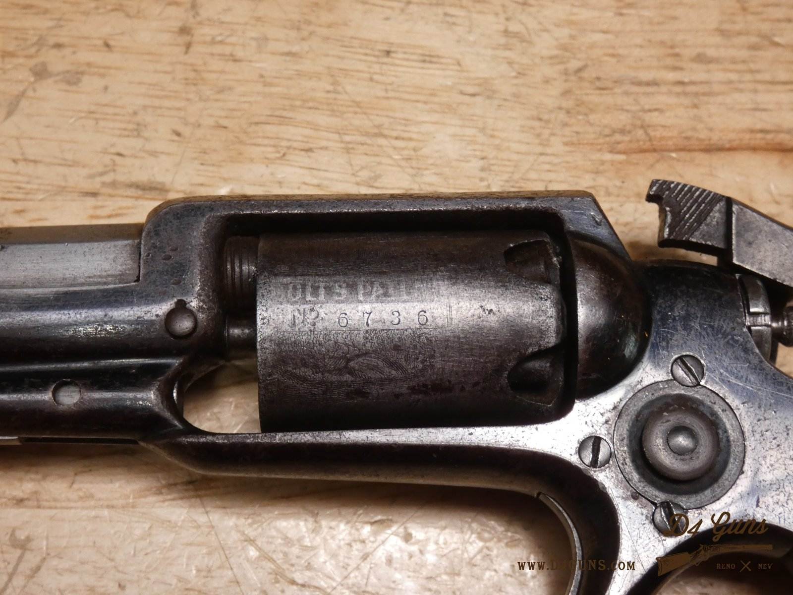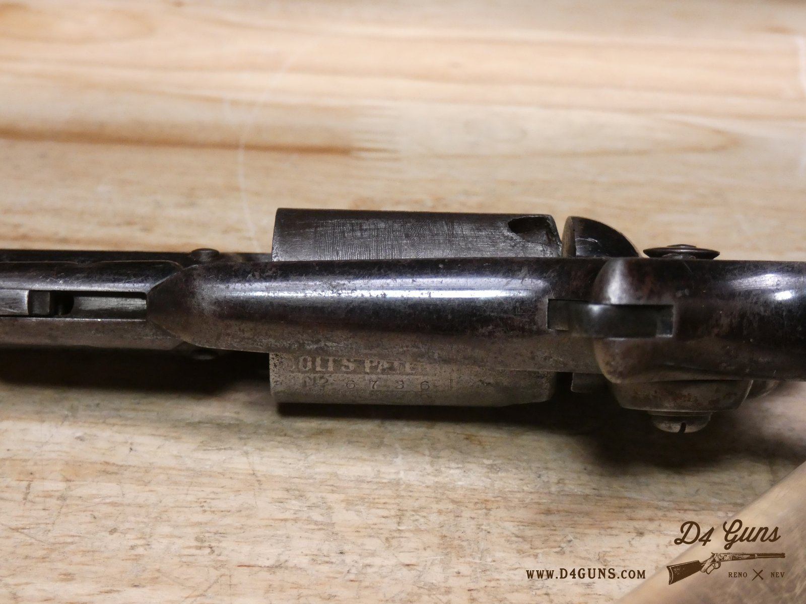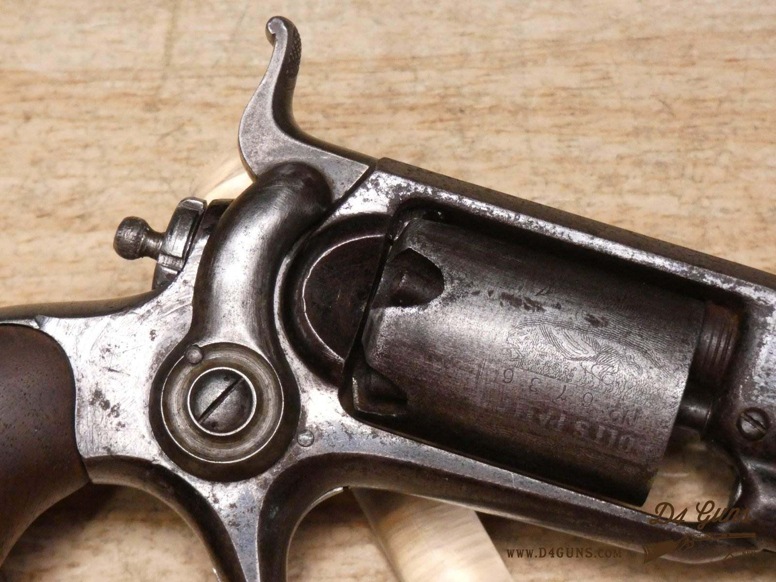The Model 2 was in .28 caliber and in serial range #476 – #25000; Hartford barrel address with pointing hand motif, octagon barrel 3 ½ inch long, cylinder with Cabin and Indian scene. Nipples integral with the cylinder. V2-E3 Barrel Length: 3 Bore condition: Fair
