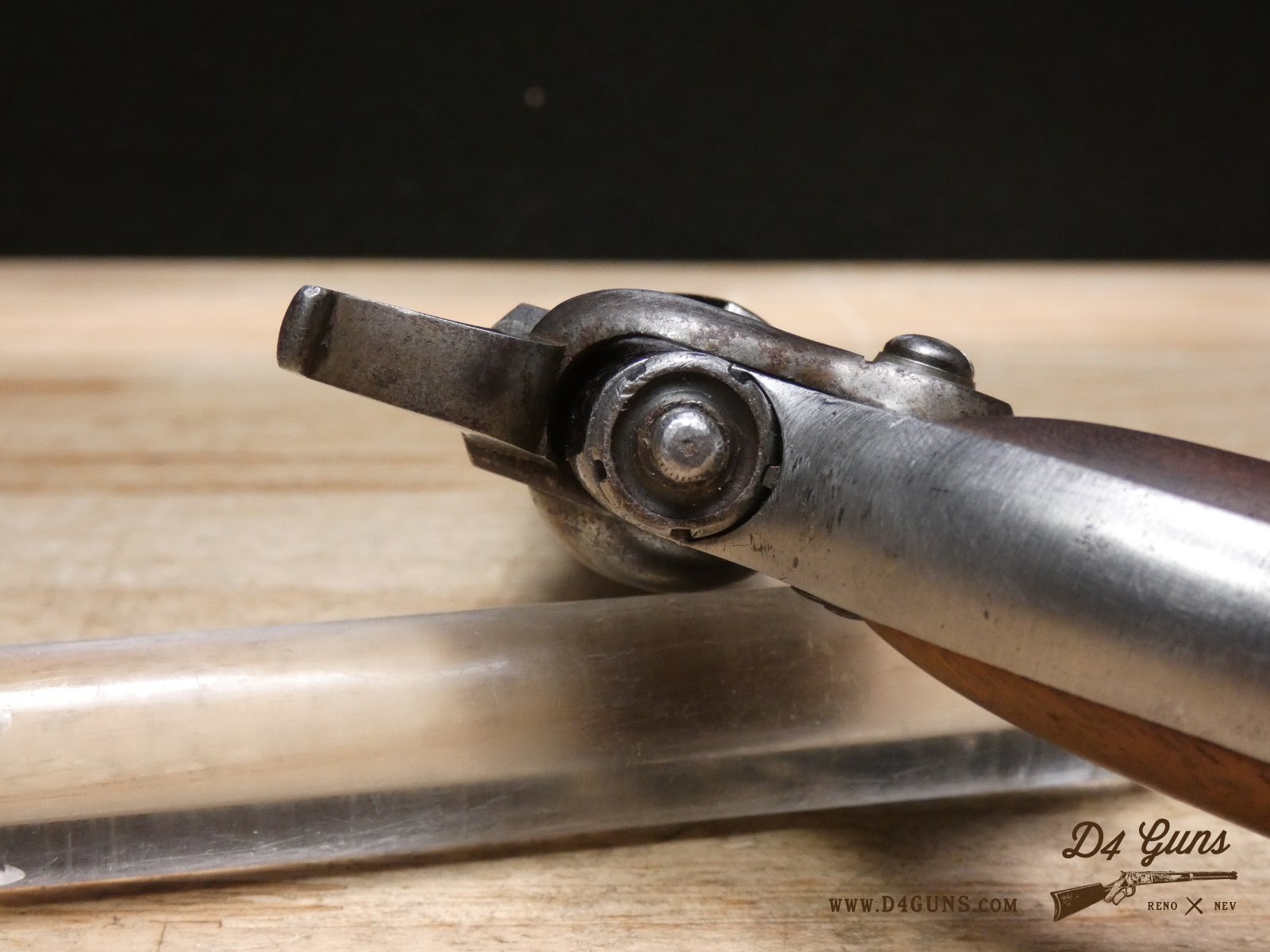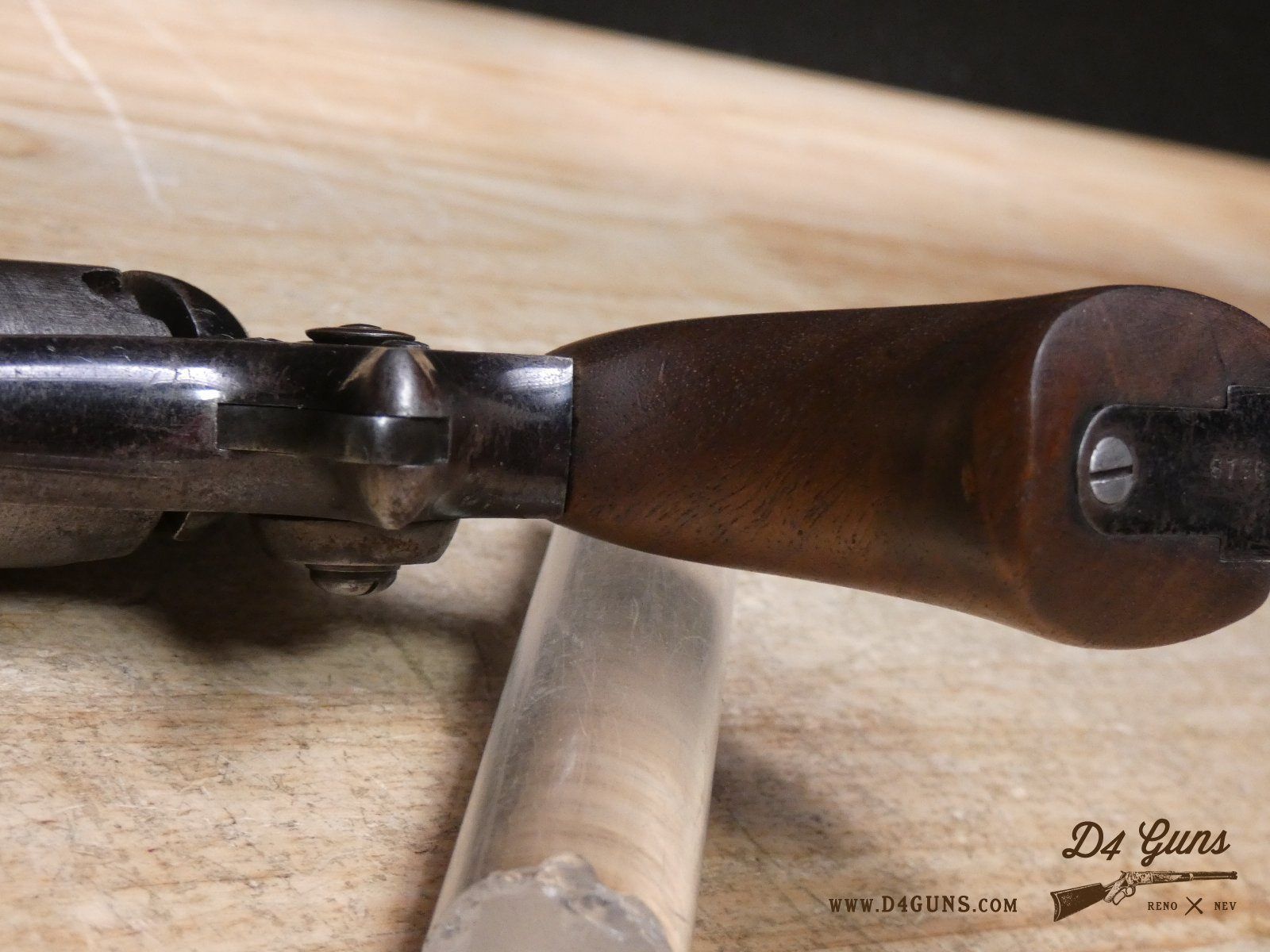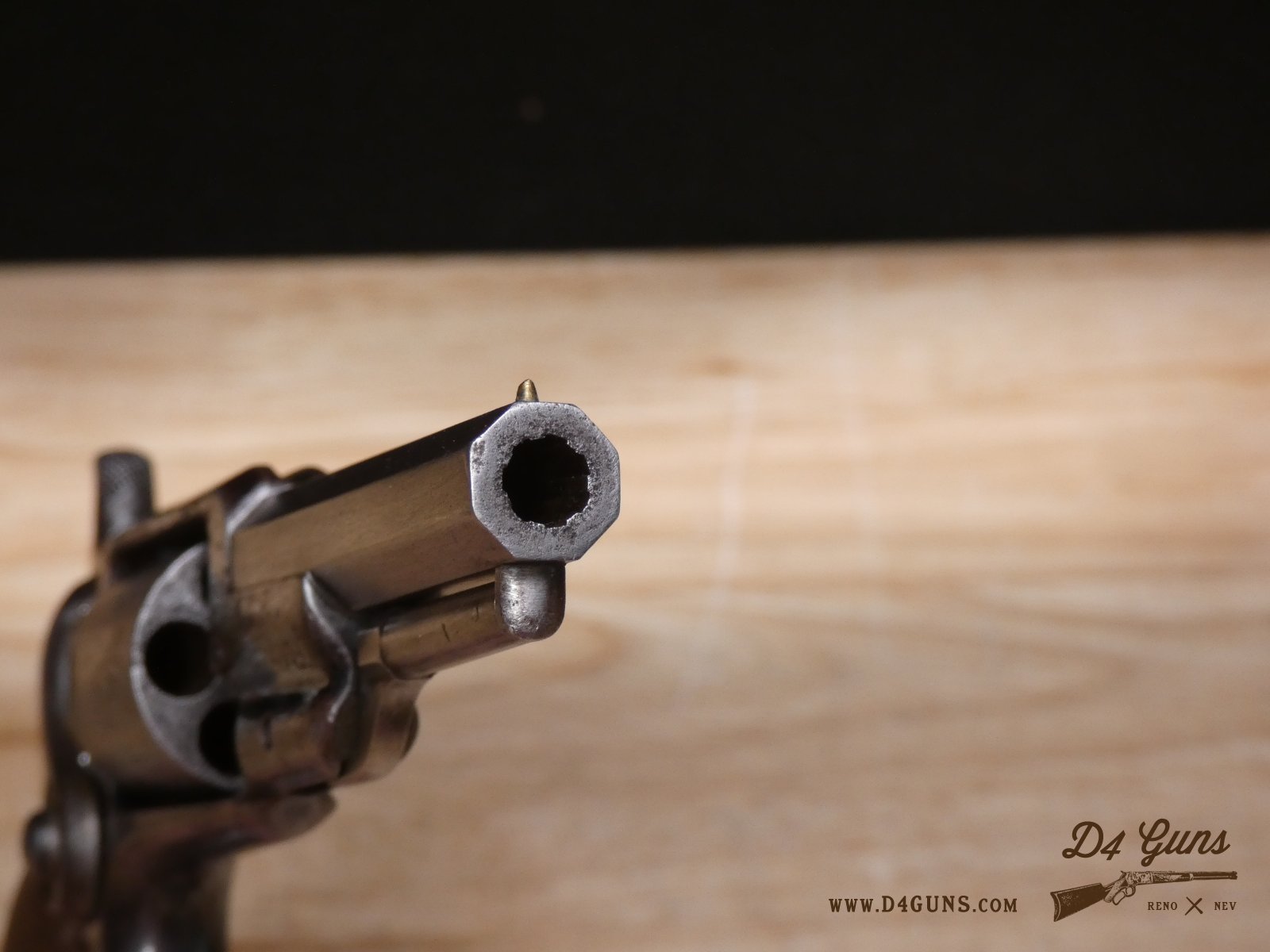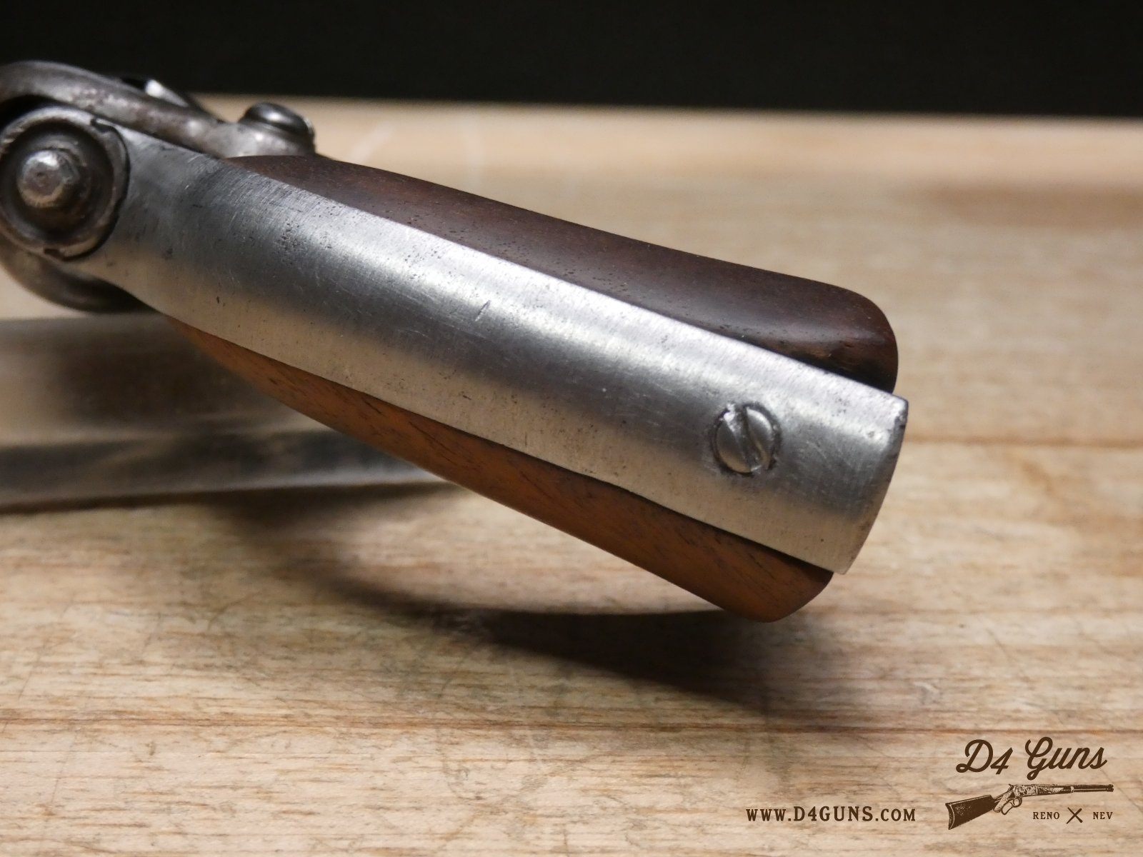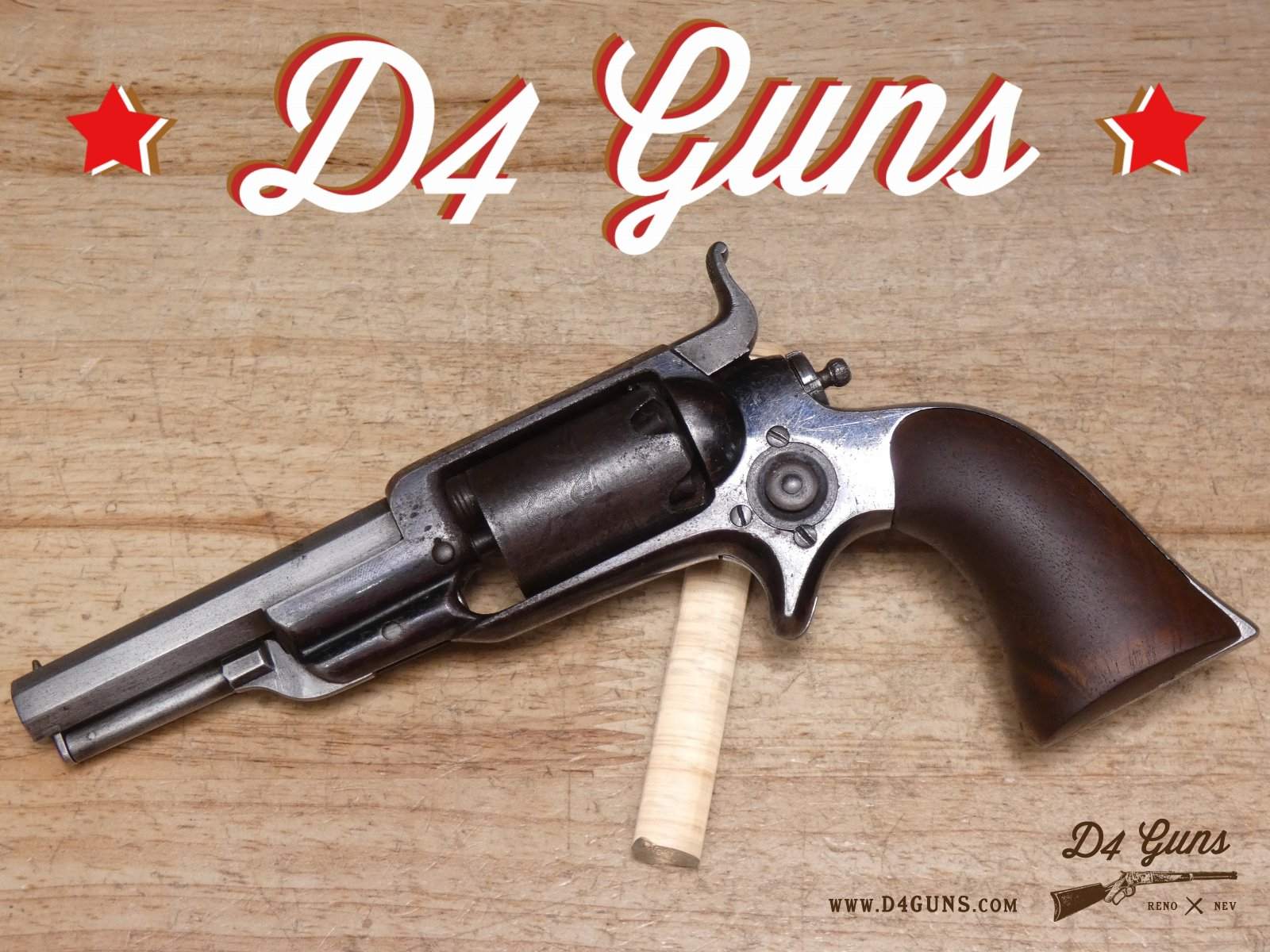 The Model 2 was in .28 caliber and in serial range #476 – #25000; Hartford barrel address with pointing hand motif, octagon barrel 3 ½ inch long, cylinder with Cabin and Indian scene. Nipples integral with the cylinder. V2-E3 Barrel Length: 3 Bore condition: Fair