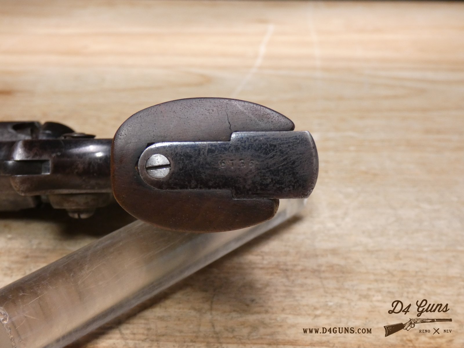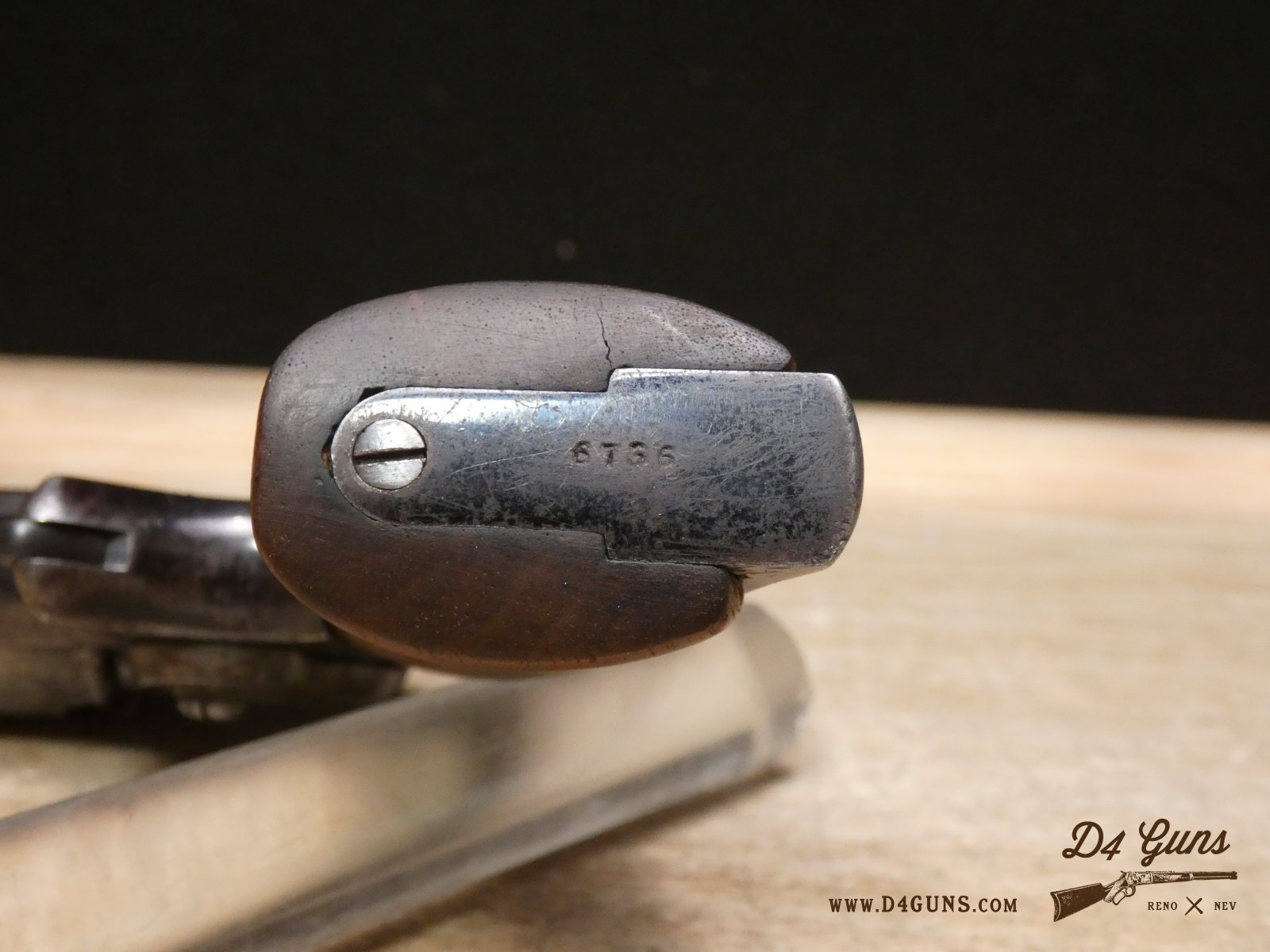 For sale is a Colt Model 1855 Sidehammer Model 2 in .28 Cal. Serial number- 6736. This revolver is in fairly good condition for a revolver manufactured in 1856. However, most of the blued finish has worn off, there is a crack in the bottom of the wood grip, and there is pitting in the bore. The hammer does cock and the trigger works but must be lined up properly. The "Cabin and Indian" engraving is on the cylinder and in good condition.