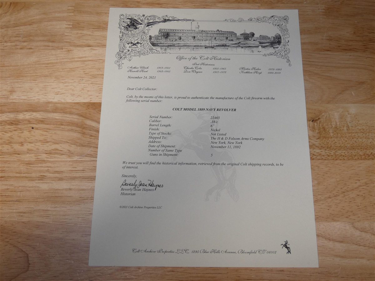 For sale is a Colt Model 1889 Navy double-action revolver in .38 Long Colt. Serial number- 22465. This revolver was manufactured in 1892 and comes with a factory letter. This revolver appears to be all original with a nickel finish. The Model 1889 and variants were adopted by the United States Military and used prior to the introduction of the M1911 pistol. The Model 1889 was also sold commercially as the Colt New Army and Navy. Approximately 5,000 Colt Model 1889 revolvers were produced. A Model 1889 revolver was recovered from the USS Maine after it exploded in Havana Harbor in 1898. It was presented to then Assistant Secretary of the Navy Theodore Roosevelt, who would later become President of the United States. Roosevelt brandished this pistol to rally his Rough Riders during the famed charge up San Juan Hill on July 1, 1898.