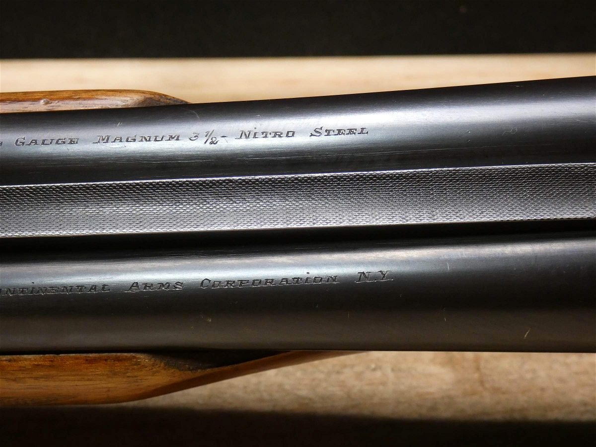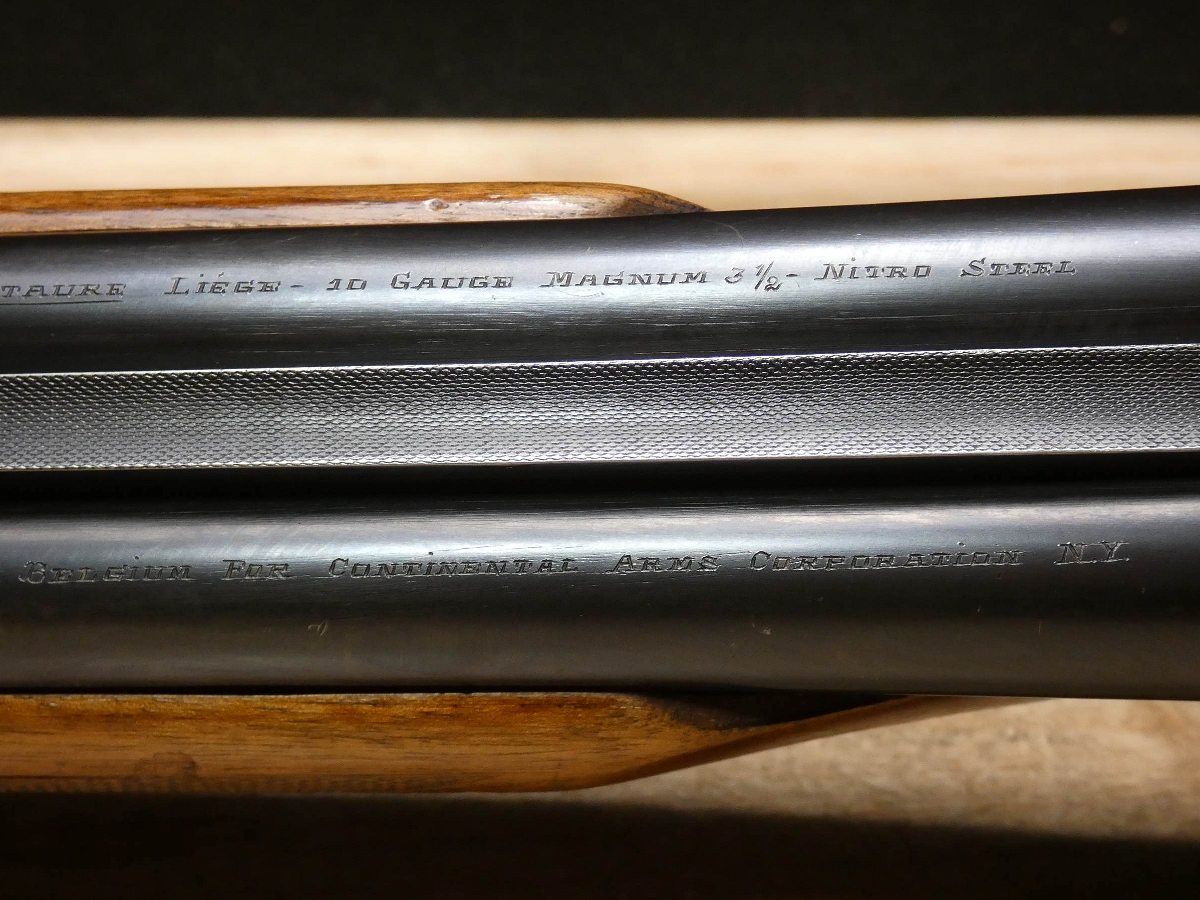 For sale is a Continental Arms Corporation Centaure Liege SxS side-by-side shotgun in 10ga. Serial number- 921. This shotgun has a 3 1/2" chamber but we are not certain about the choke of the barrels. Continental Arms Corporation imported guns from the mid-1950s to the mid-1970s, this specific one made in Belgium. V1-D2 Barrel Length: 32 Bore condition: Good