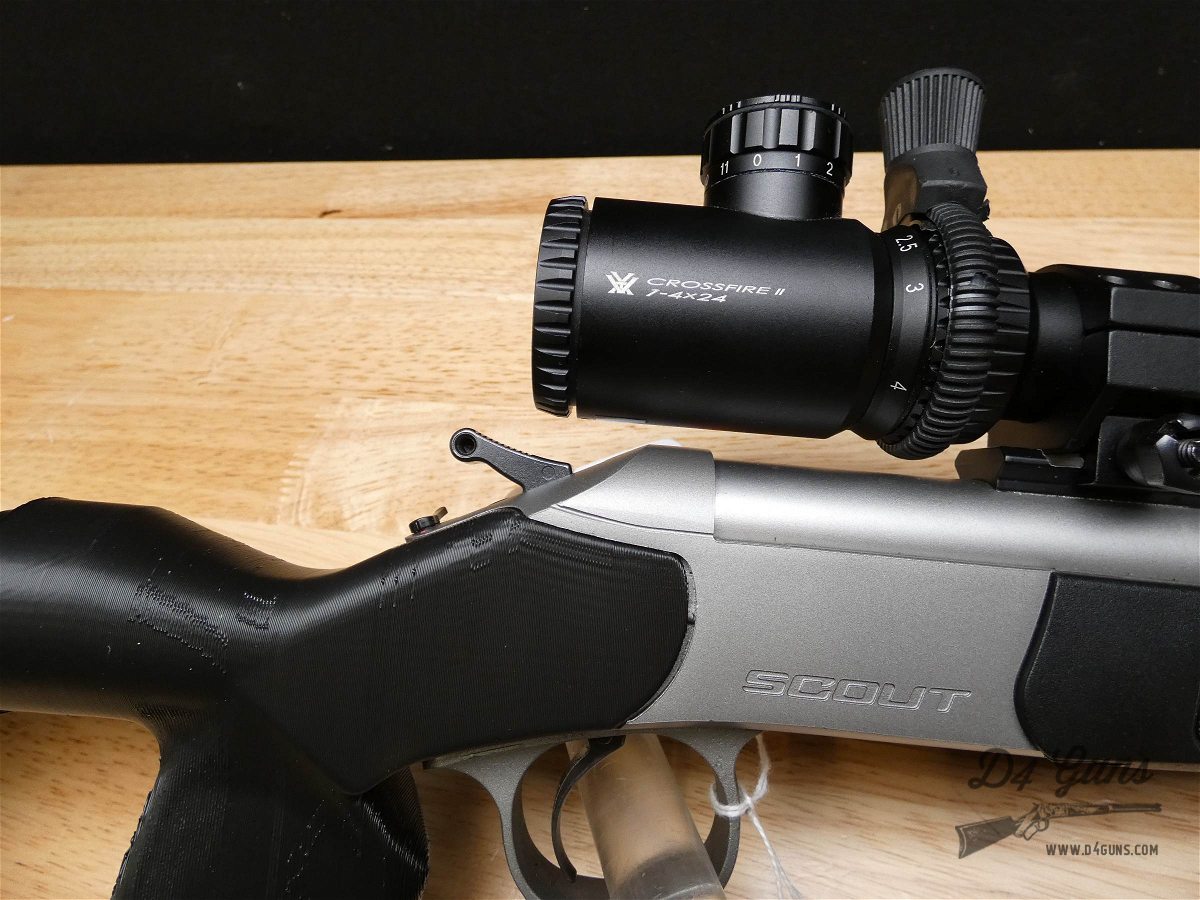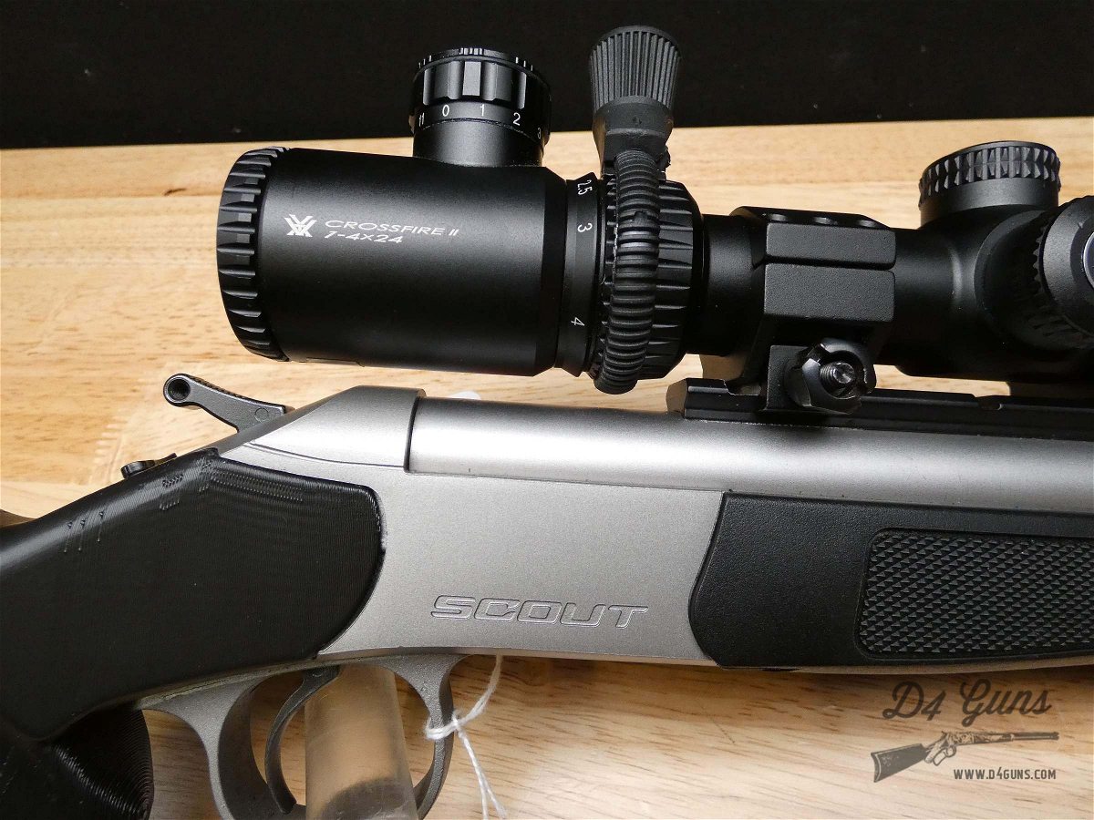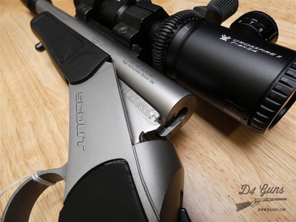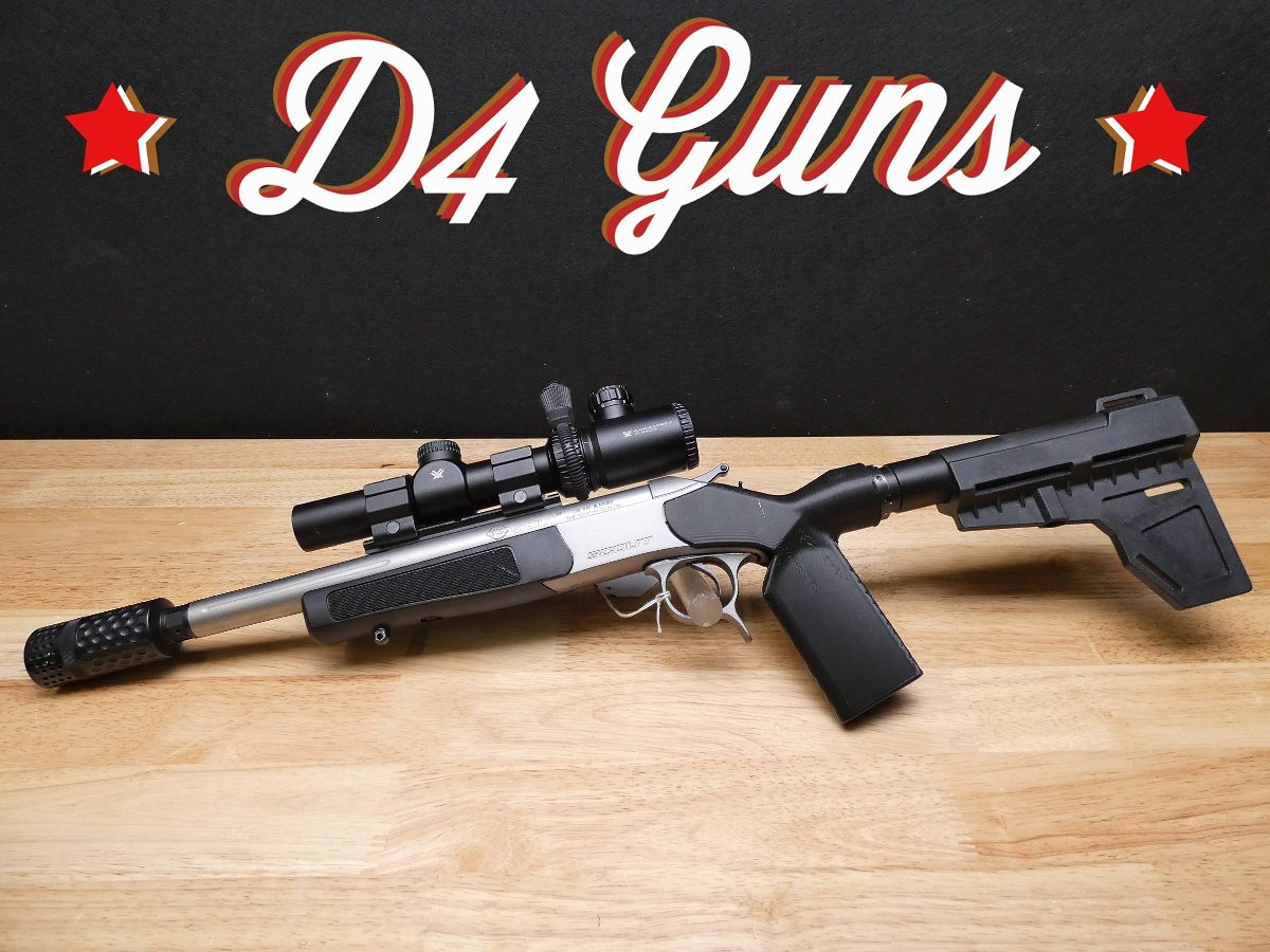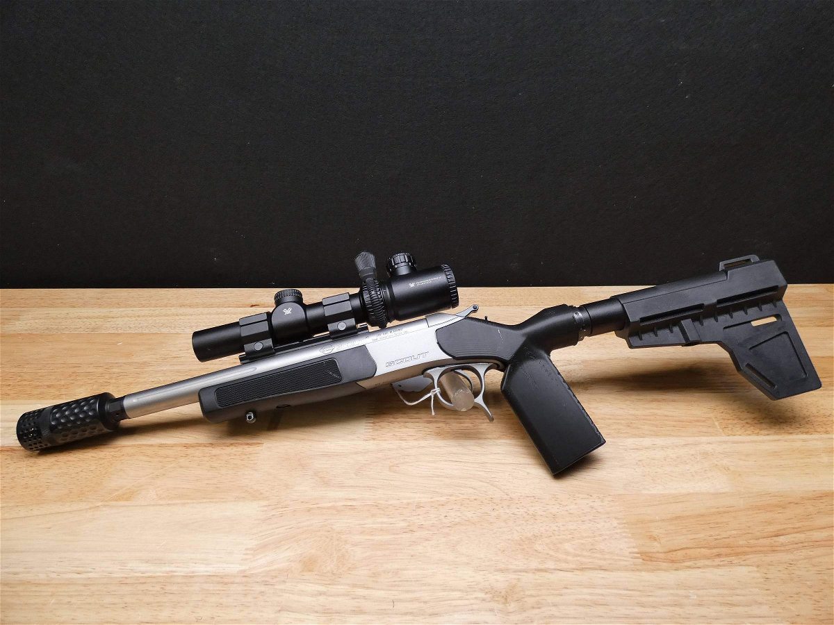 For sale is a CVA Scout V2 in .300 BLK. Serial number- 61-04-000715-15. This pistol is in great condition and comes with a Vortex crossfire II 1-4X24 Scope, a muzzle brake and a Blade Pistol Stabilizer. Please note that the grip/stock adapter appears to be 3-D printed. For the hunter who wants a high-quality single shot rifle, the SCOUT is the ideal choice. Its sleek, lightweight, and easy to operate design sets a new standard for affordable single shot hunting. It’s also a great stowaway emergency/survival gun for the camp, boat, or truck. V1-G1 Barrel Length: 11.5 Bore condition: Excellent
