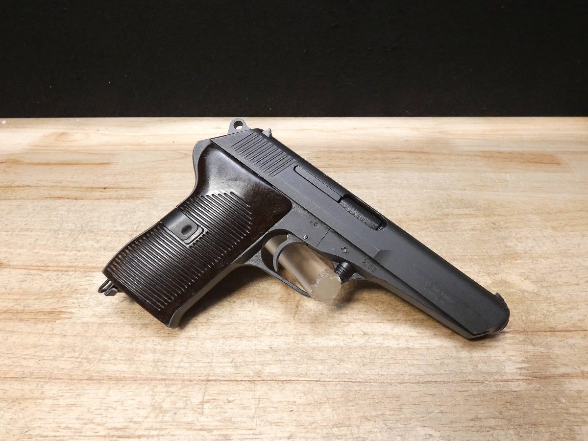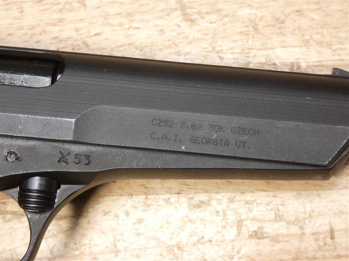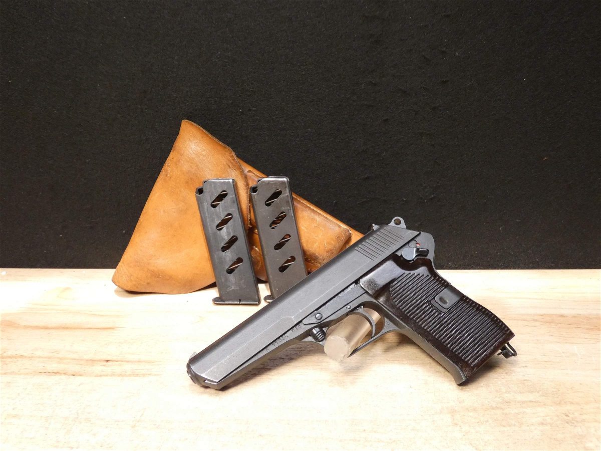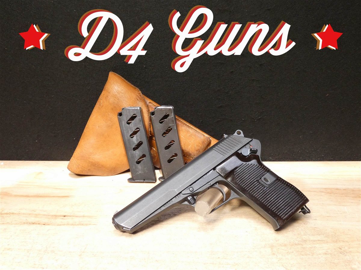 For sale is a CZ-52 semi-auto pistol in 7.62×25mm Tokarev. Serial number- K11556. Includes two magazines and a holster. The CZ 52 pistol is a roller-locked short recoil-operated, detachable box magazine-fed, single-action, semi-automatic pistol chambered for the 7.62×25mm Tokarev cartridge (the gun was originally designed for 9 mm Luger caliber but due to political pressures had to be redesigned for the Soviet then standard pistol cartridge). PLEASE NOTE: The barrel looks to have some pitting. V2-I3 Barrel Length: 4.5 Bore condition: Poor