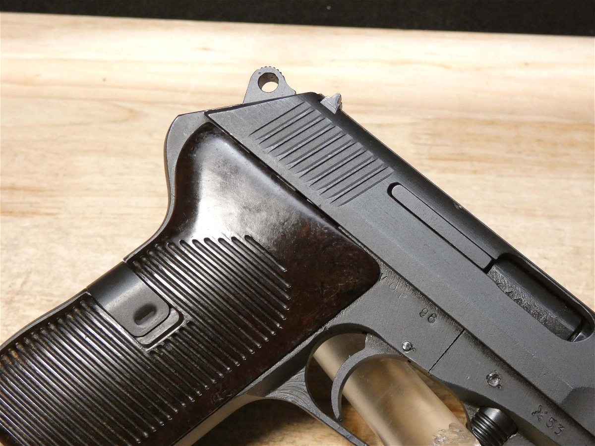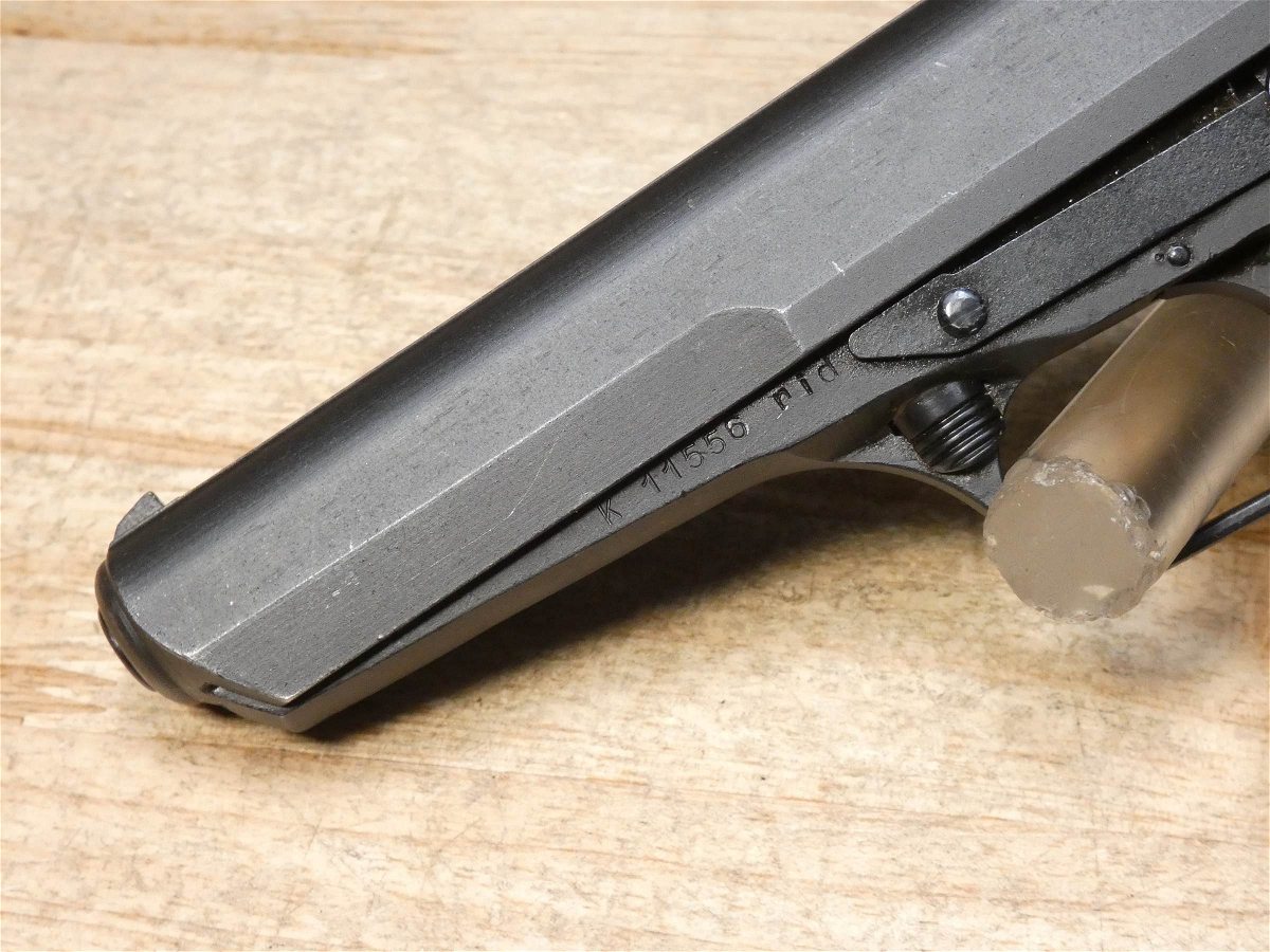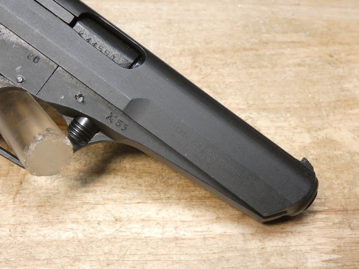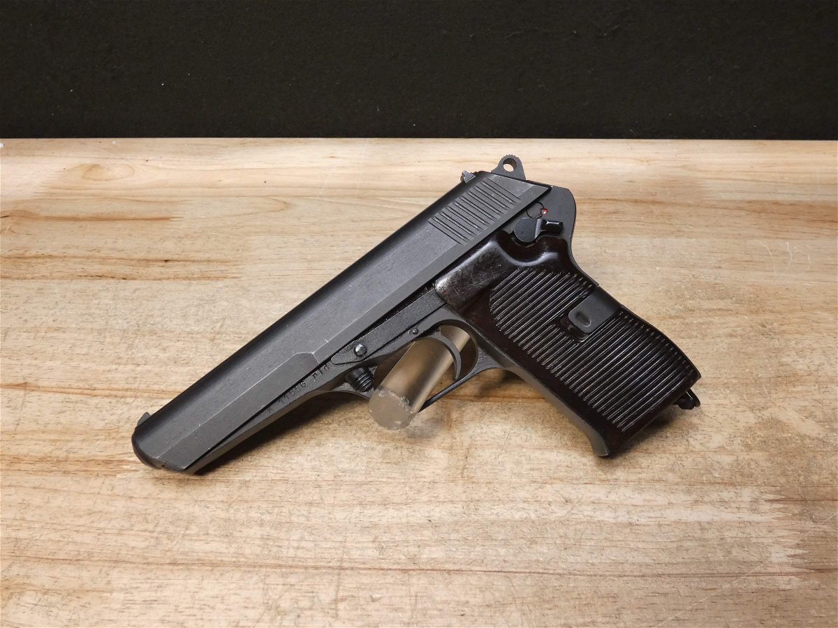 For sale is a CZ-52 semi-auto pistol in 7.62×25mm Tokarev. Serial number- K11556. Includes two magazines and a holster. The CZ 52 pistol is a roller-locked short recoil-operated, detachable box magazine-fed, single-action, semi-automatic pistol chambered for the 7.62×25mm Tokarev cartridge (the gun was originally designed for 9 mm Luger caliber but due to political pressures had to be redesigned for the Soviet then standard pistol cartridge). PLEASE NOTE: The barrel looks to have some pitting. V2-I3 Barrel Length: 4.5 Bore condition: Poor