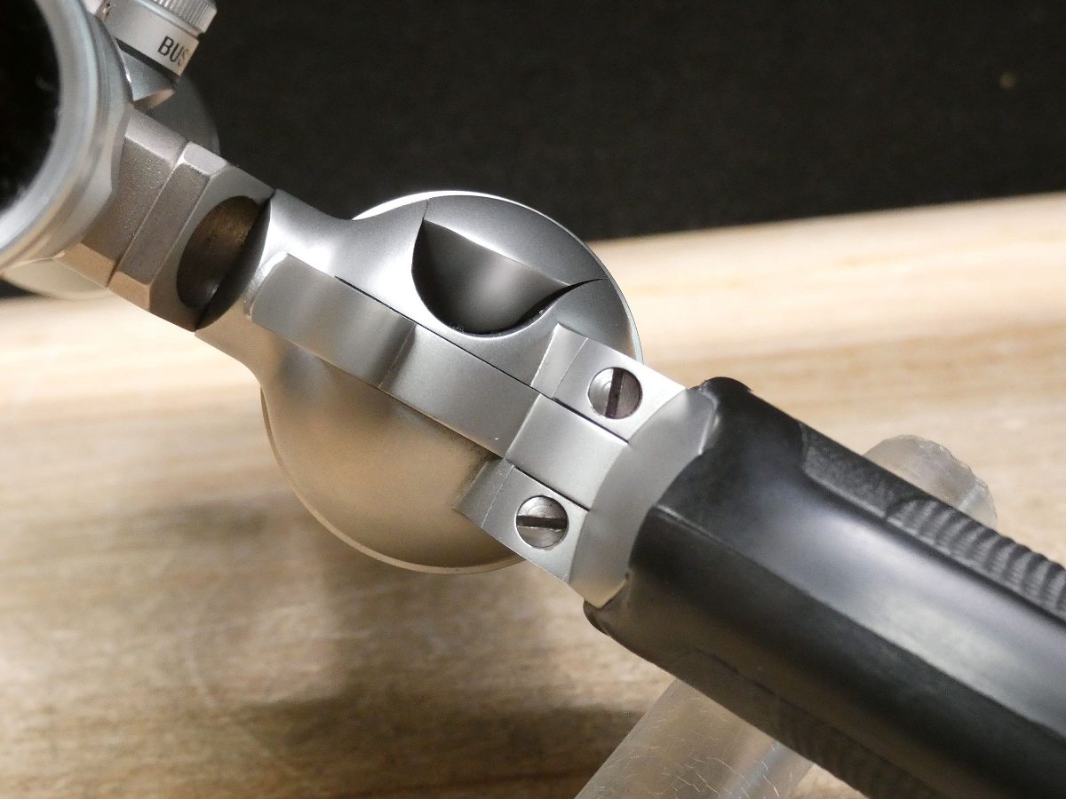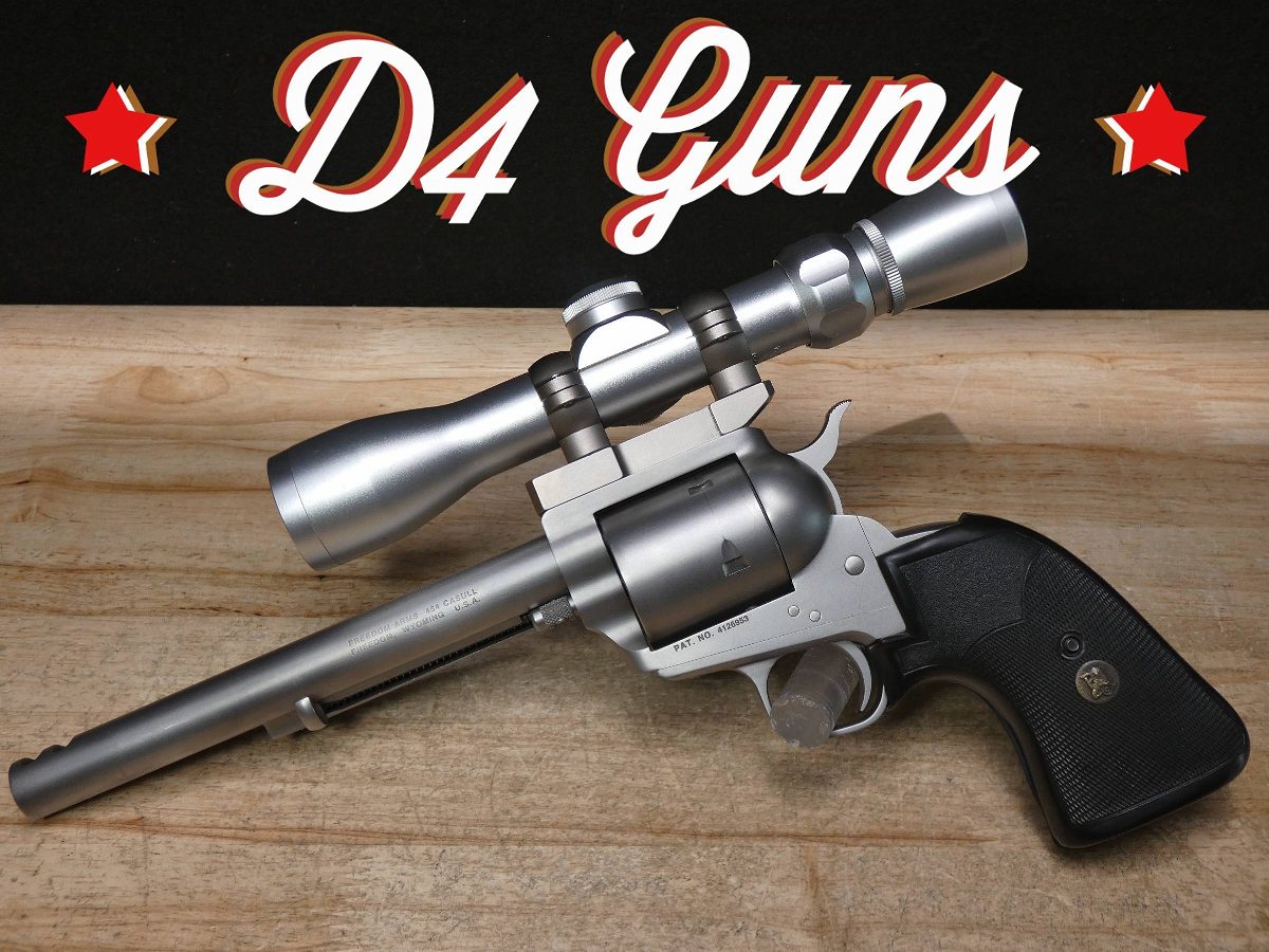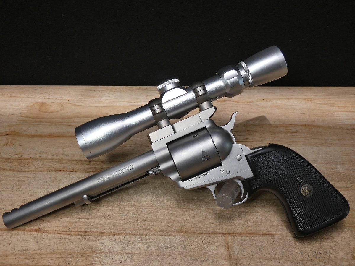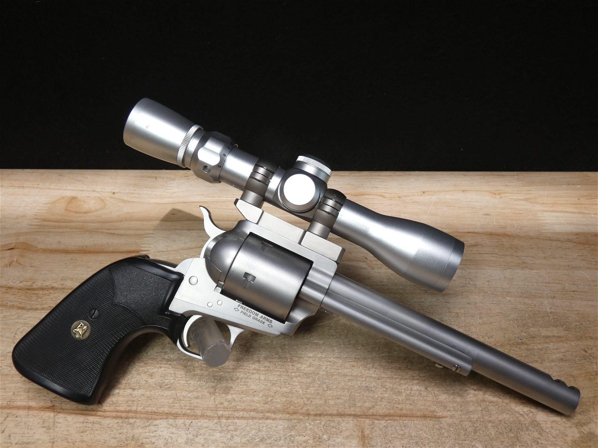 For sale is a Freedom Arms Model 83 Field Grade revolver in .454 Casull. Serial number- DF5111. This revolver is in great condition and comes equipped with a Bushnell 6x handgun scope with a duplex reticle and a Pachmayr rubber grip. Freedom Arms makes what are probably the highest quality single-action revolvers in the world, and this single action Model 83 Field Grade revolver is no exception. The action and trigger pull are exceptional. The lockup is quite literally solid, with no play whatsoever. The stainless finish with the unfluted cylinder is very appealing to the eye as well as functional in being nearly impervious to the elements. V2-G2 Barrel Length: 7.5 Bore condition: Good