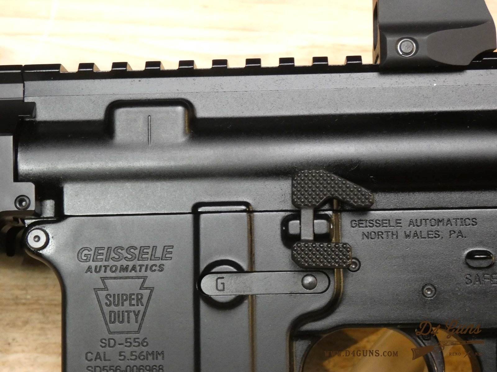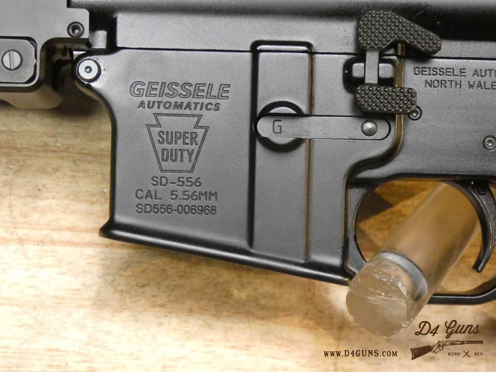 For sale is a Geissele Automatics SD-556 semi-automatic rifle in 5.56 NATO. Serial number- SD556-006968. This rifle is in good condition and comes with a 30-round magazine and is equipped with Daniel Defense iron sights. The Super Duty Rifle features the latest in weapon technology available exclusively from Geissele Automatics. This 16" rifle chambered in 5.56mm features a Nanoweapon coated Surefire Closed-Tine Flash Hider mounted to an in-house 16" durable black oxide coated, Cold Hammer Forge, Chrome Lined, 1-7 twist Geissele barrel. V2-A5 Barrel Length: 16 Bore condition: Excellent