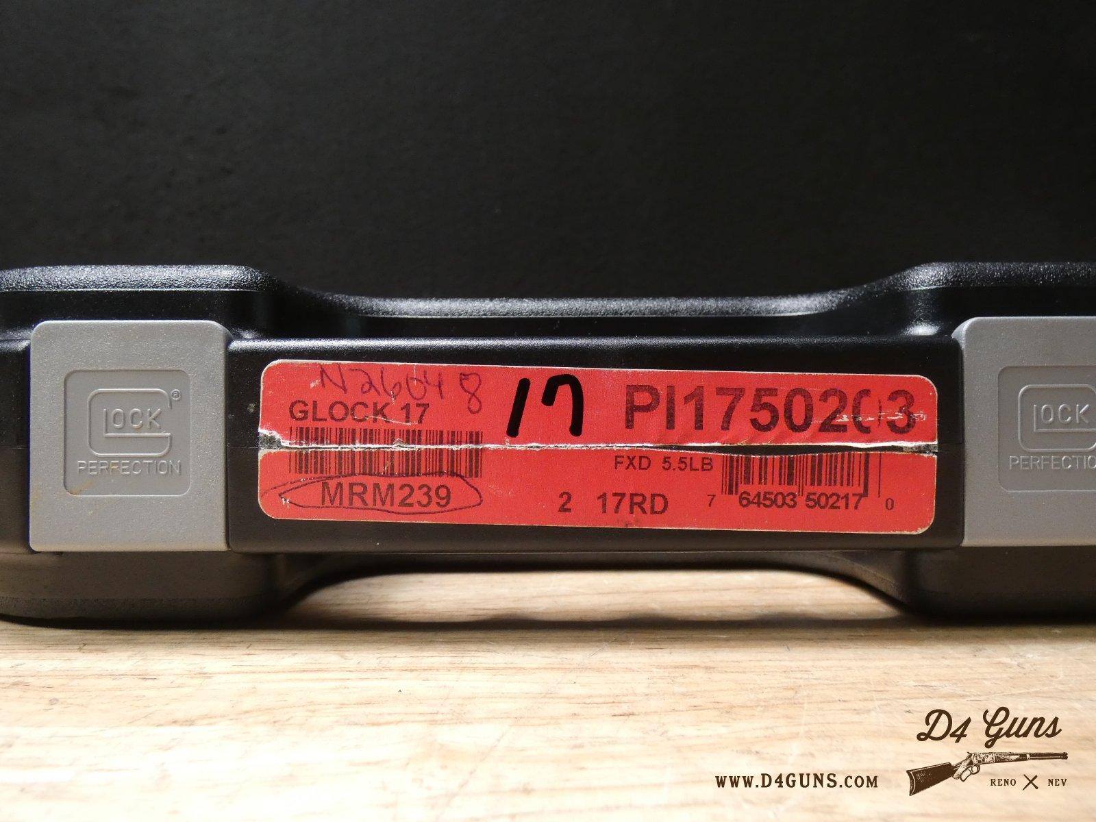 For sale is a Glock 17 Gen3 semi-automatic pistol in 9mm. Serial number – MRM239. This pistol is in great condition and comes with the original case, manual, and two 10-round magazines, and two 17-round magazines. Designed for professionals, the Glock 17 is trusted by law enforcement officers and military personnel around the globe because of its unsurpassed reliability. V2-I1 Barrel Length: 4.5 Bore condition: Good