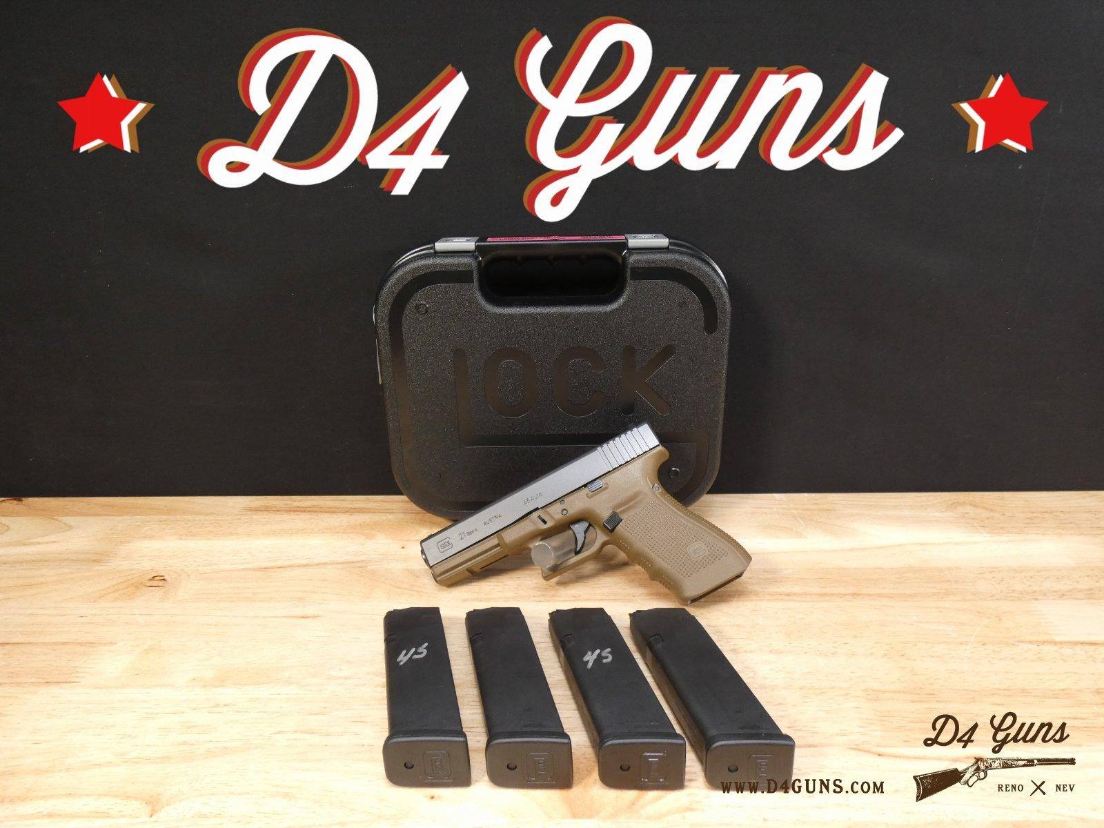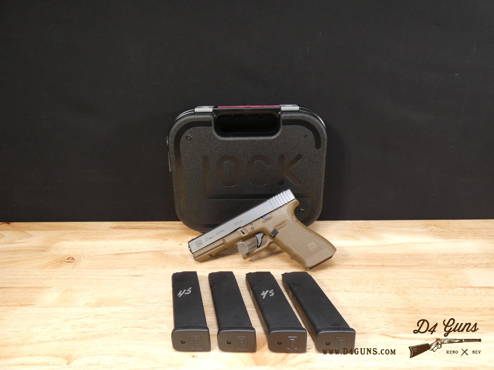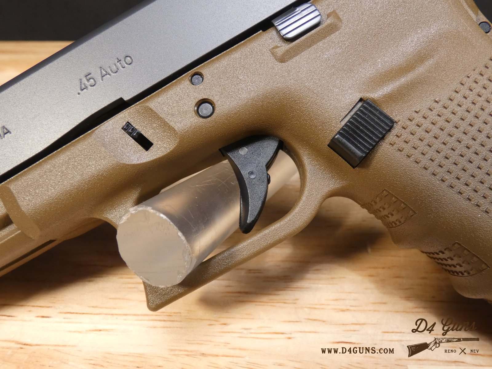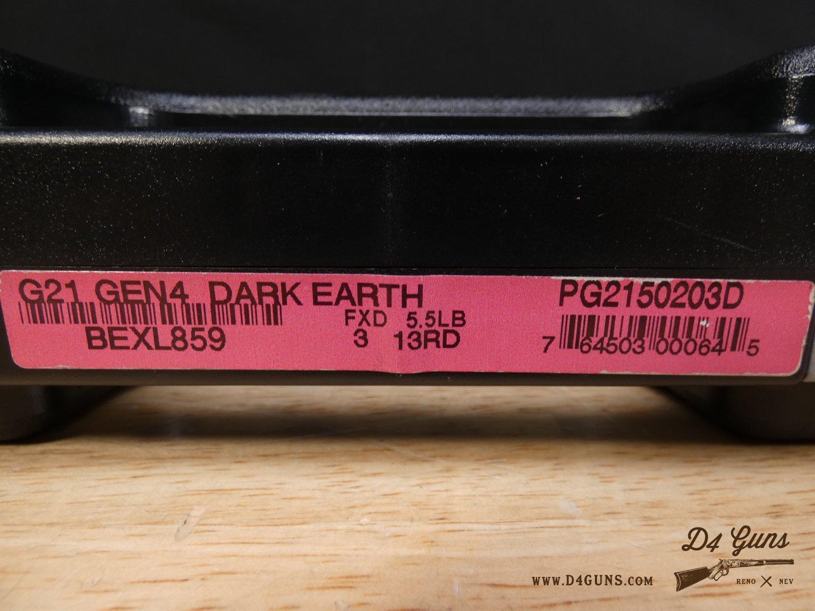 For sale is a Glock 21 Gen 4 semi automatic pistol in .45 ACP. Serial number- BEXL859. This G21 is in excellent condition and features a flat dark earth finish. Comes with four 13 round magazines and the original hardcase. Glock pistols incorporate a number of features intended to enhance reliability in adverse conditions, such as utilizing advanced metal coatings, slide guides instead of true frame rails, and an unusual cocking mechanism wherein the trigger is partially responsible for cocking the striker. For maintenance, the pistol disassembles into five main groups: the barrel, slide, frame, magazine, and recoil-spring assembly. Add this classic pistol to your collection and feel the power of owning a Glock 21, bid before time runs out. V2-E1 Barrel Length: 4.5 Bore condition: Excellent