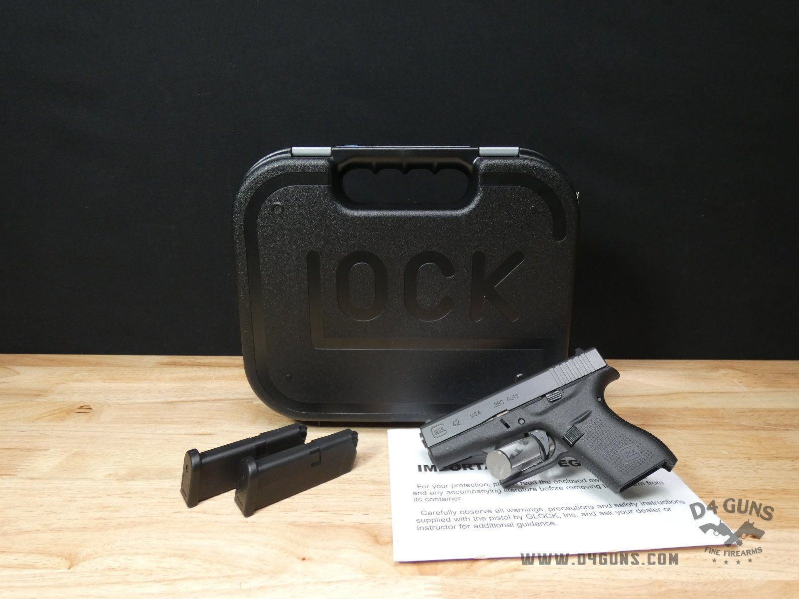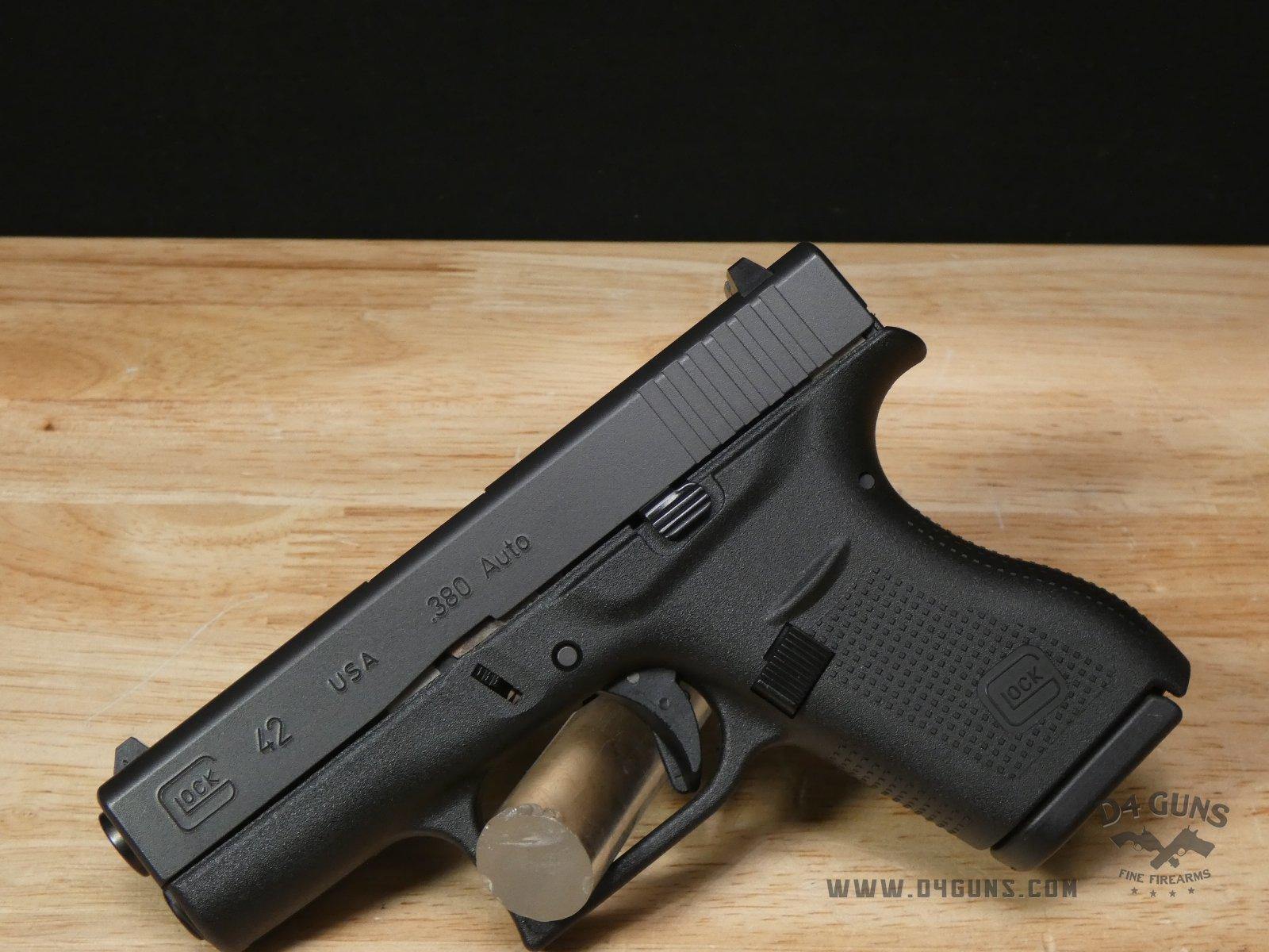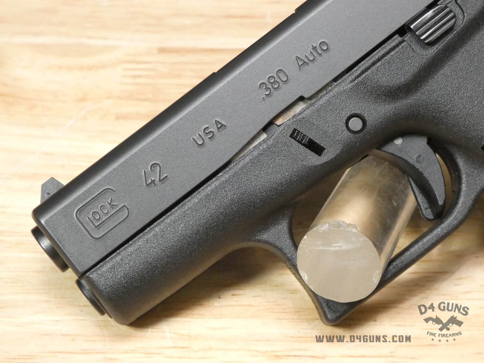 Ready for a new home is a Glock 42 semi-automatic pistol in 380 ACP. Serial number-ACWH219. This pistol is in great condition and comes with the case, paperwork, and 2 magazines. Built-in the U.S. and released in 2014, the G42 is Glock’s smallest pistol to date. This striker-fired, subcompact pistol is truly the "baby" of all Glocks. With an empty weight of under 14 ounces and ultra-compact frame size, the G42 is truly a unique carry option. Own your G42 today before this pistol is gone. V2-D3 Barrel Length: 3.25 Bore condition: Excellent