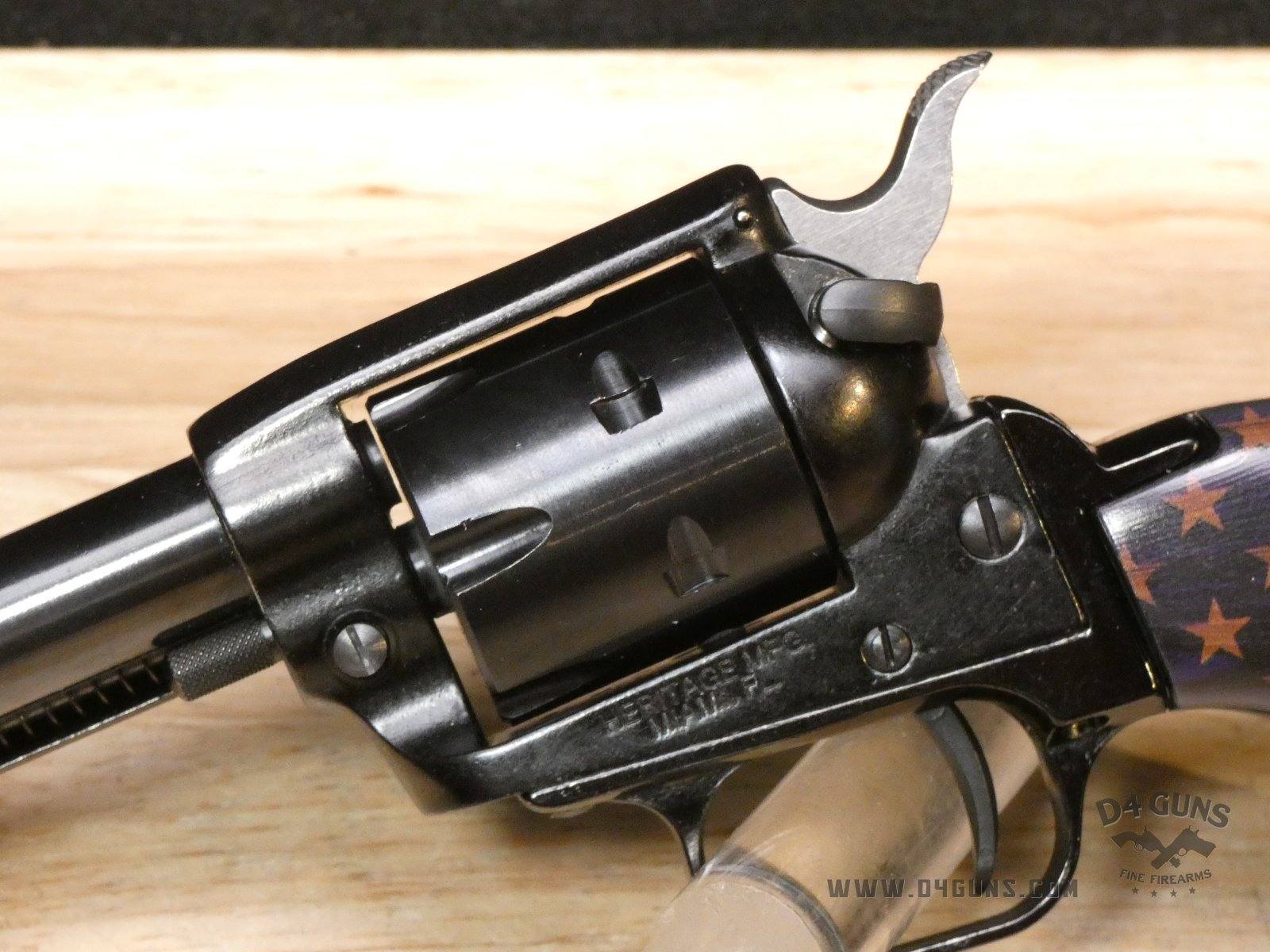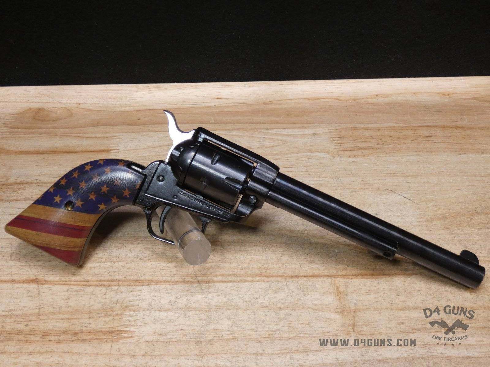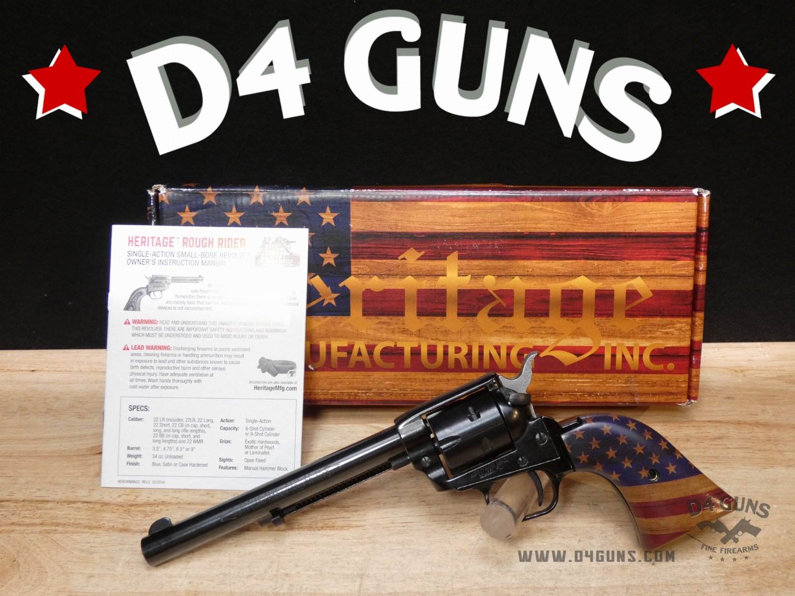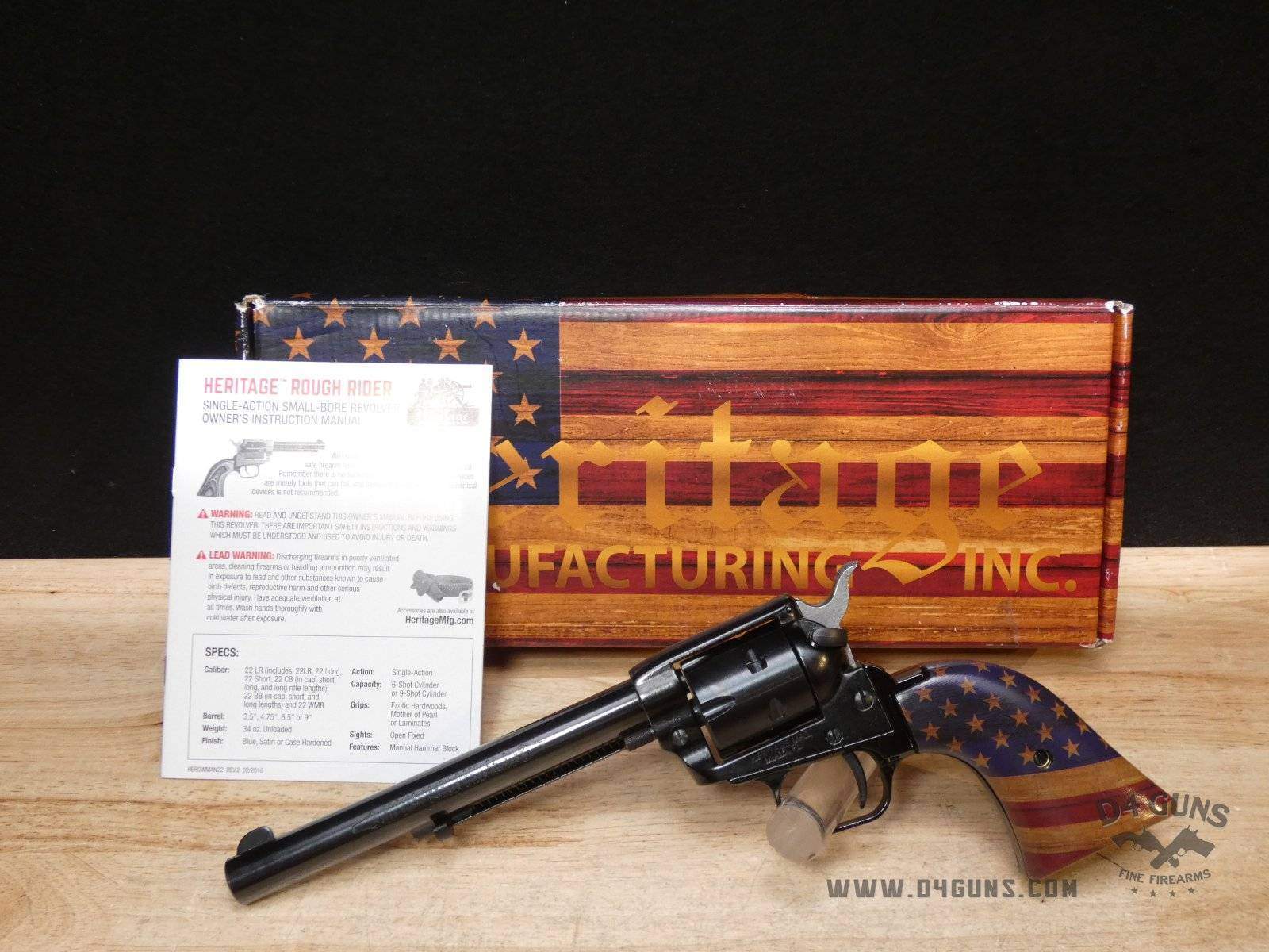 Up for grabs is a Heritage Rough Rider revolver in .22 LR . Serial number- Y72749. It includes the original box. USA American Flag Grips! Born of the traditions of the Old West, Heritage's Rough Rider Single-Action Rimfire Revolvers maintain much of the look and feel of the legendary Single-Action Army revolver in scaled-down versions. Cylinders are manufactured using precision machinery to assure accuracy and reliability. V2-F2 Barrel Length: 6.5 Bore condition: Excellent