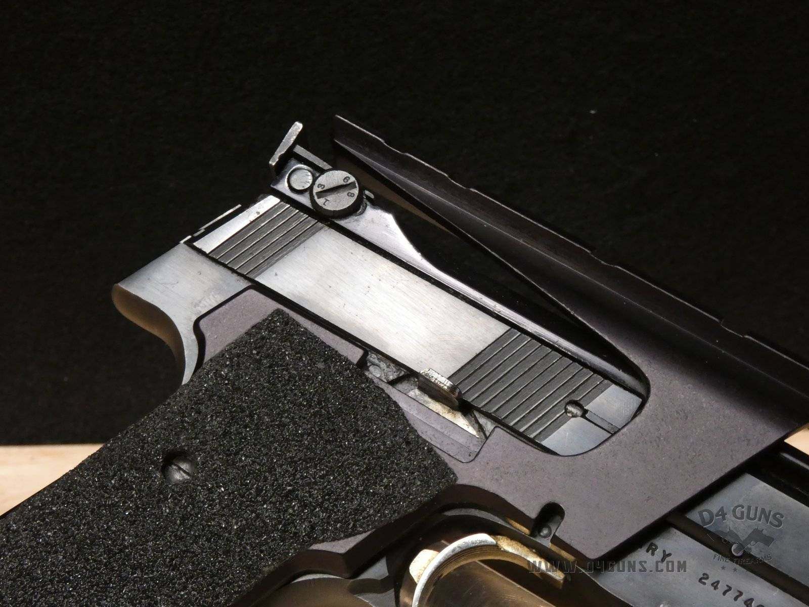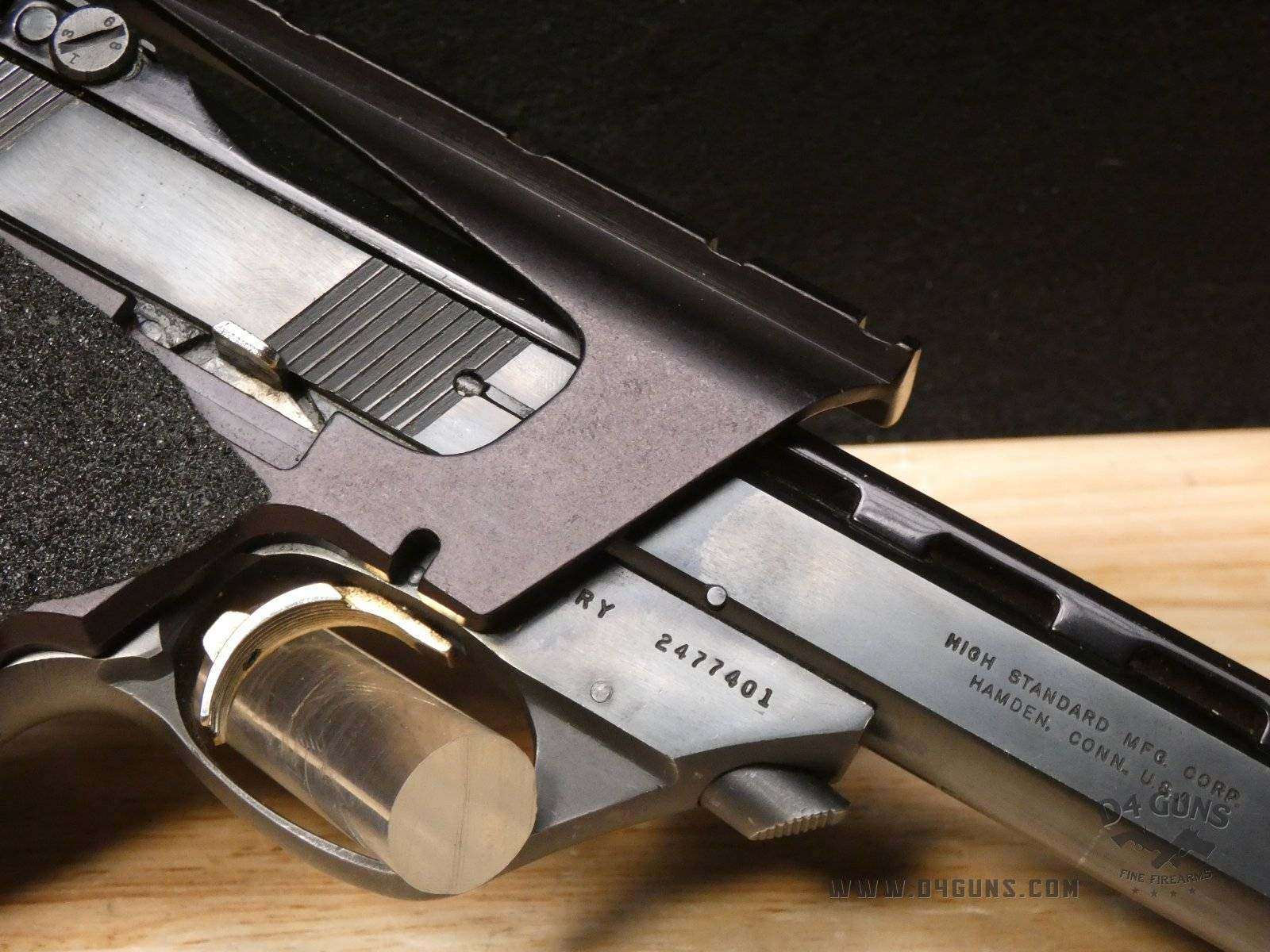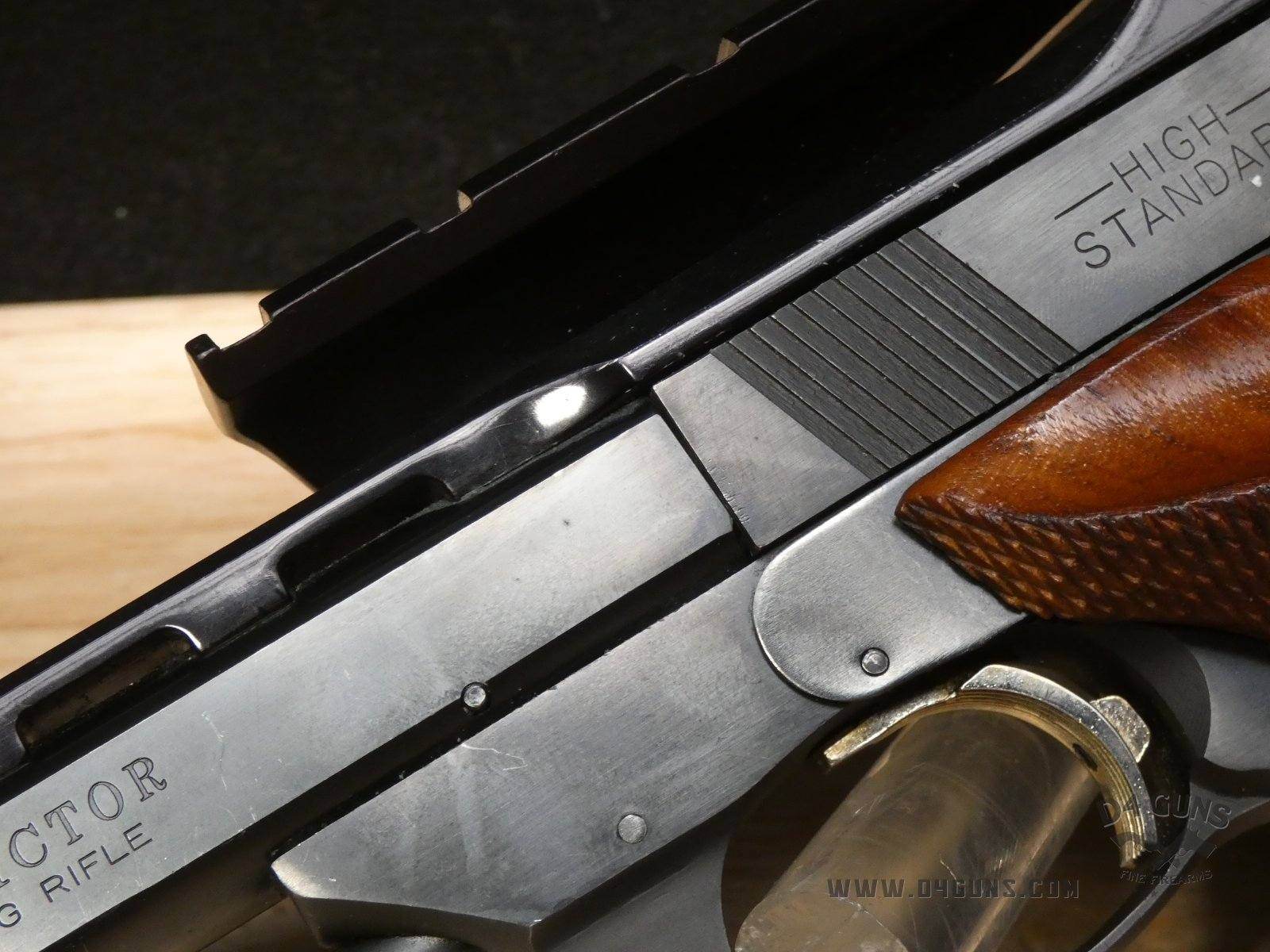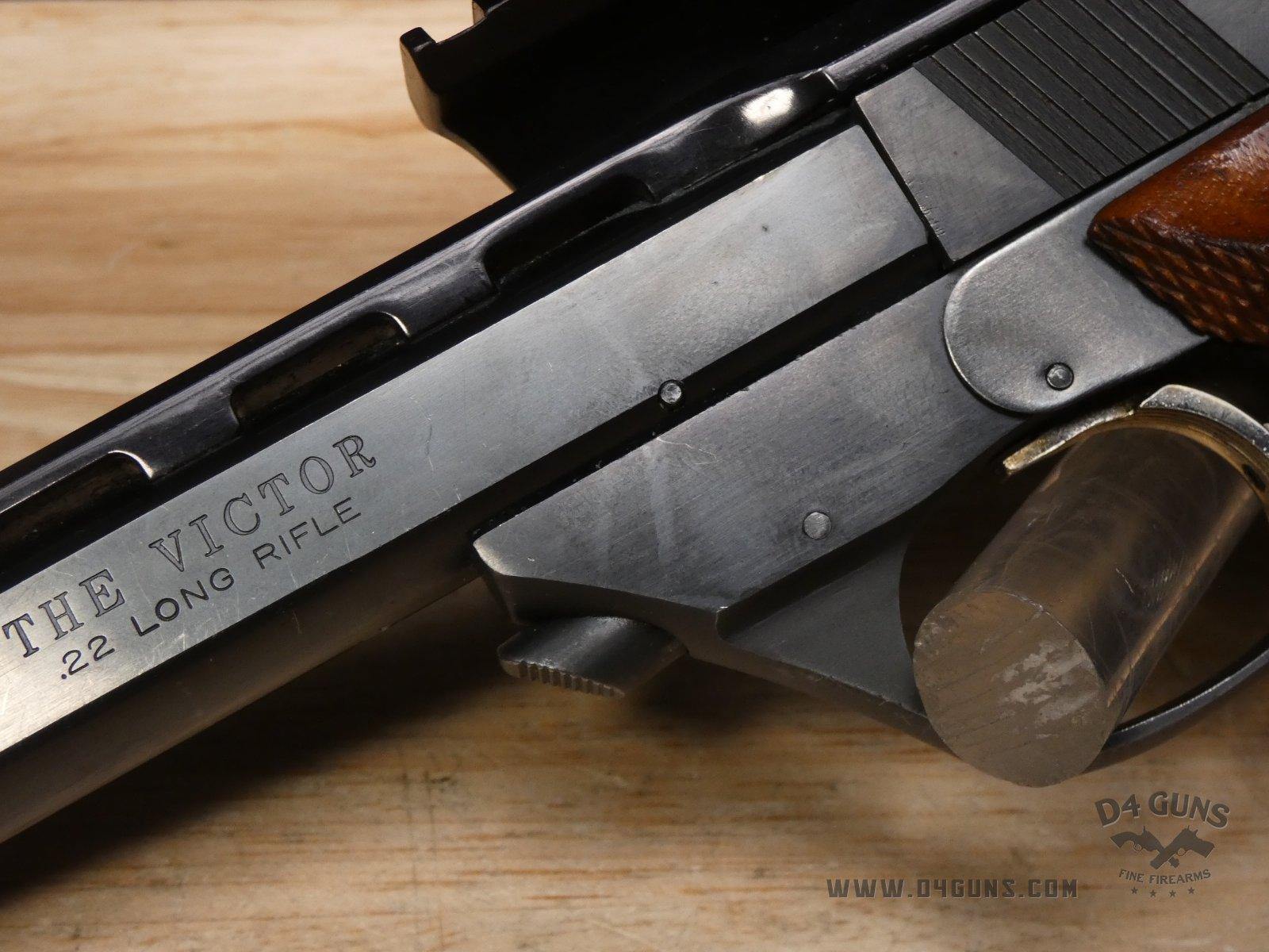 Up for grabs is a High Standard The Victor semi-automatic pistol in .22LR. Serial number-2477401. This pistol is in great condition and comes with (2) magazines. Features an optic rail. Left side of the grip is original and the right is replaced with a stippled flat grip, gold trigger, adjustable rear sight and vented rib slide. V2-H2 Barrel Length: 4.5 Bore condition: Good
