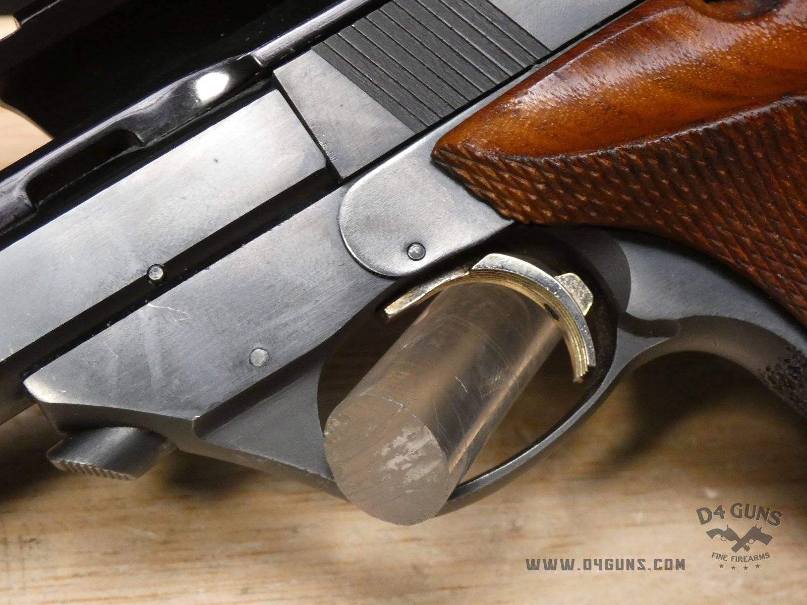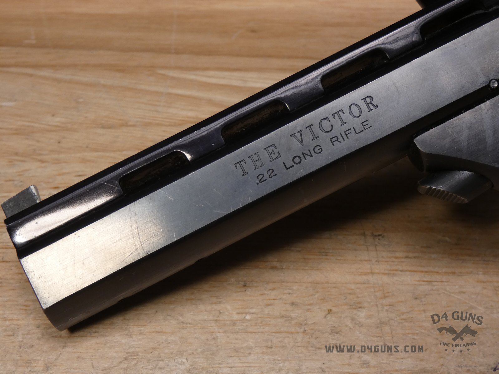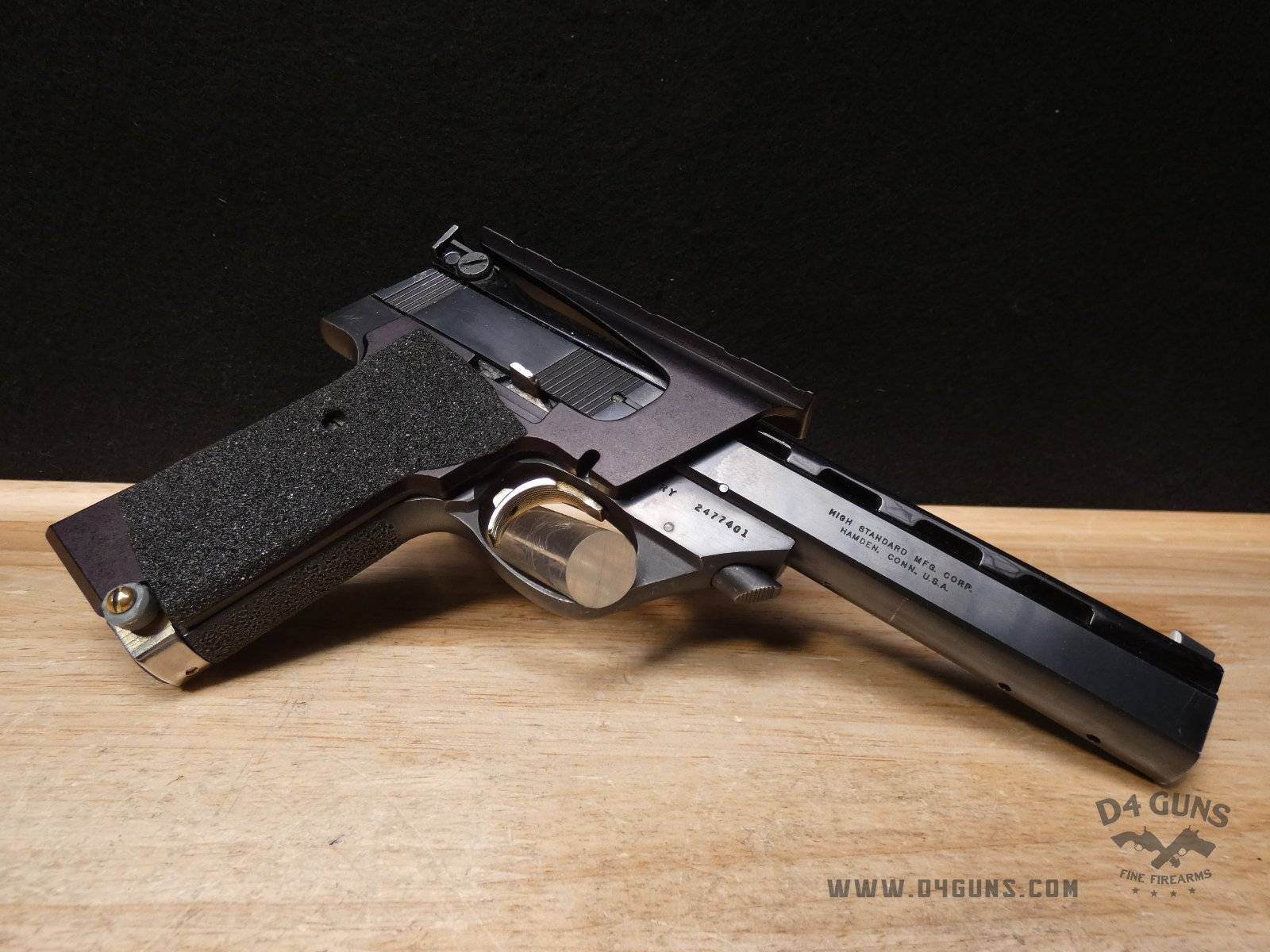Up for grabs is a High Standard The Victor semi-automatic pistol in .22LR. Serial number-2477401. This pistol is in great condition and comes with (2) magazines. Features an optic rail. Left side of the grip is original and the right is replaced with a stippled flat grip, gold trigger, adjustable rear sight and vented rib slide. V2-H2 Barrel Length: 4.5 Bore condition: Good