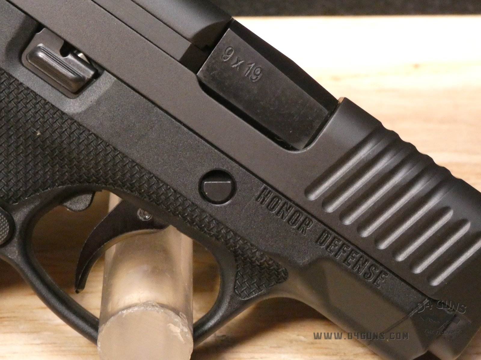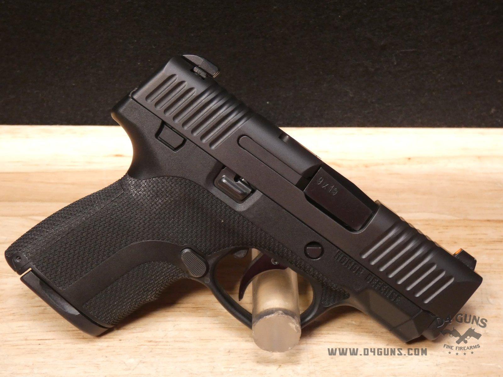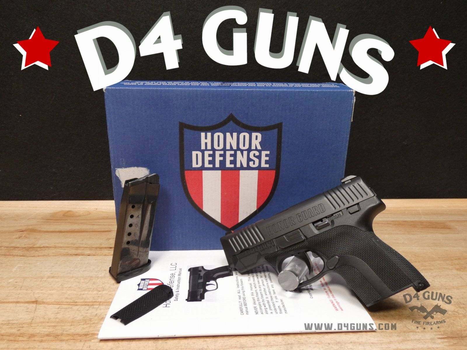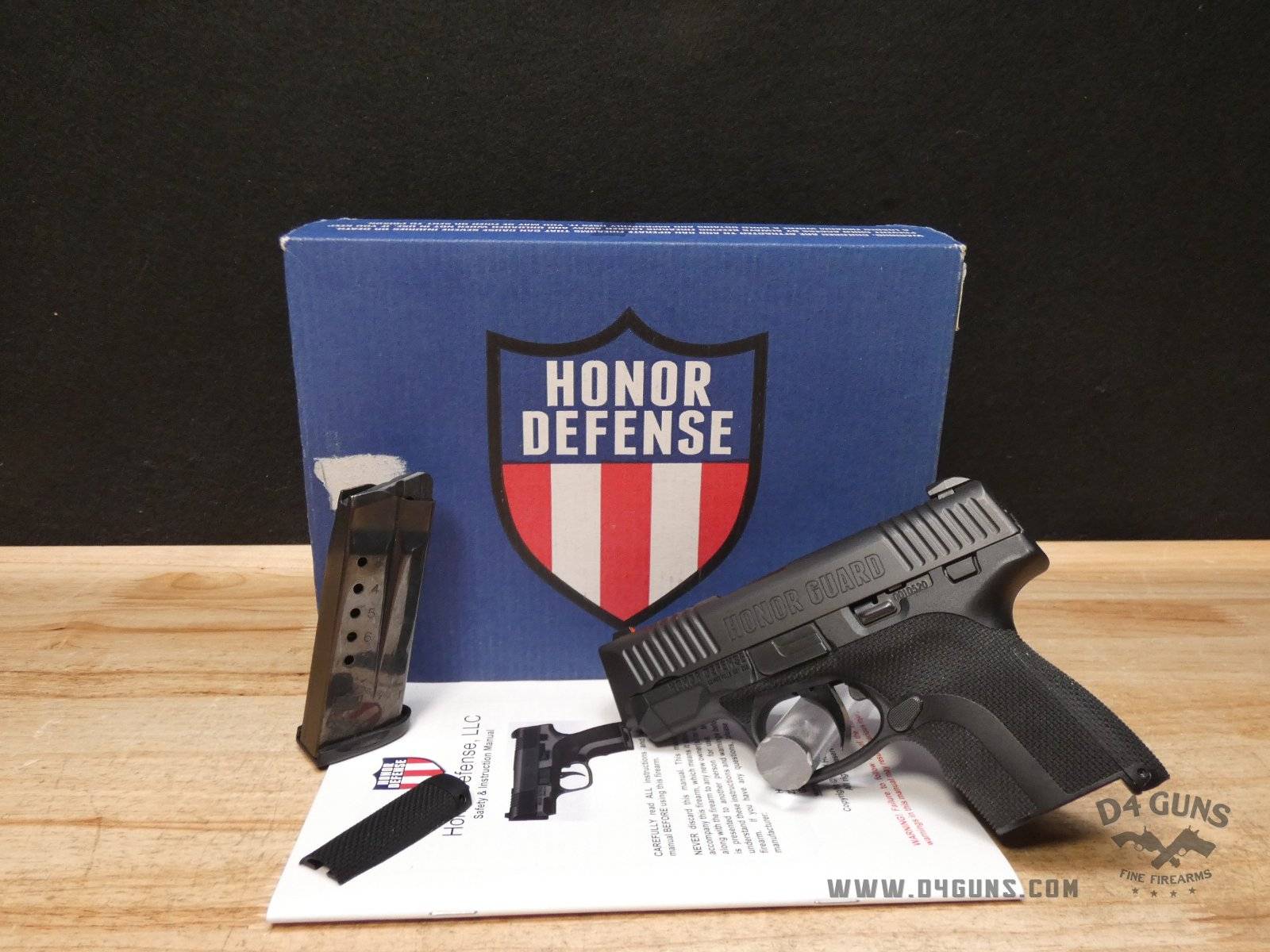 Up for grabs is an Honor Defense Honor Guard semi-automatic pistol in 9mm. Serial number- 0010520. This pistol is in great condition and comes with the original box, manual, interchangeable grip, and 2 magazines (7-rnd & 8-rnd). Honor Defense Honor Guard Sub-Compact pistol is sized to be the perfect carry companion. It features serrations going over the top of the slide for easier racking and snag-free sights. The stainless steel barrel and slide have a black ferric nitro-carburized finish. Honor Defense pistols are 100 percent made in the USA and assembled by Veterans. V2-D4 Barrel Length: 3.2 Bore condition: Good