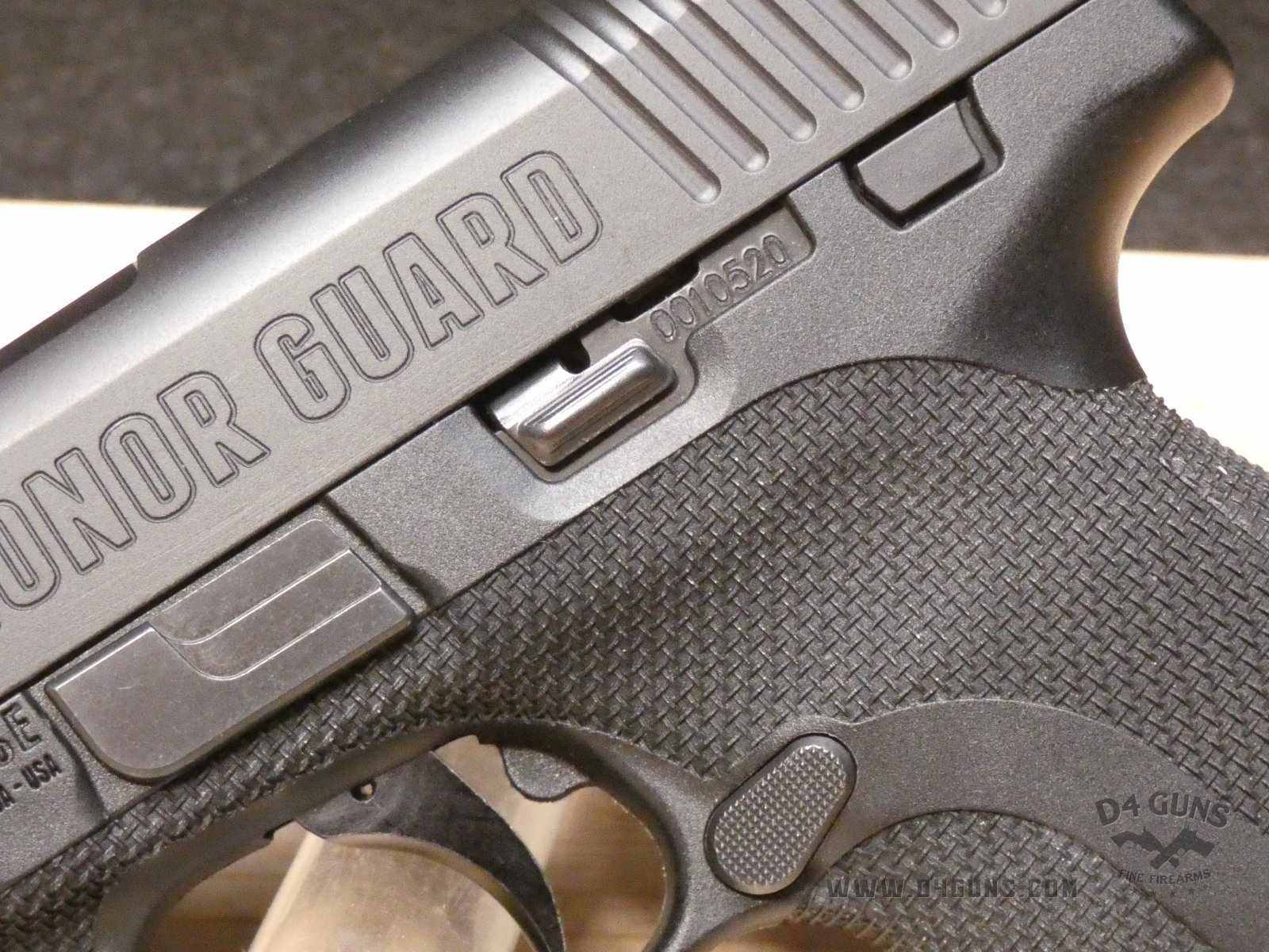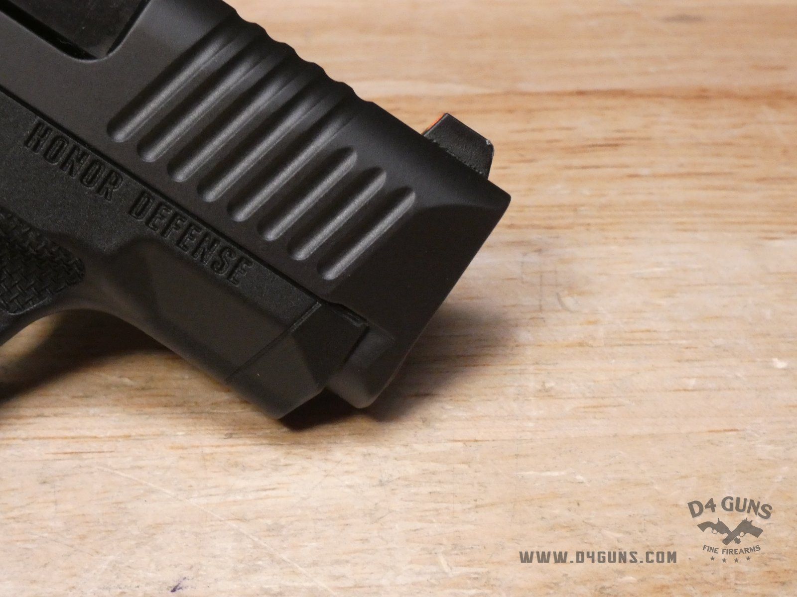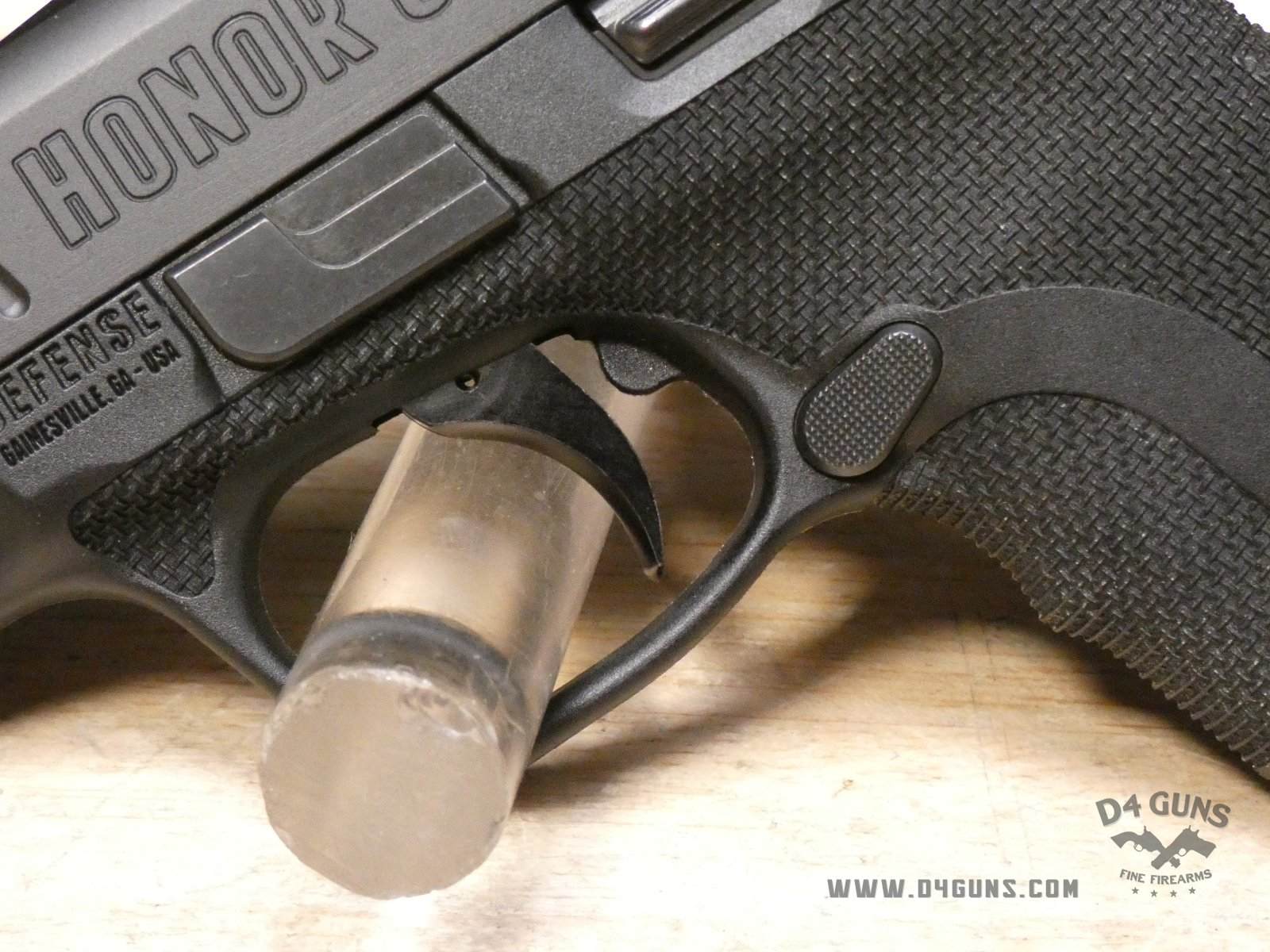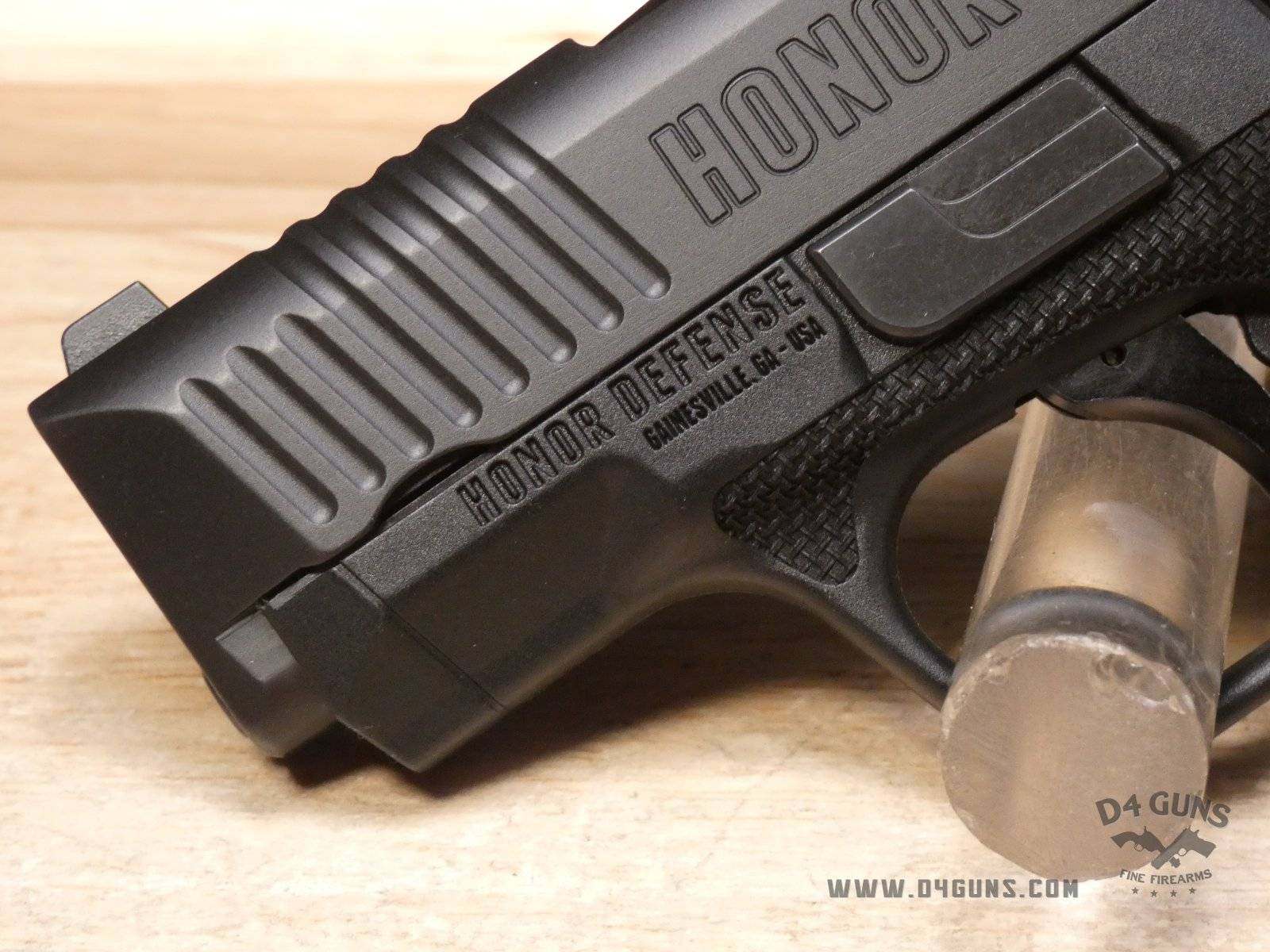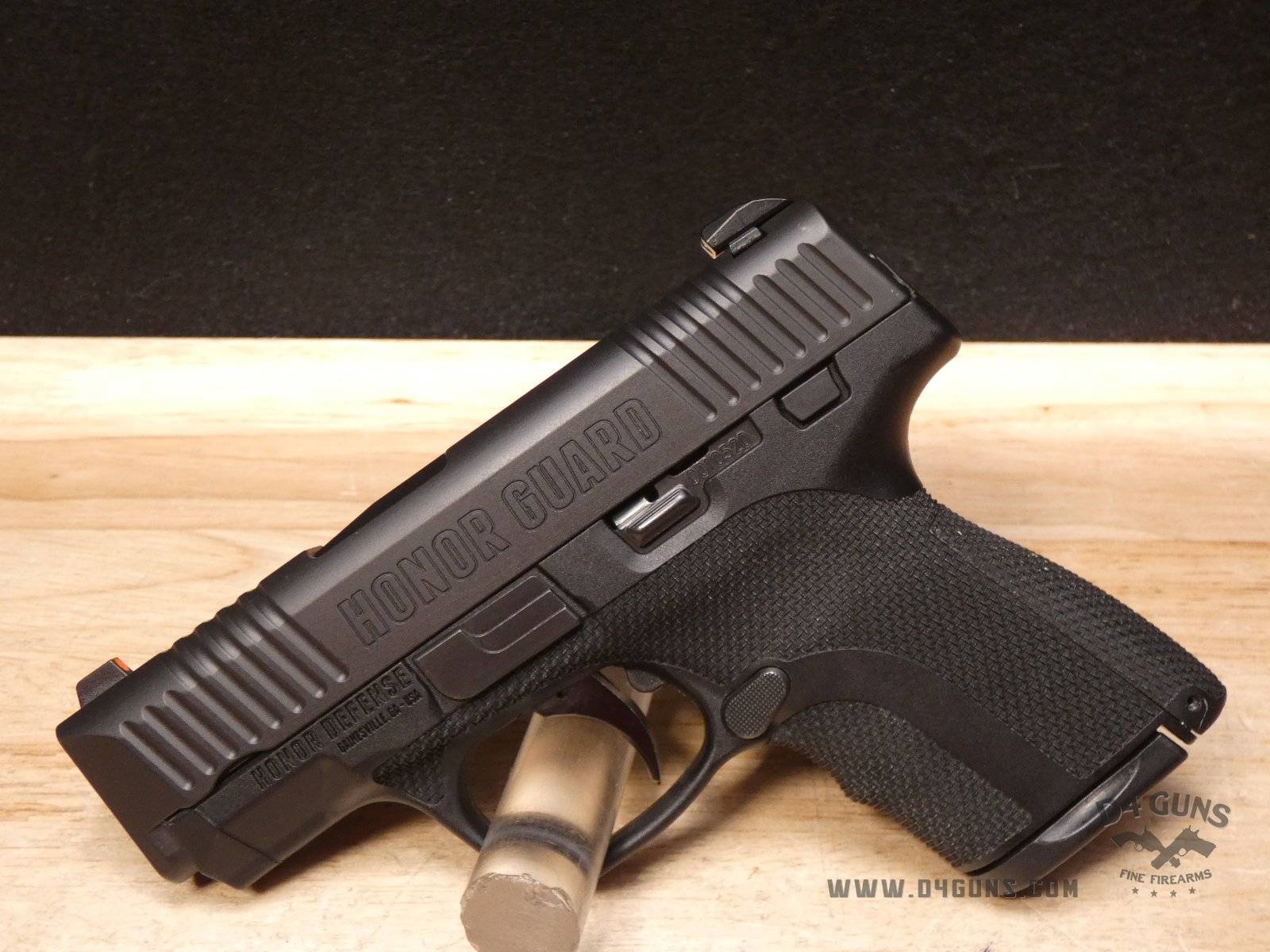 Up for grabs is an Honor Defense Honor Guard semi-automatic pistol in 9mm. Serial number- 0010520. This pistol is in great condition and comes with the original box, manual, interchangeable grip, and 2 magazines (7-rnd & 8-rnd). Honor Defense Honor Guard Sub-Compact pistol is sized to be the perfect carry companion. It features serrations going over the top of the slide for easier racking and snag-free sights. The stainless steel barrel and slide have a black ferric nitro-carburized finish. Honor Defense pistols are 100 percent made in the USA and assembled by Veterans. V2-D4 Barrel Length: 3.2 Bore condition: Good