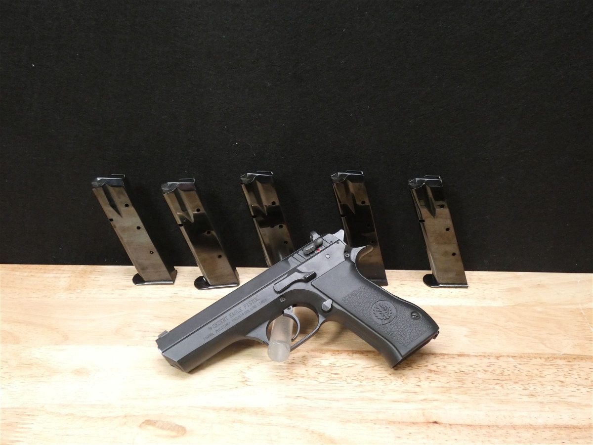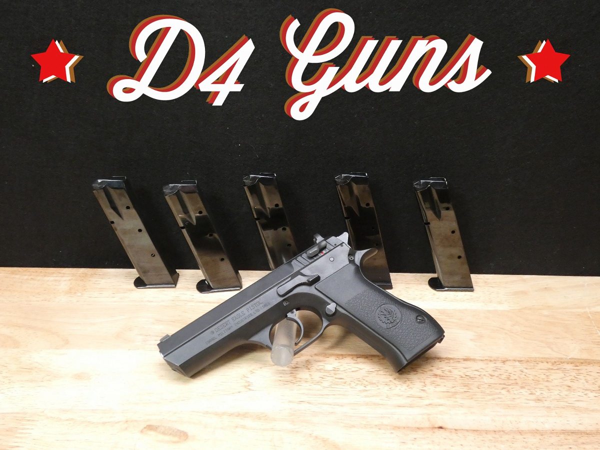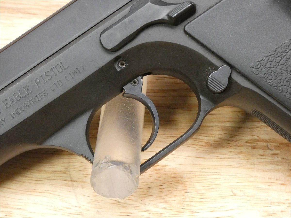 For sale is a IMI Magnum Research Desert Eagle Baby Eagle semi-automatic pistol in 9mm. Serial number-20307405. This pistol comes with 5 magazines. The Baby Eagle is known by the industry as having one of the most reliable mechanisms in the world. The "Baby" of the Desert Eagle family offers an excellent handgun value and plenty of firepower. The grip design is exceptionally comfortable and well-liked by shooters. It features a precision land and groove match barrel, ambidextrous teardrop-shaped decocking mechanism on the slide, smoother trigger pull, fully interchangeable magazines with all Baby Eagle II models. V2-H3 Barrel Length: 4.5 Bore condition: Good