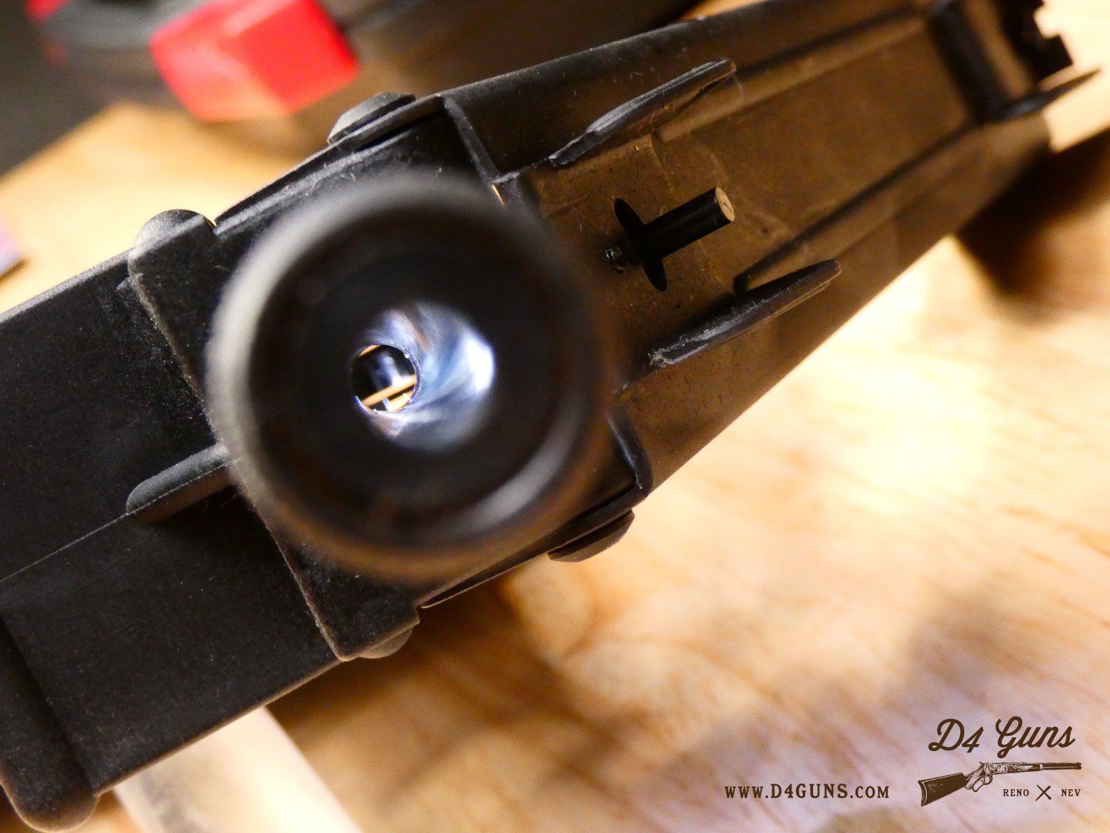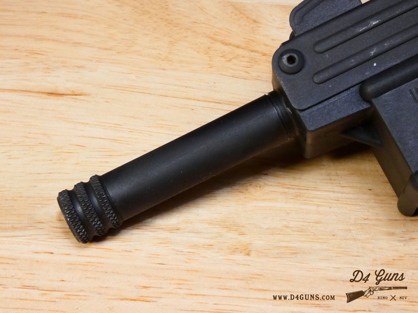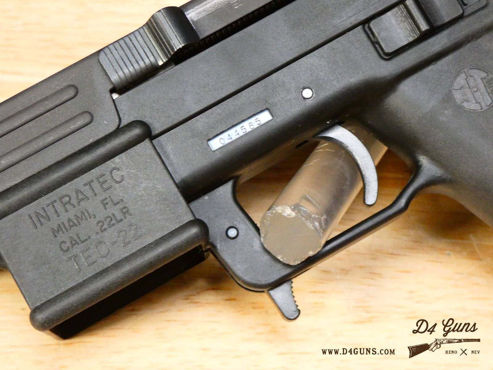 For sale is a Intratec 22 semi-automatic pistol in .22LR. Serial number-044585. This pistol is in great condition and comes with the original case, manual, and (1) magazine. The pistol is blow-back operated, includes a 30-RD Ruger 10/22 mag, notch and post sights, and a 4" threaded barrel, with an additional extended barrel with a head shroud. The pistol has a simple ambi-safety, and slide. The Tec-22 was manufactured between 1988 and 1994. V2-I2 Barrel Length: 4 Bore condition: Good