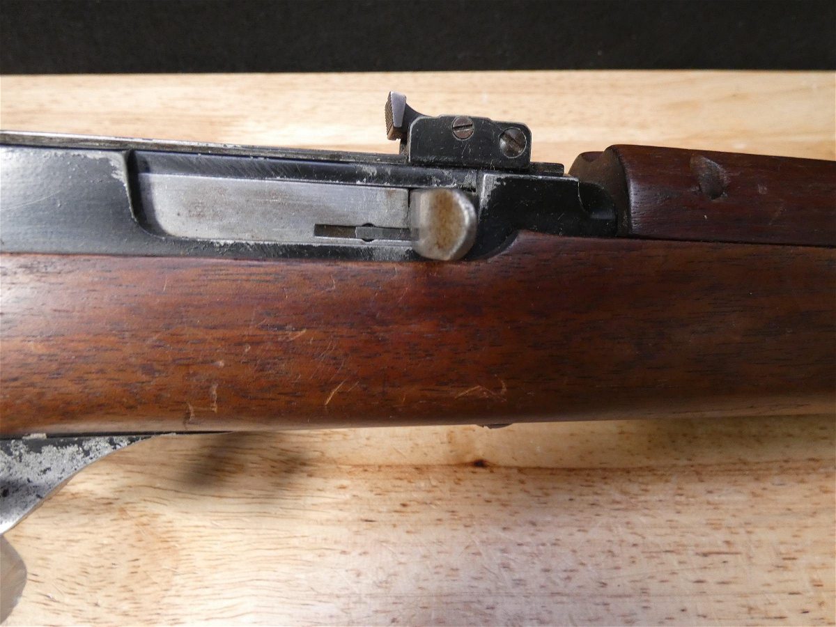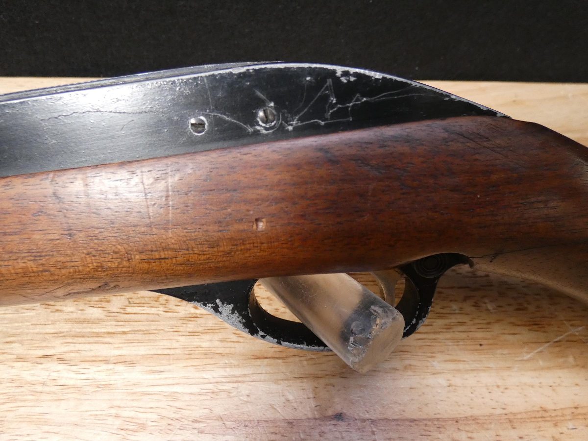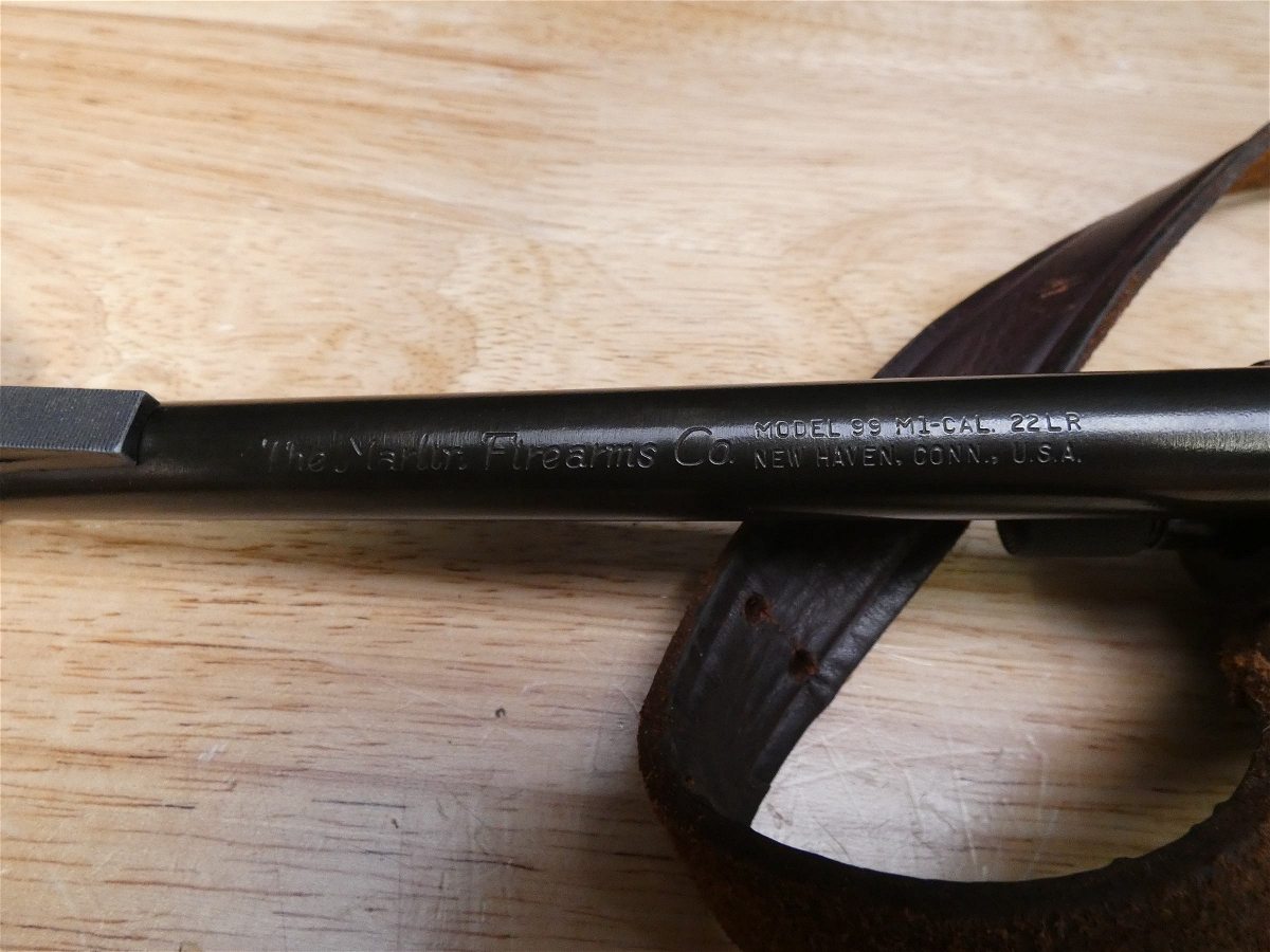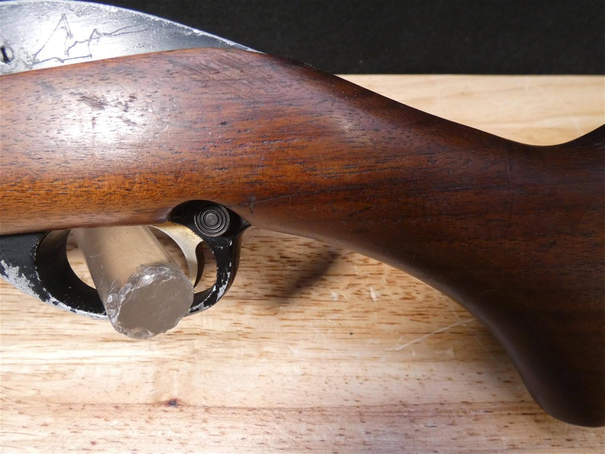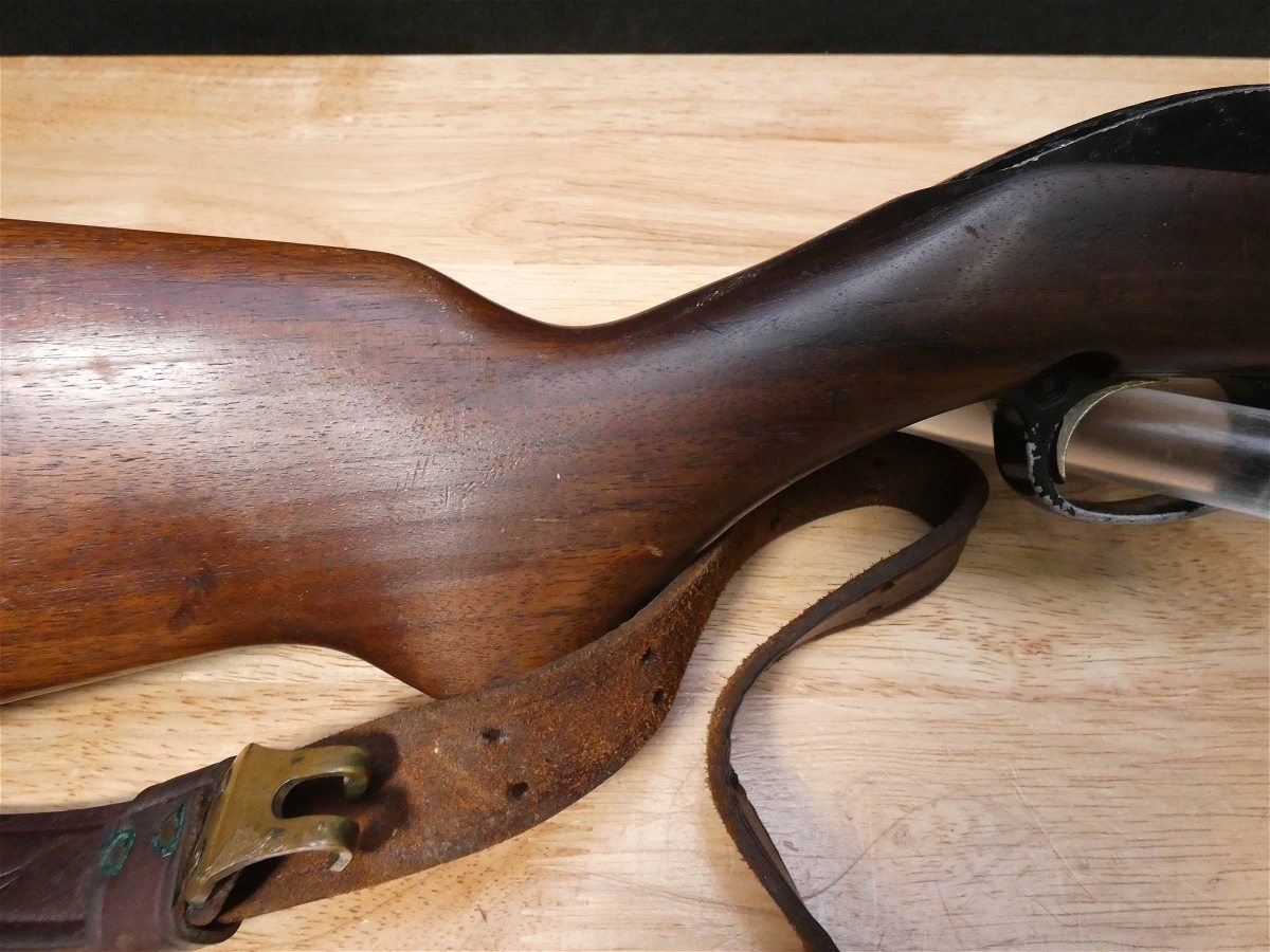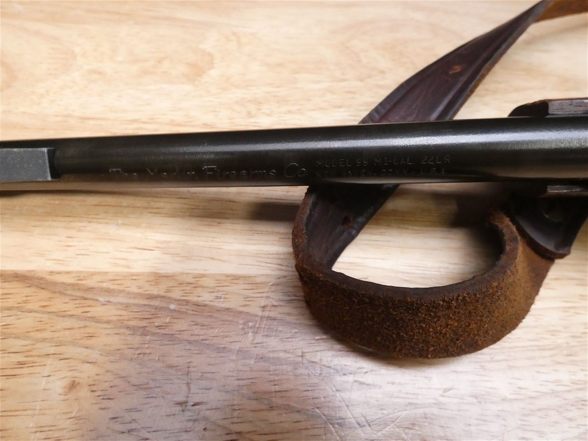 For sale is a Marlin Model 99M1 semi automatic rifle in .22 LR. Serial number- N/A. While the Model 99 series was typical of what you'd expect of a standard .22 rifle of the period, the Model 99M1 was instead styled to resemble the US Army M1 carbine, with an eighteen-inch barrel, handguard, barrel band, nine-shot tubular magazine even with the end of the stock, and receiver sight mounted on the scope grooves. An excellent trainer rifle with style! Please note that there is heavy finish wear on the wood stock and on most metal areas. Please refer to the photos. V2-A2 Barrel Length: 18 Bore condition: Good