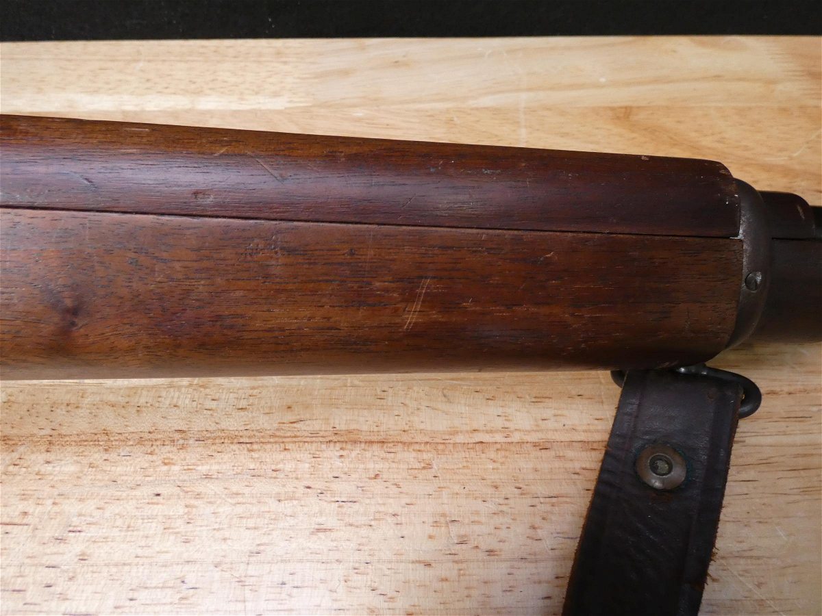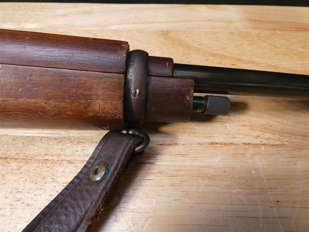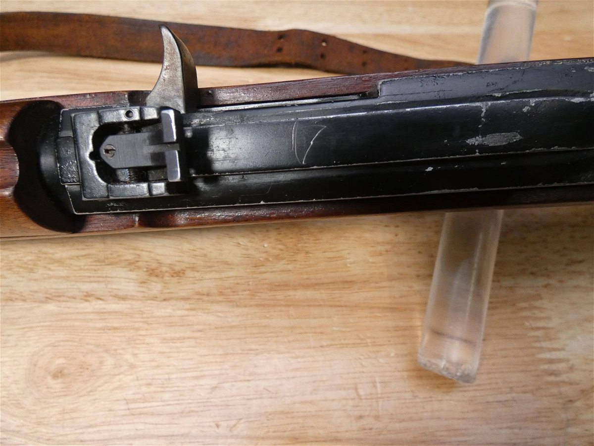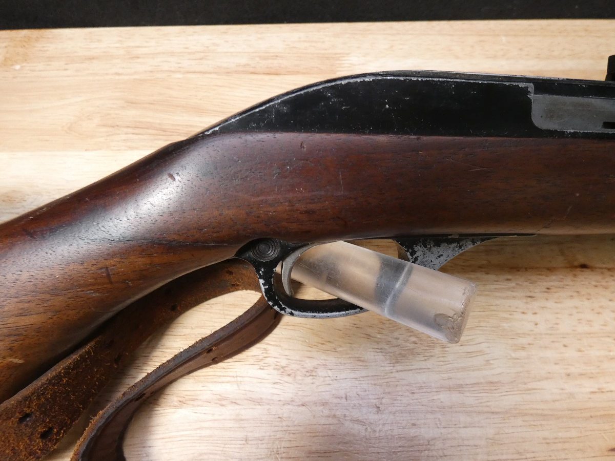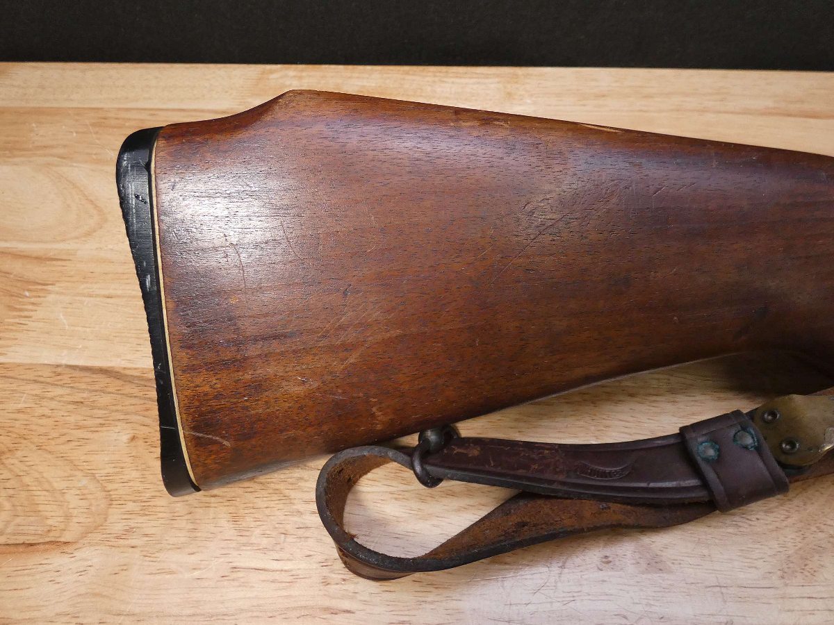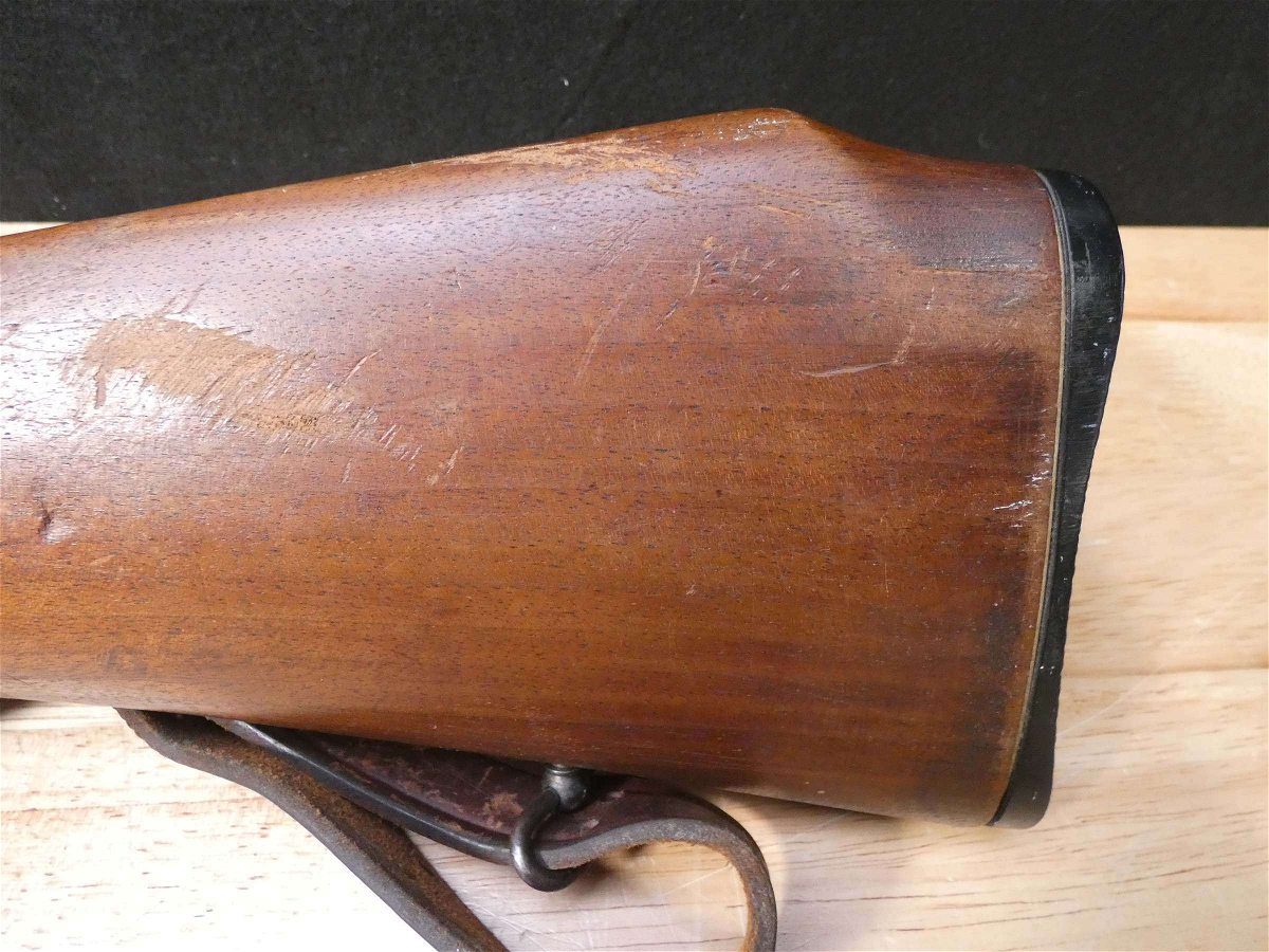 For sale is a Marlin Model 99M1 semi automatic rifle in .22 LR. Serial number- N/A. While the Model 99 series was typical of what you'd expect of a standard .22 rifle of the period, the Model 99M1 was instead styled to resemble the US Army M1 carbine, with an eighteen-inch barrel, handguard, barrel band, nine-shot tubular magazine even with the end of the stock, and receiver sight mounted on the scope grooves. An excellent trainer rifle with style! Please note that there is heavy finish wear on the wood stock and on most metal areas. Please refer to the photos. V2-A2 Barrel Length: 18 Bore condition: Good