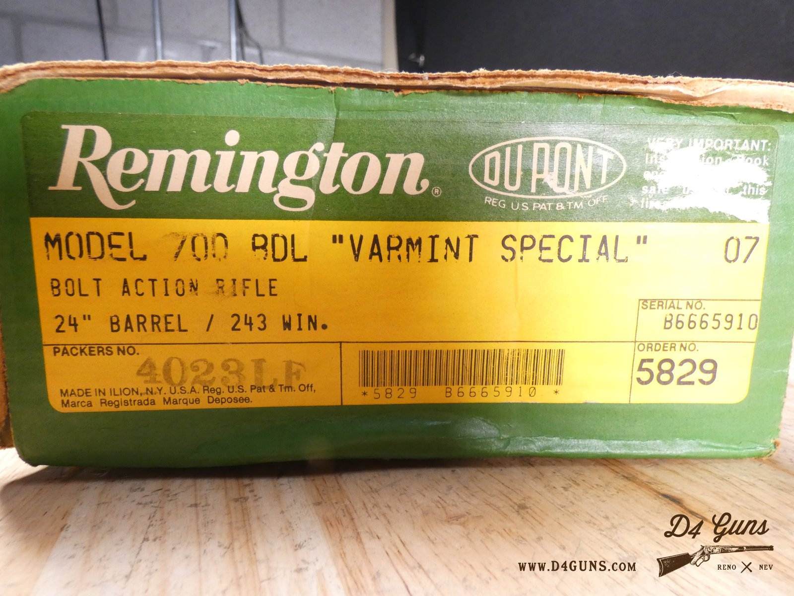 For sale is a Remington 700 BDL Varmint Special bolt action rifle in .243 Winchester. Serial number- B6665910. This 700 BDL is in excellent, like new, condition and comes with the original box. According to Remington's date code stamps we believe this rifle was manufactured in 1985. The Remington Model 700 is a series of bolt-action centerfire rifles manufactured by Remington Arms since 1962. The Remington Model 700, a rifle with no equal, and a superior performer in every way. Its accuracy and dependability have become the standard by which all other centerfire rifles are measured and continually fall short. Still the most accurate out-of-the-box rifle made, the Model 700 brings its famous action and renowned consistency to this diverse family of guns. The Model 700 BDL has been the hunter's favorite for 40 years because its strong, smooth action, consistent accuracy, and classic beauty make it an unequaled value. Its high-gloss American walnut stock is enhanced by a distinctive black fore-end cap, raised cheekpiece, and skip line cut checkering. V1-J1 Barrel Length: 24 Bore condition: Excellent Year Manufactured: 1985