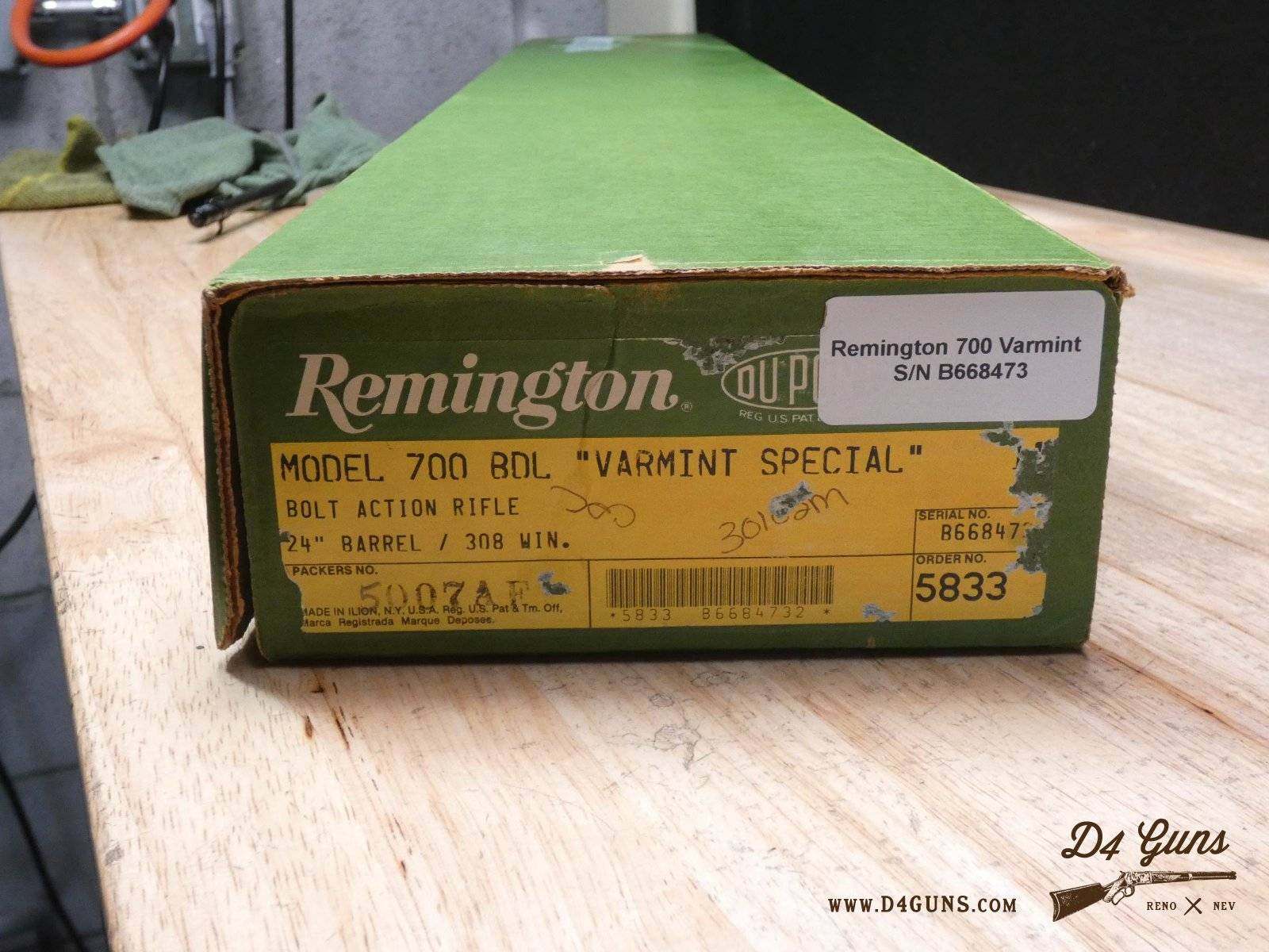 For sale is a Remington Model 700 BDL Varmint Special bolt-action rifle in .308 Win. Serial number- B6684732. This rifle is in like-new old stock condition and includes the original box as well. The Remington Model 700 is a series of bolt-action centerfire rifles manufactured by Remington Arms since 1962. The Remington Model 700, a rifle with no equal, and a superior performer in every way. Its accuracy and dependability have become the standard by which all other centerfire rifles are measured and continually fall short. Still the most accurate out-of-the-box rifle made, the Model 700 brings its famous action and renowned consistency to this diverse family of guns. The Model 700 BDL has been the hunter's favorite for 40 years because its strong, smooth action, consistent accuracy, and classic beauty make it an unequaled value. Its high-gloss American walnut stock is enhanced by a distinctive black fore-end cap, raised cheekpiece, and skip line cut checkering. V1-I2 Barrel Length: 24 Bore condition: Good
