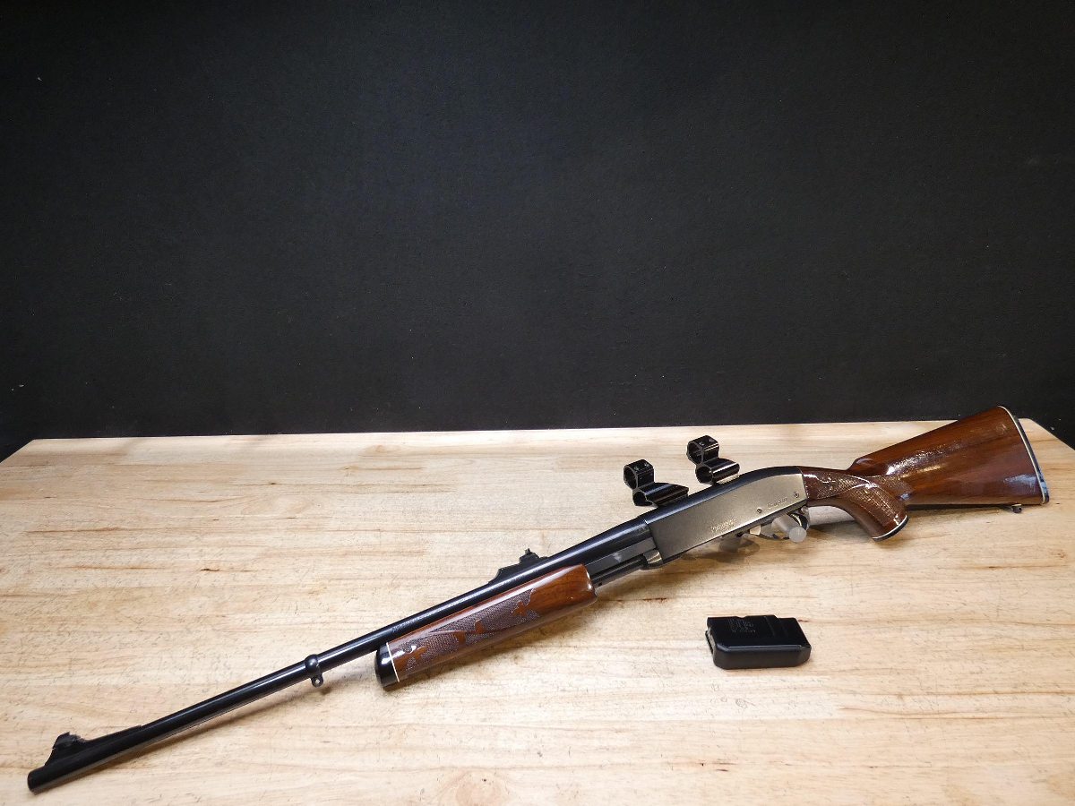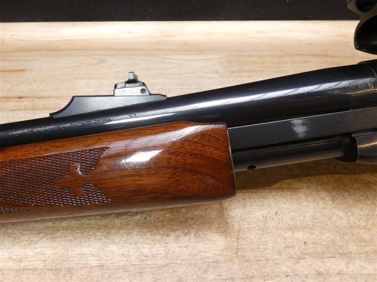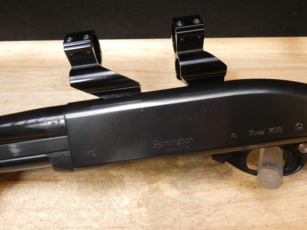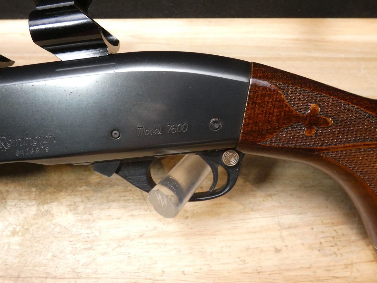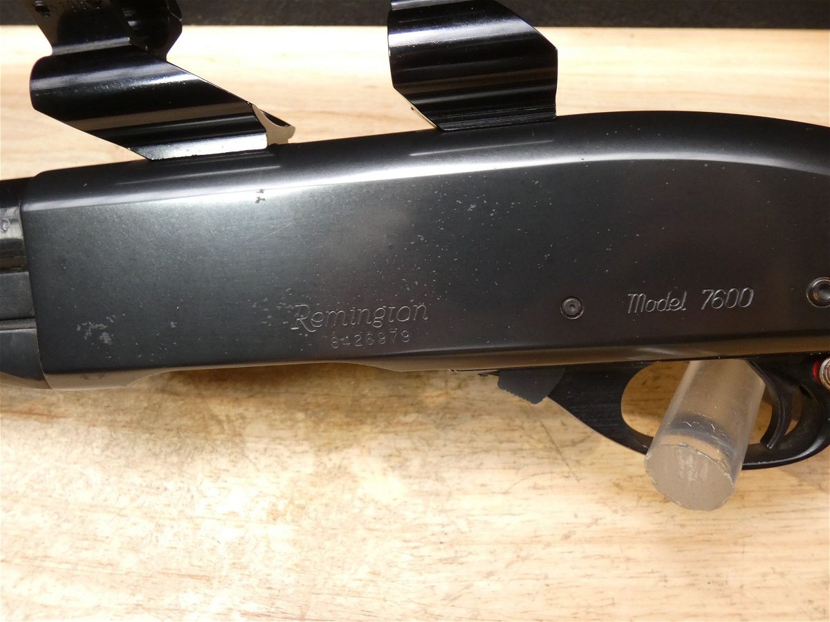 For sale is a Remington Model 7600 pump-action rifle in .30-06 SPRG. Serial number- 8426979. According to the barrel stamps we believe this rifle was manufactured in 1987. This 7600 is in good condition and comes with see through scope rings and a 4 round magazine. The Model 7600 is a progression from the original Model 760 pump-action rifle which Remington produced from 1952 to 1981. The ever-popular Model 7600 is one of the most proven deerslayers in the woods. You can't find a big-game rifle with a better combination of practical shooting features: twin action bars provide slick, smooth operation for rapid repeat shots; a quick-release, drop-out four-round magazine that loads and unloads instantly; and a free-floated barrel that matches the accuracy of the best bolt guns. An ideal cross-over rifle for pump-gun wingshooters. V1-F1 Barrel Length: 22 Bore condition: Excellent Year Manufactured: 1987