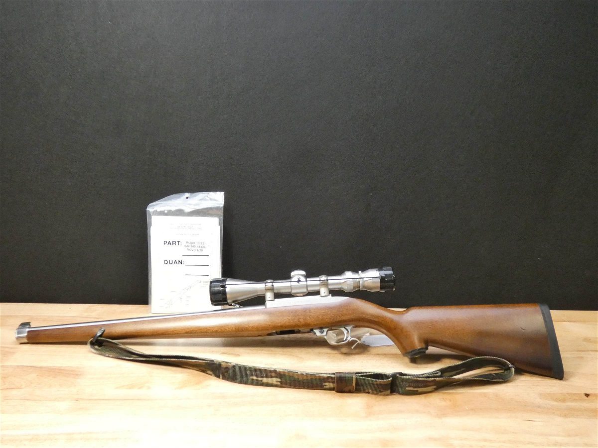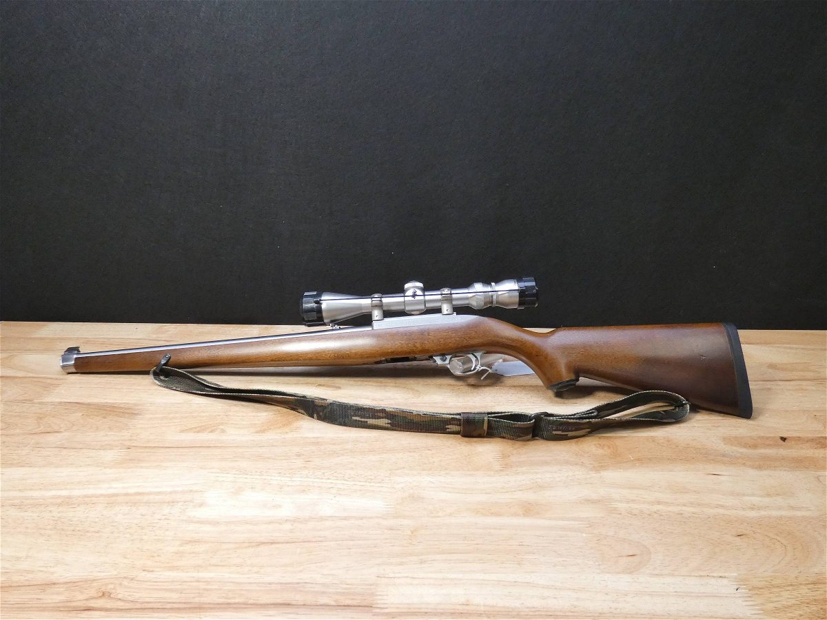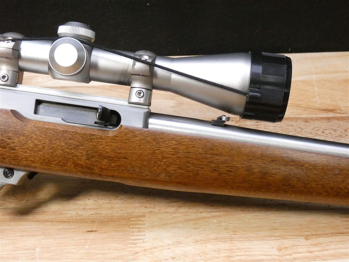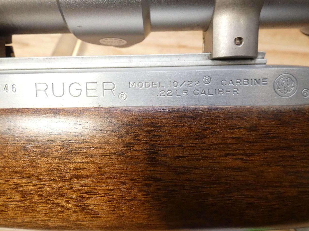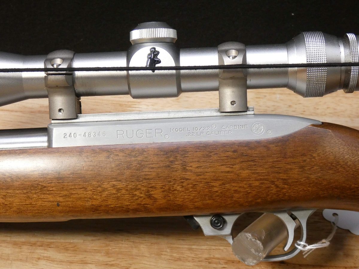 For sale is a Ruger 10/22 Carbine semi-automatic rifle in .22 LR. Serial number- 240-48346. This 10/22 Carbine is in great condition and comes with a 10-round magazine, owner's manual, sling, and a Tasco 3-9X40 Scope. Features an 18.5" Stainless barrel with an excellent bore. Has a Walnut Mannlicher Stock. The Ruger 10/22 is America's favorite. With proven performance, they're ideally suited for informal target shooting, plinking, small-game hunting, and action-shooting events. V2-K4 Barrel Length: 18.5 Bore condition: Excellent Year Manufactured: 1994