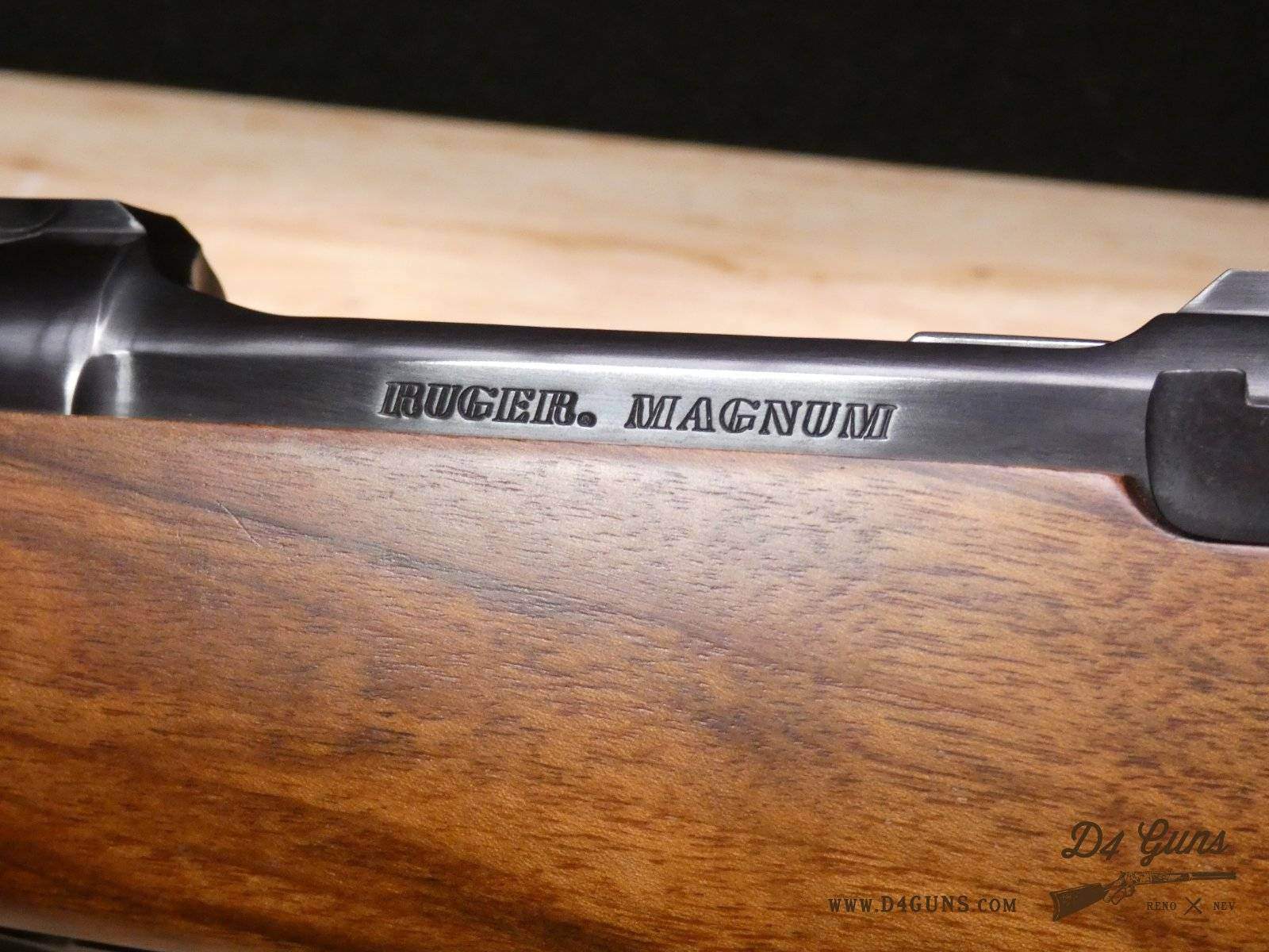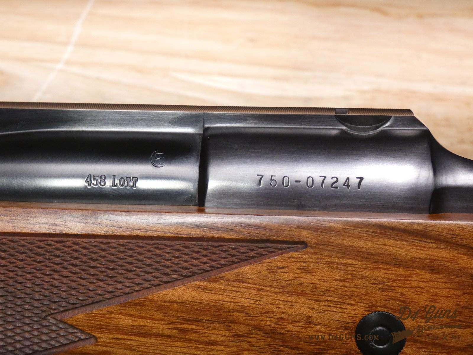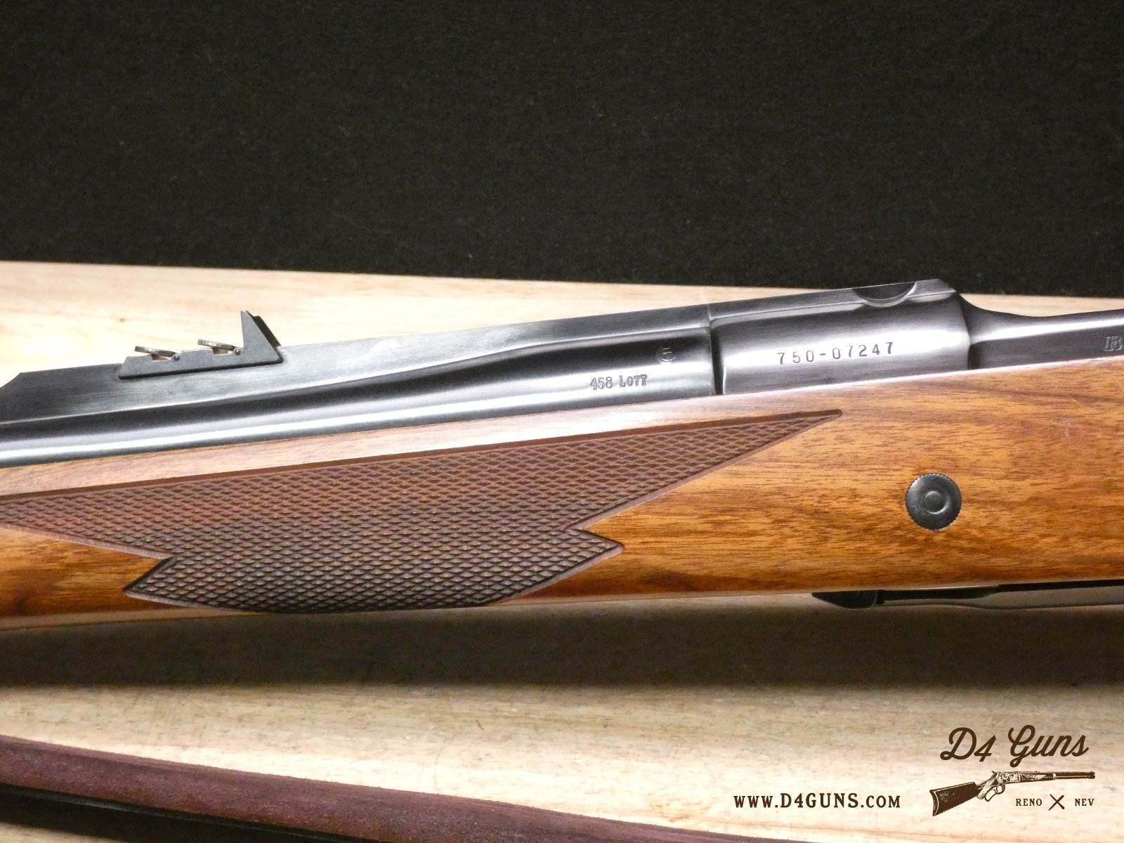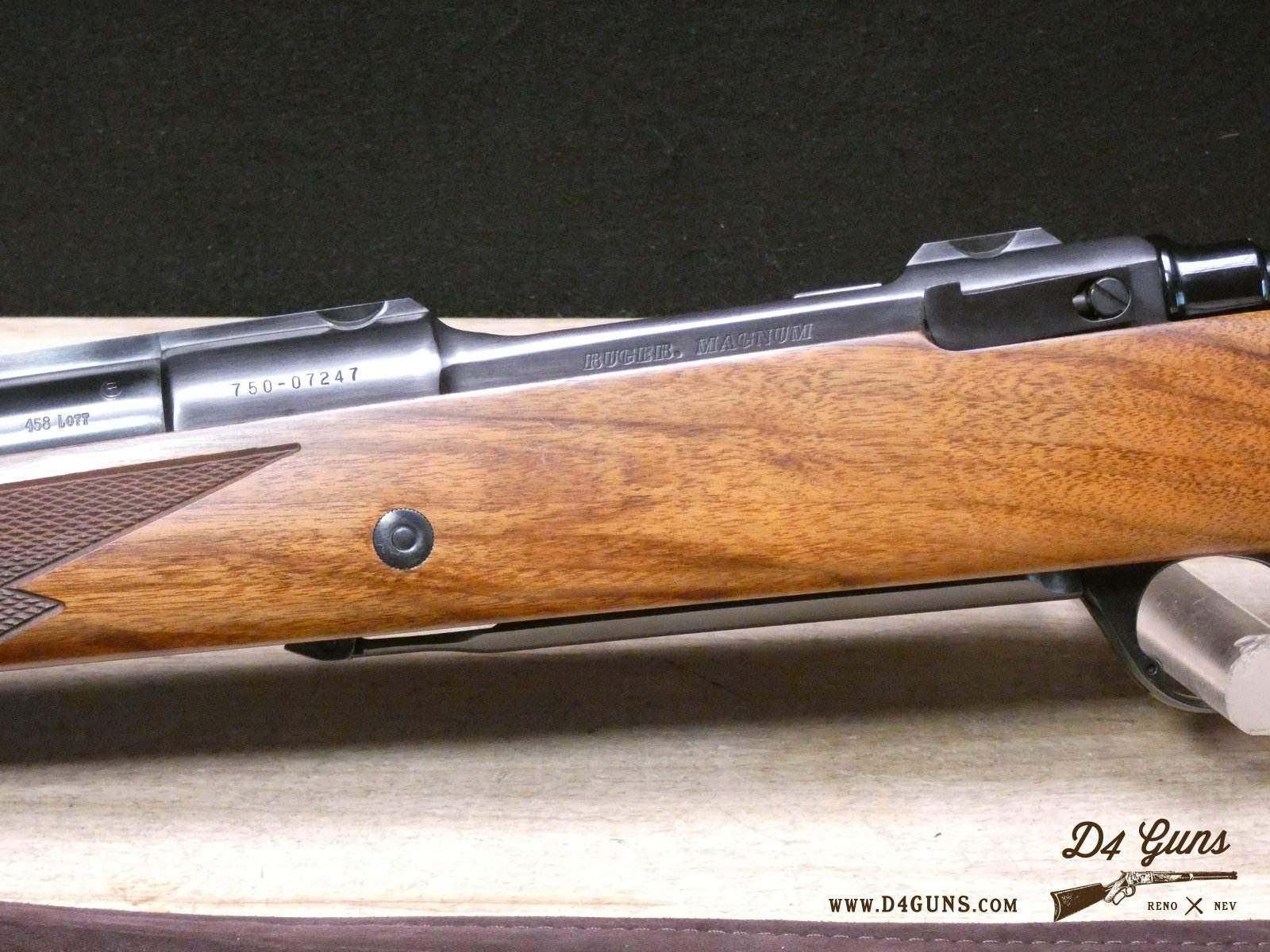 For sale is a Ruger M77 Magnum bolt-action rifle in .458 Lott. Serial number- 750-07247. Safari-grade big game gun in excellent condition. This rifle was manufactured in 2007 and includes a sling as well! The .458 Lott cartridge gives the serious hunter the stopping power needed for big game hunting. V1-B1 Barrel Length: 23 Bore condition: Good Year Manufactured: 2007