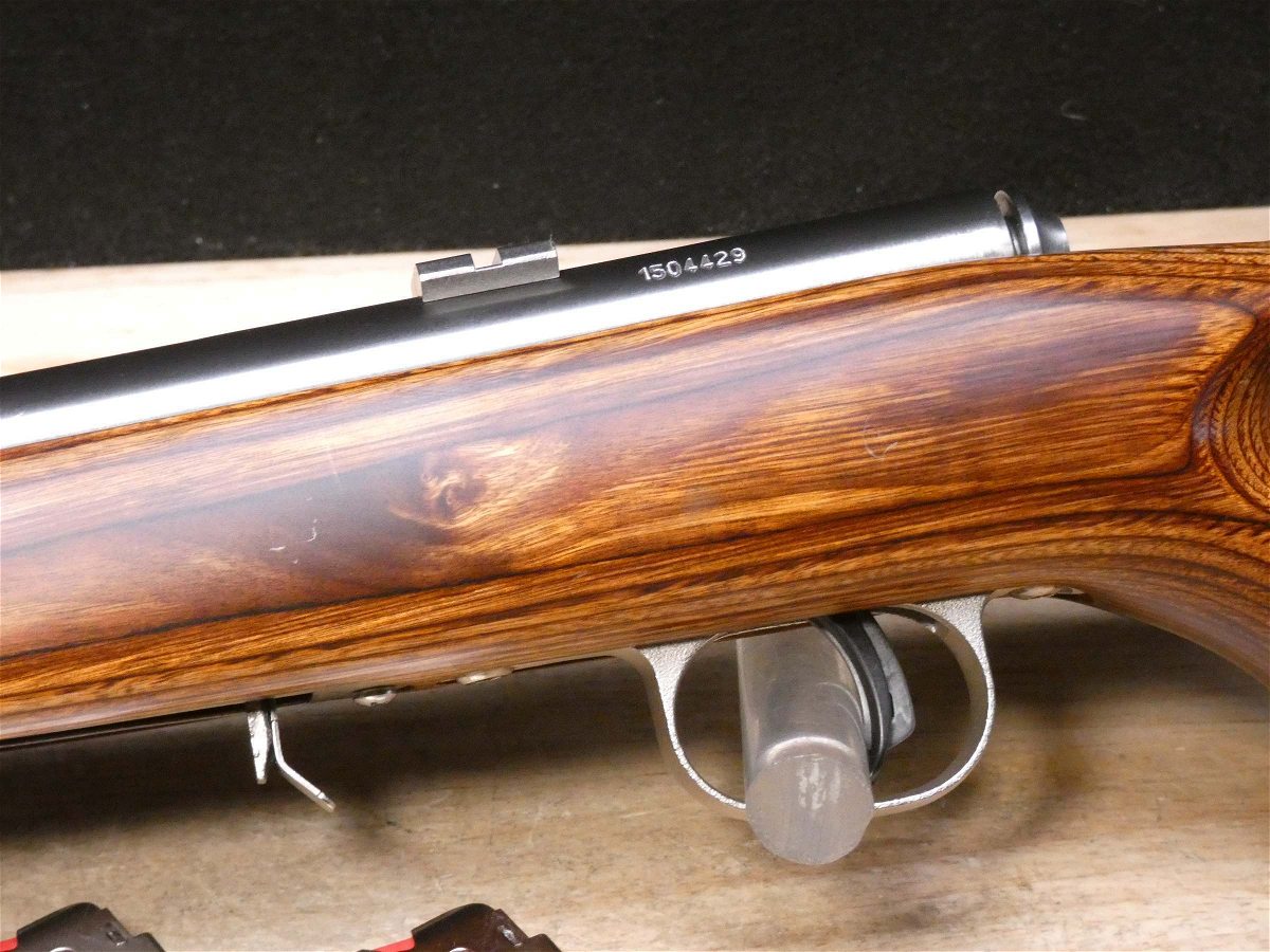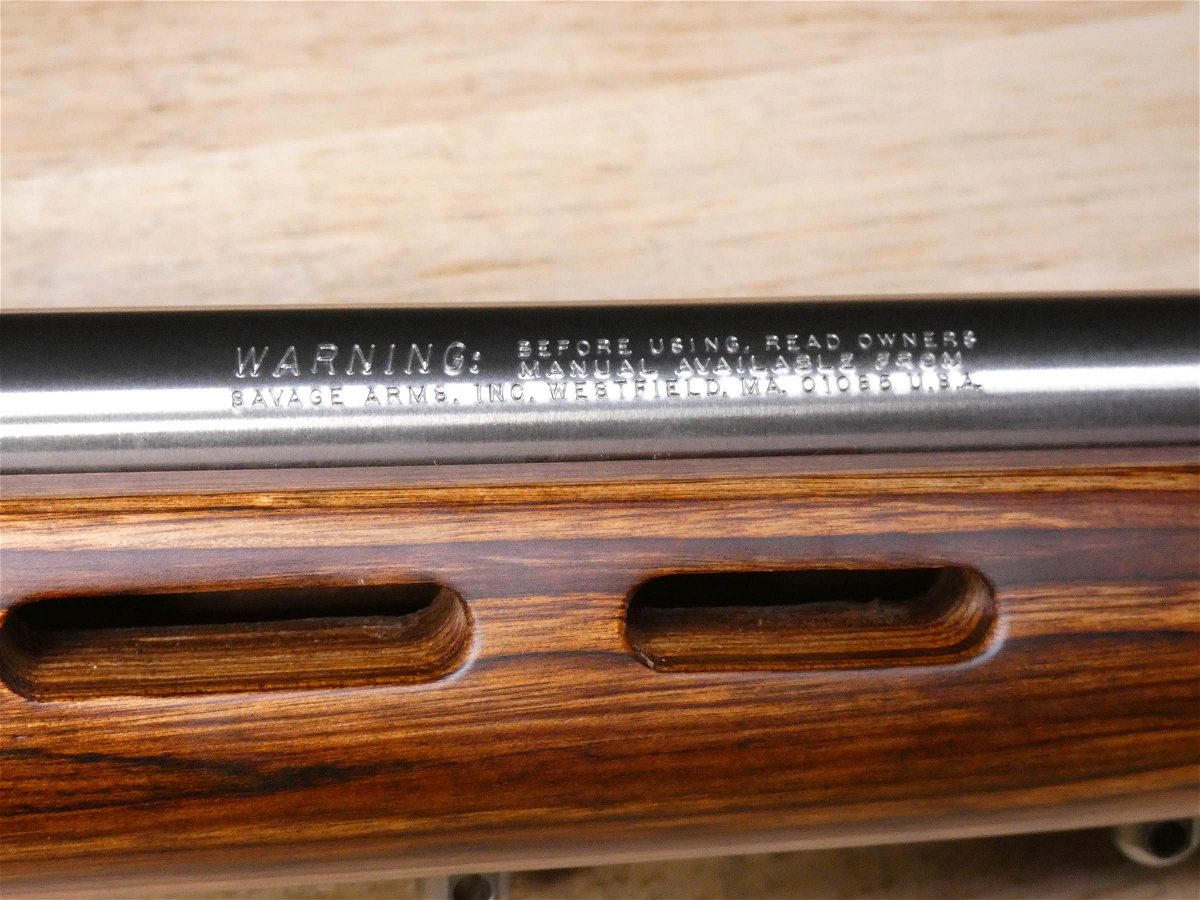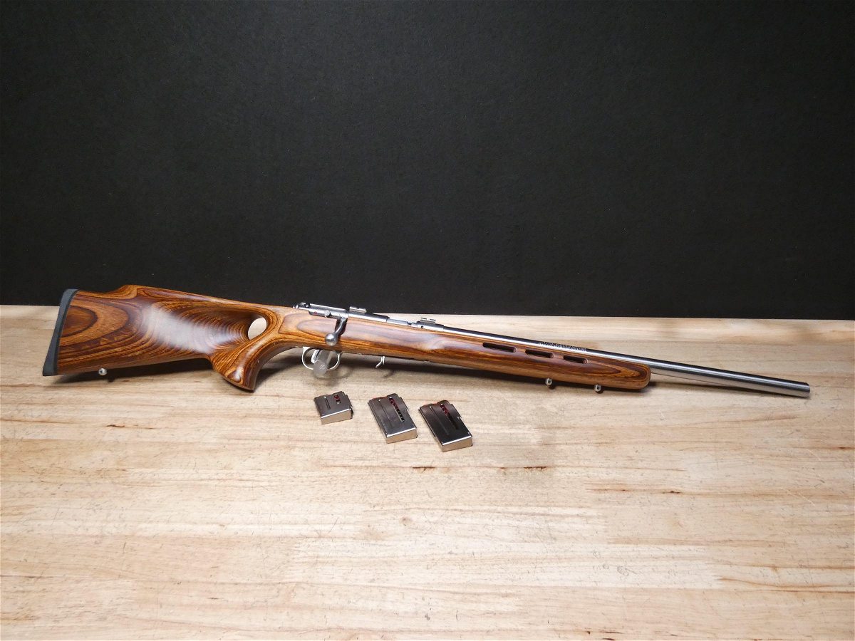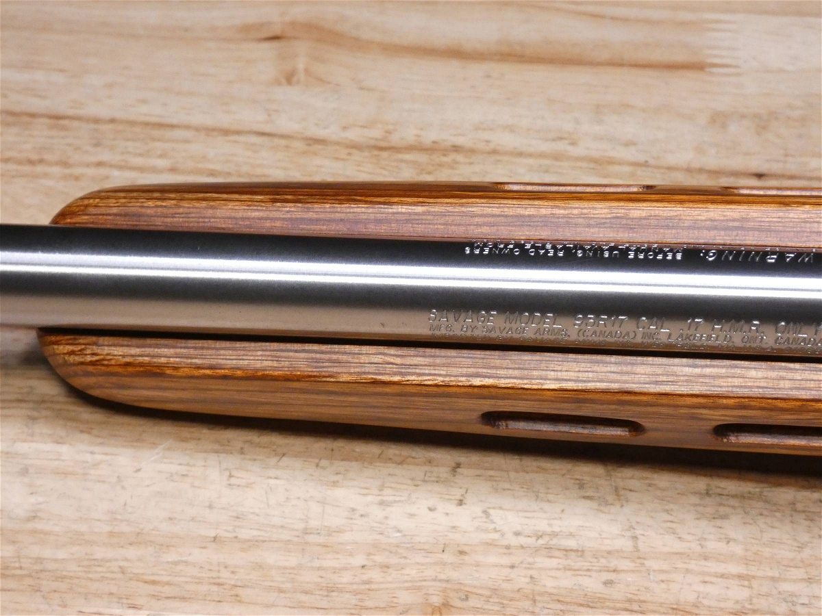 For sale is a Savage Model 93R17 BTVSS bolt-action rifle in .17 HMR. Serial number- 1504429. Drive tacks with the bolt-action 93R17 BTVS. It combines Savage's user-adjustable AccuTrigger technology and a 21-inch, button-rifled, heavy stainless steel barrel to deliver unbeatable accuracy. The rifle features a wood laminate stock with a custom thumbhole, as well as three detachable box magazines. V1-B2 Barrel Length: 21 Bore condition: Good