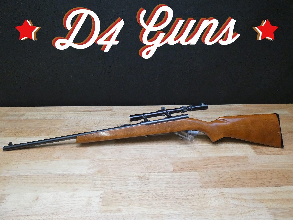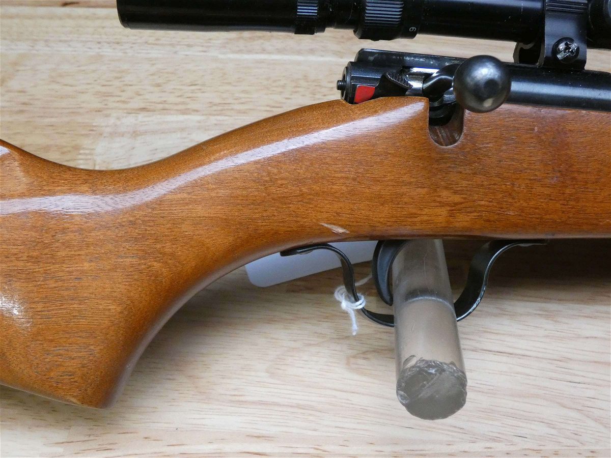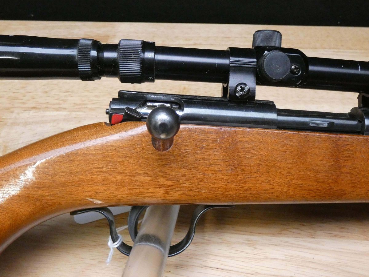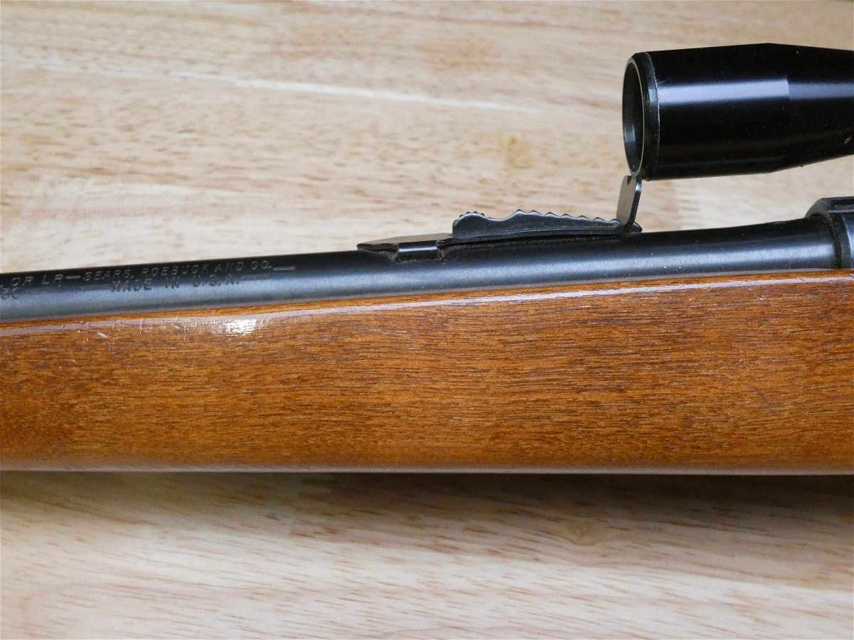 For sale is a Sears, Roebuck and Co Model 2T bolt action rifle in .22 S/L/LR. No serial number. This is a single shot bolt action manufactured for Sears by Winchester and is a clone of the Winchester Model 141. This is in need of some TLC. There is a crack at the wrist of the stock, and the bolt will not install into the receiver due to bent extractors. The rifle has a fair bore and includes a Tasco scope. V2-L2 Barrel Length: 21 Bore condition: Fair