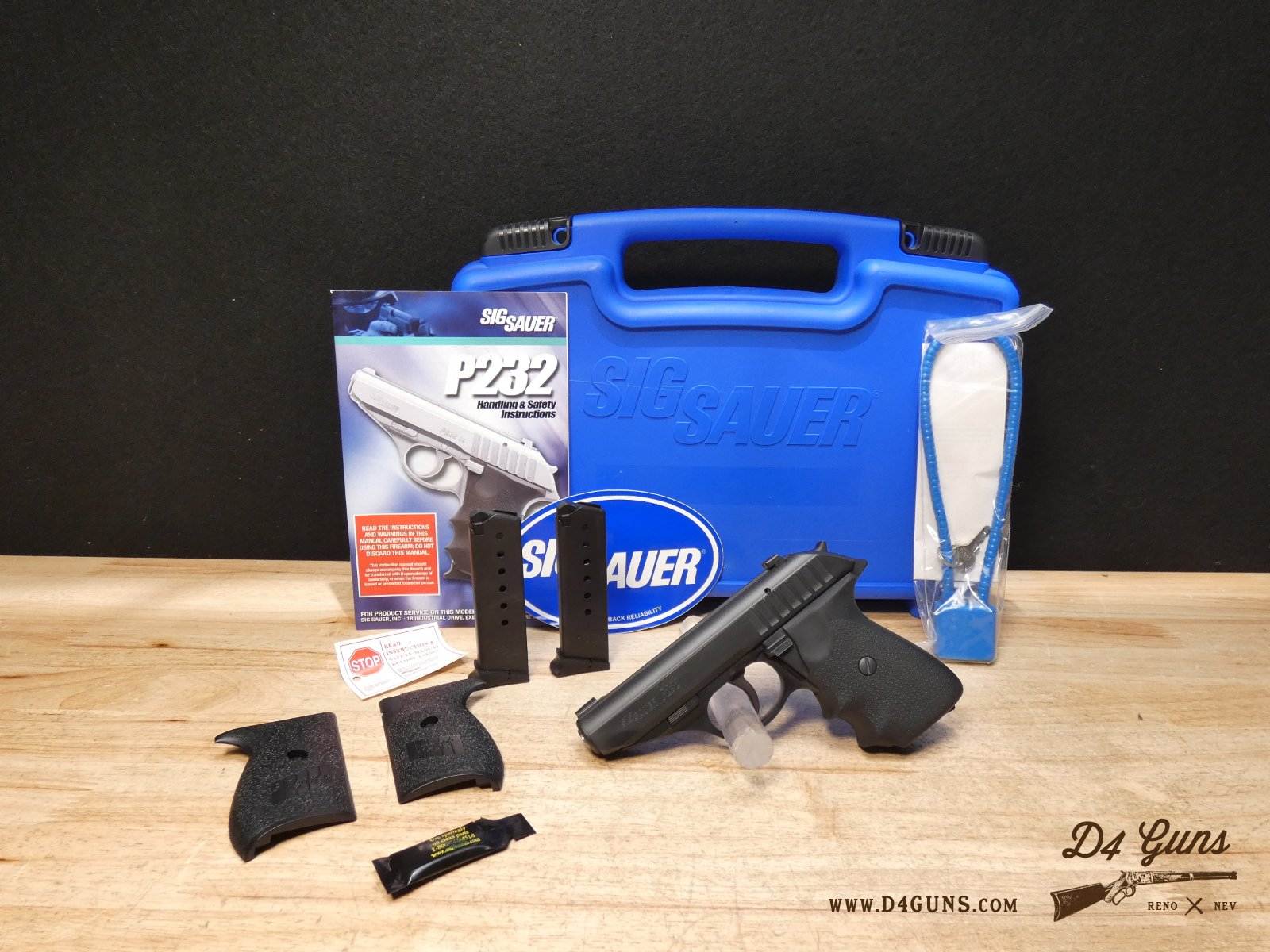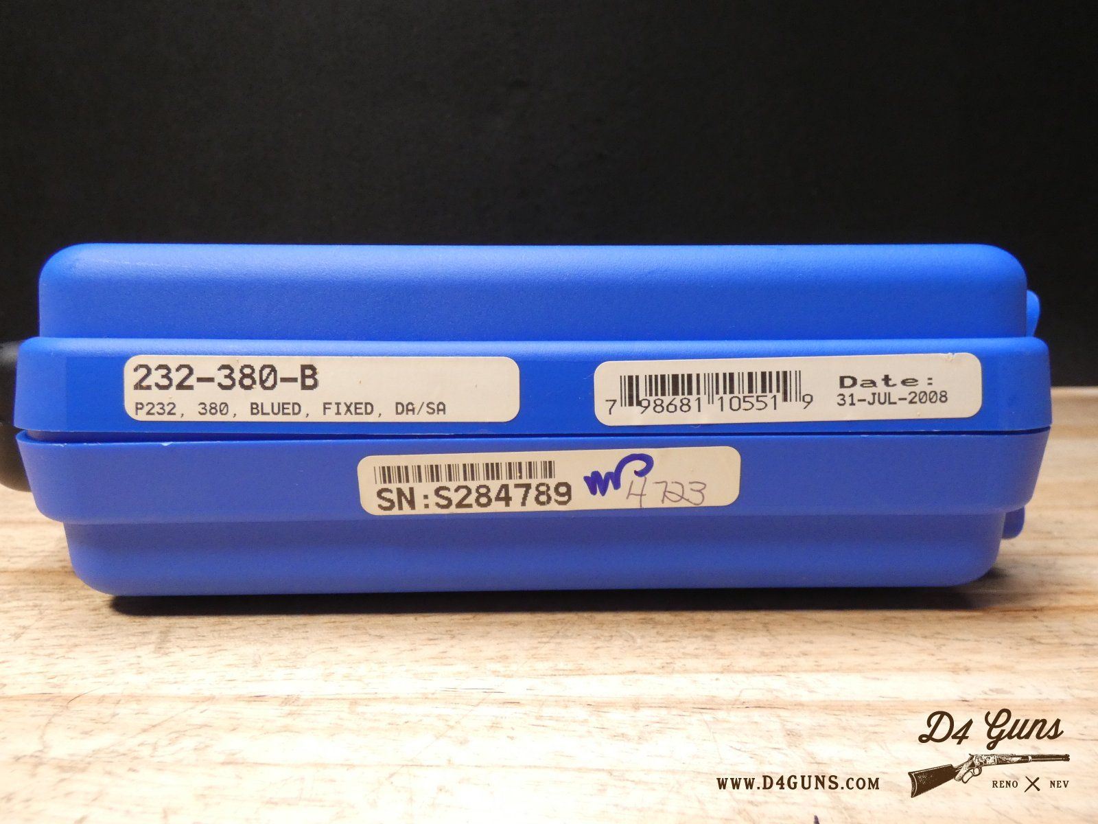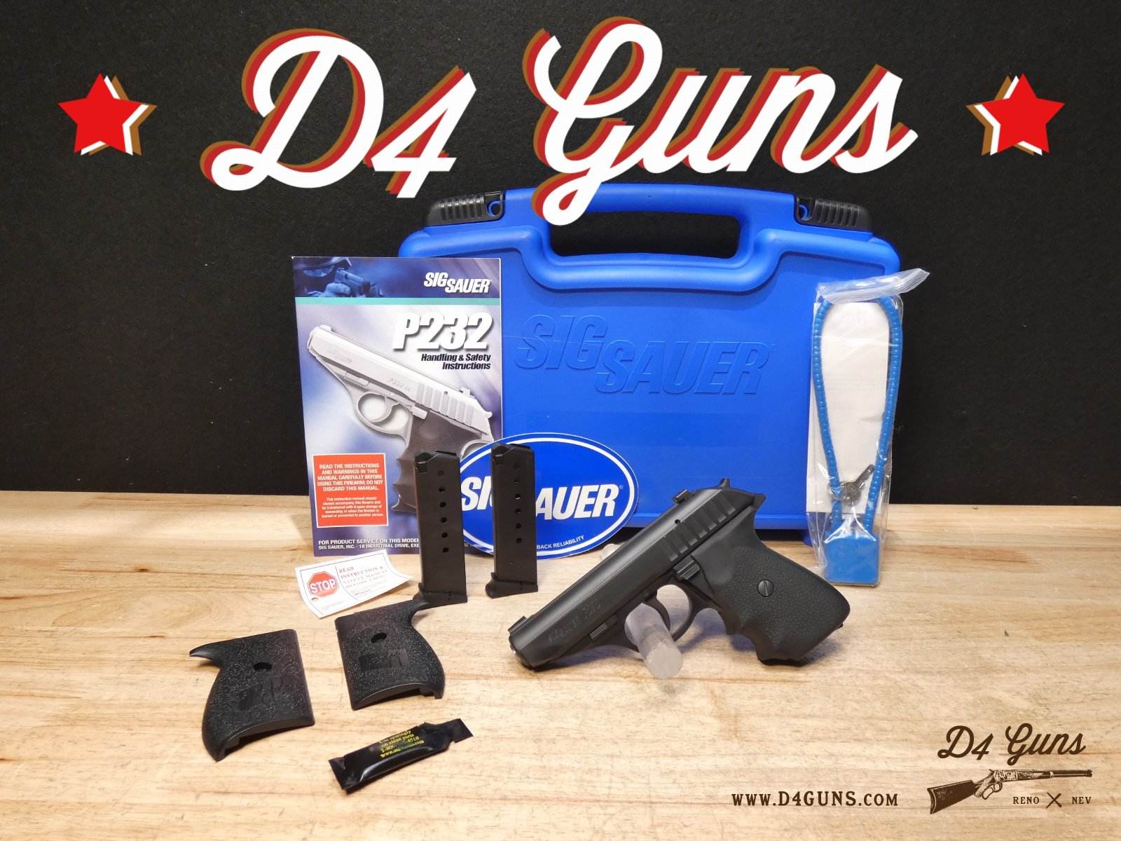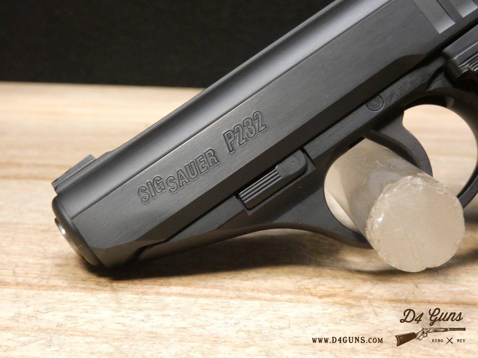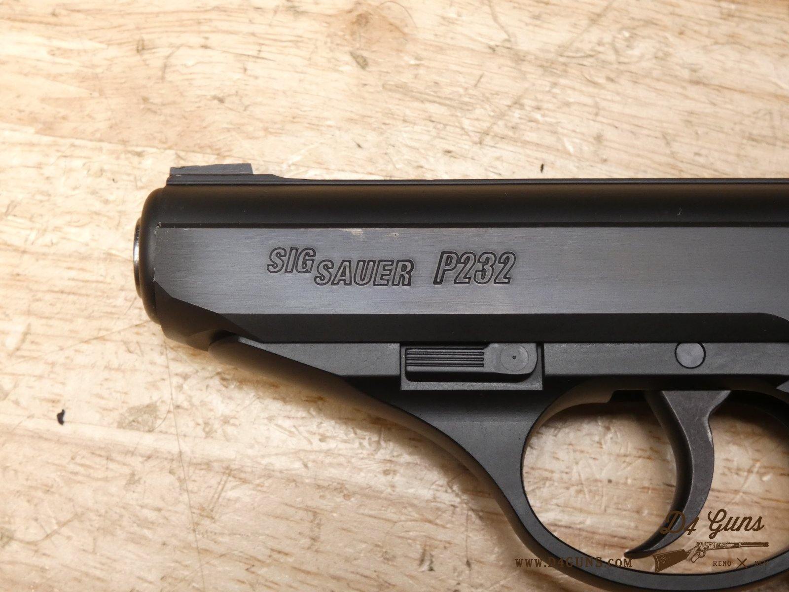 For sale is a Sig Sauer P232 semi-automatic pistol in 9mm Kurz/.380 ACP. Serial number- S284789. Manufactured in 2008 in Germany his P232 is in great condition and features the German "kiel" proof mark. It also comes with the original hard case and two magazines. Features include double action, 3-dot sights and a textured grip. The .380 Auto chambered SIG Sauer P232 Black is a real classic for its almost legendary reliability, portability and accuracy. Still available in very small numbers, the P232 is a compact semiauto pistol built as a concealed carry or backup gun, that's Vintage in looks but very, very modern in concept and manufacture. V2-E1 Barrel Length: 3.5 Bore condition: Good Year Manufactured: 2008