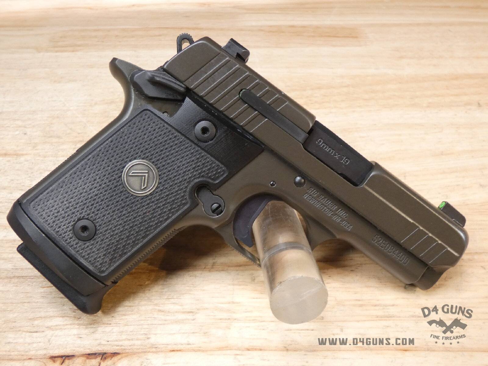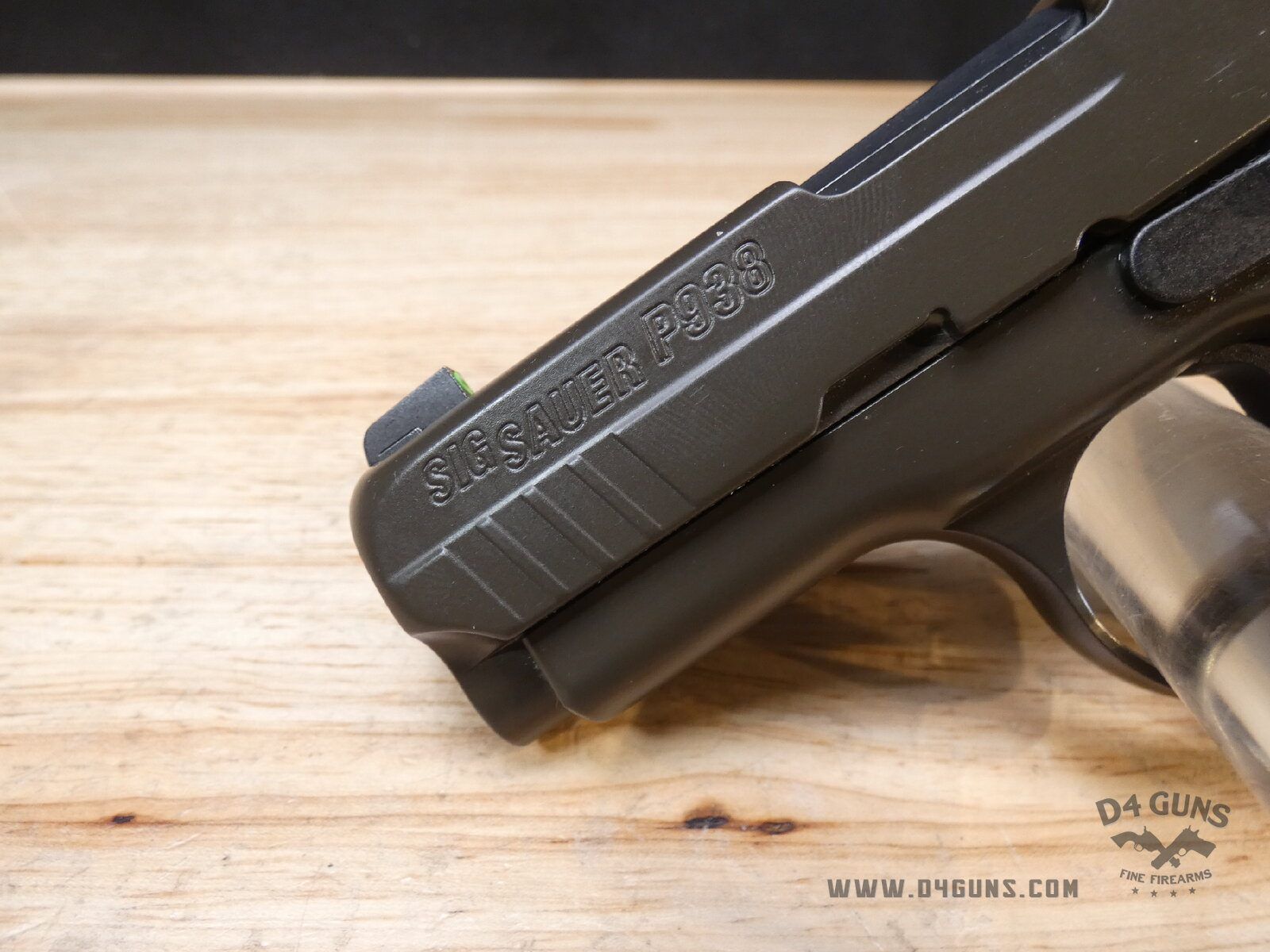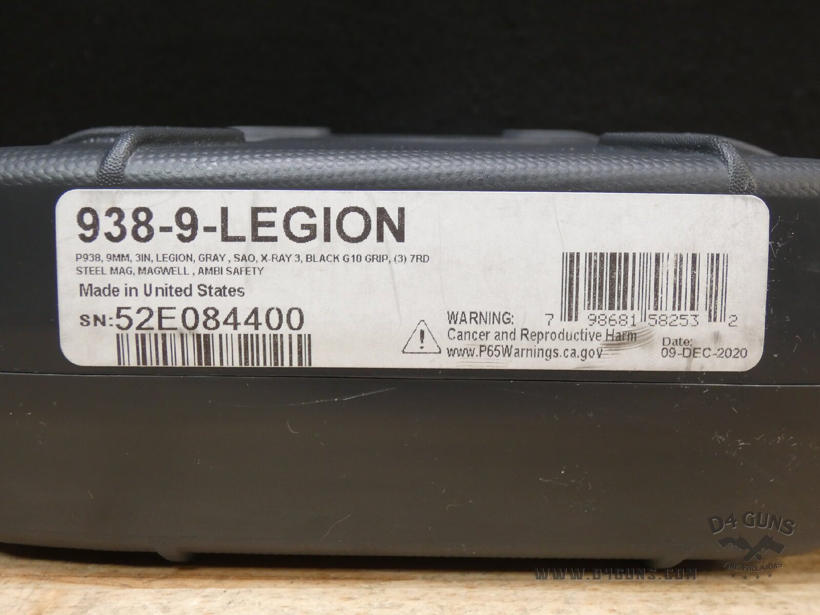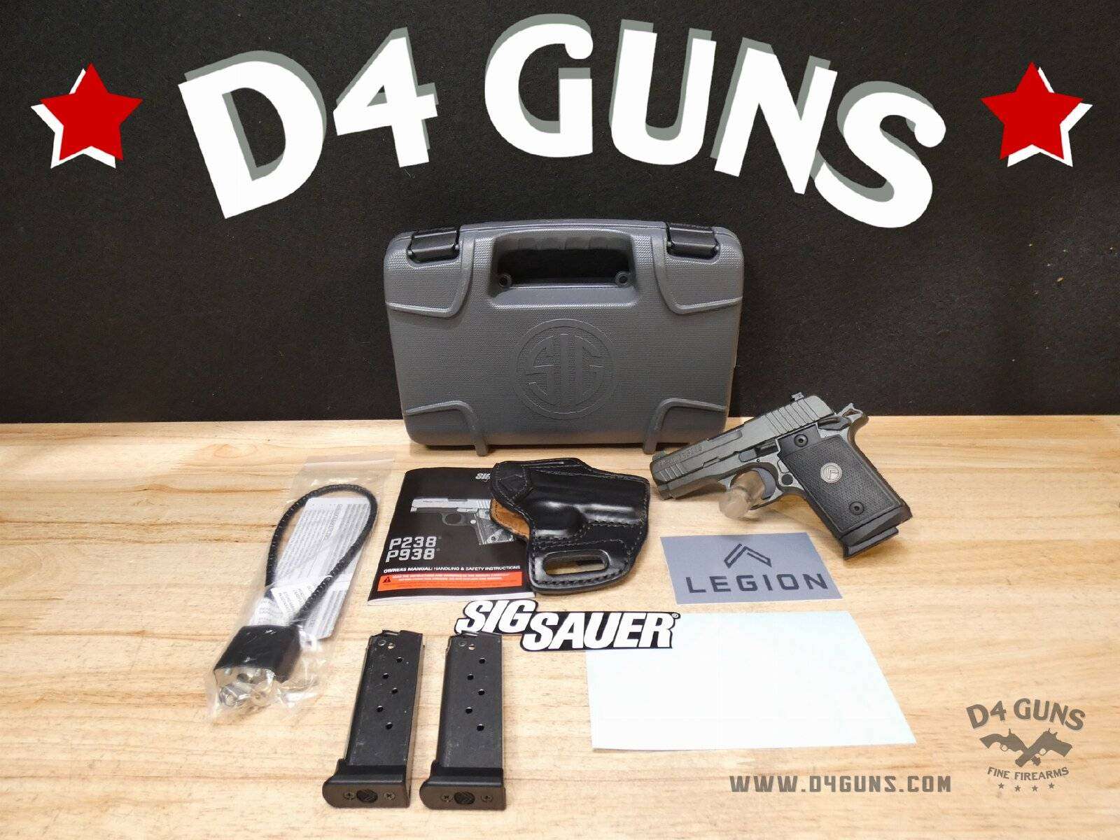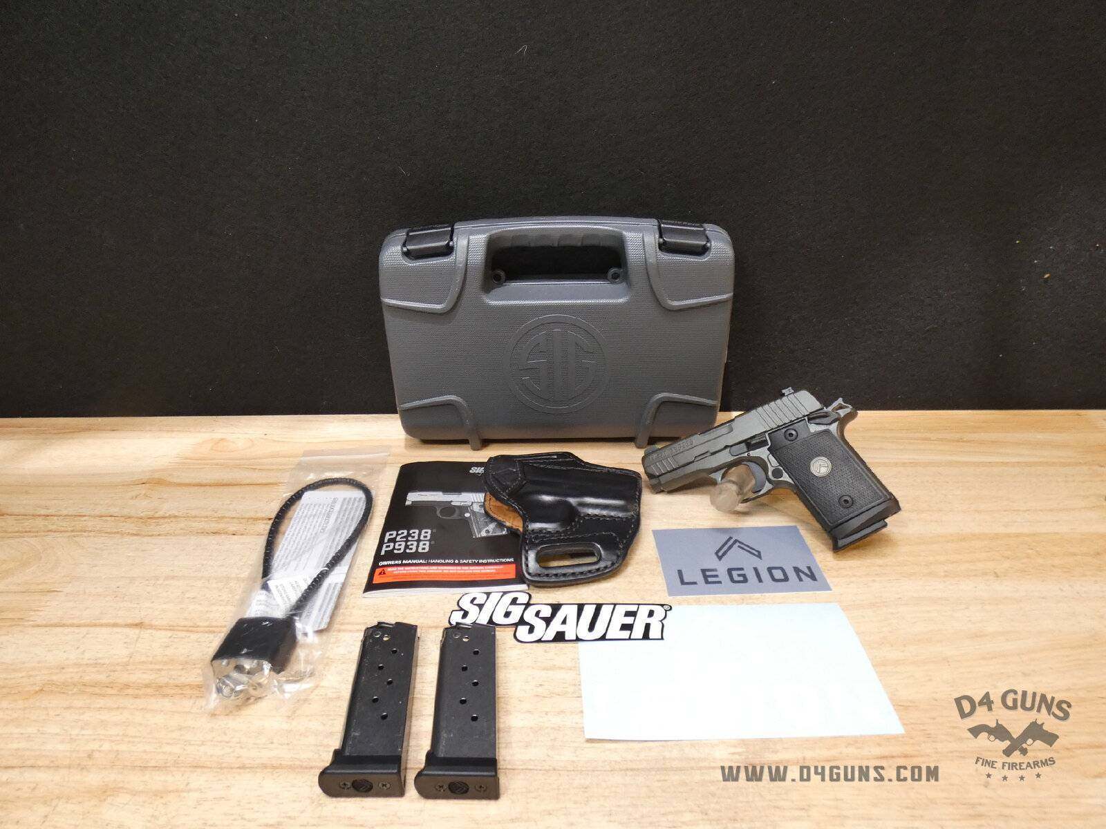 Up for grabs is a Compact Sig Sauer P938 Legion single-action-only semi-automatic in 9mm. Serial number- 52E084400. This P938 is in excellent condition. It comes with the original hardcase with instruction manual and lock inside, 3 seven round steel magazines and a leather holster. The P938 Legion includes a precision machined aluminum trigger and trigger guard checkering along with an ambidextrous thumb safety allowing for easy manipulation and accuracy. The slide features front cocking serrations and X-RAY3 Day/Night sights. The grips are Legion Black G-10 grips with an embedded Legion medallion. With the P938, Sig Sauer offers the ballistic advantage of the 9mm cartridge in a platform similar in size to the best-selling P238 pistol. A single-action-only trigger makes the P938 handle like a much larger pistol, yet is still easy to carry concealed. V2-I2 Barrel Length: 3 Bore condition: Excellent