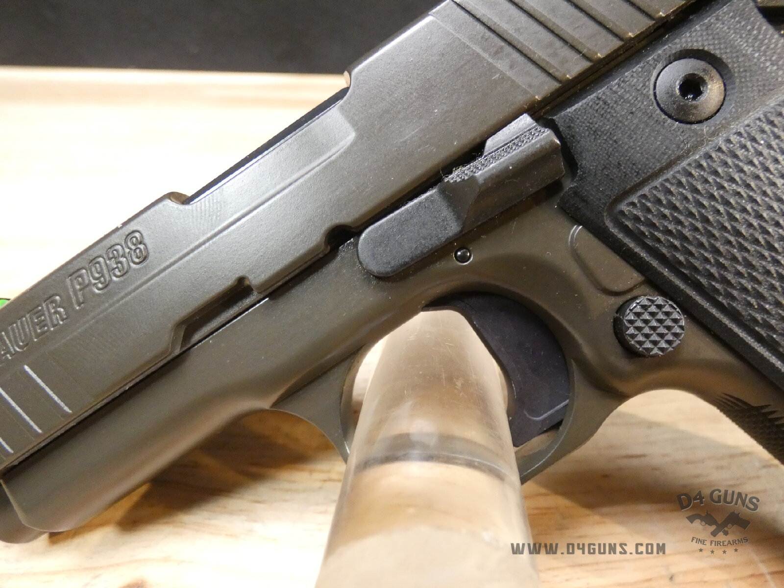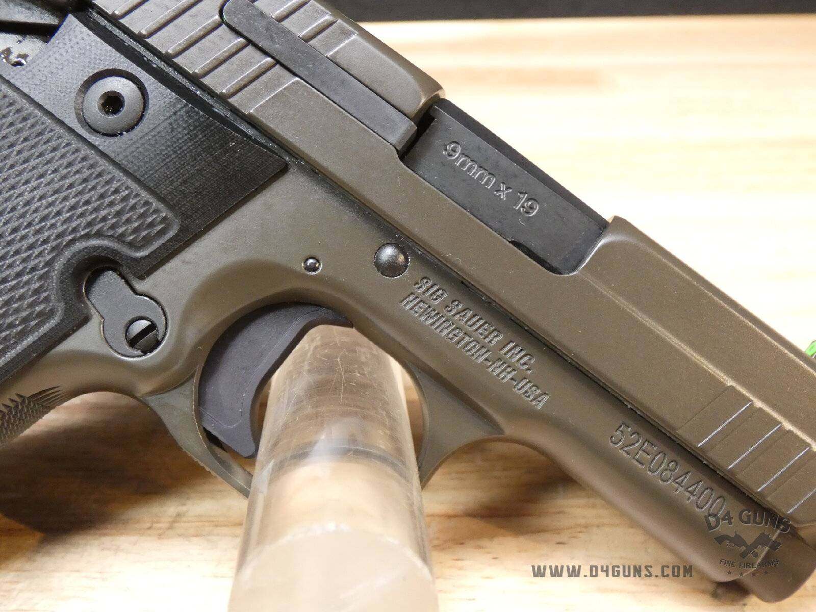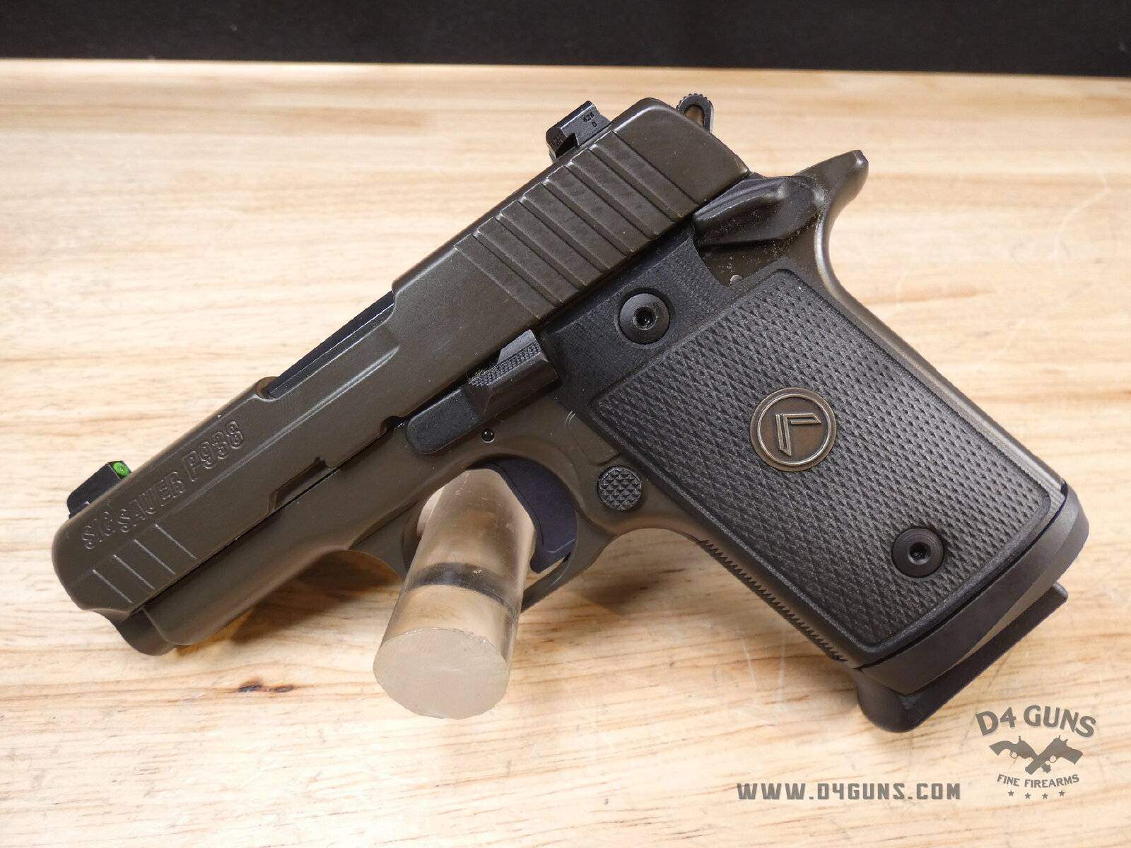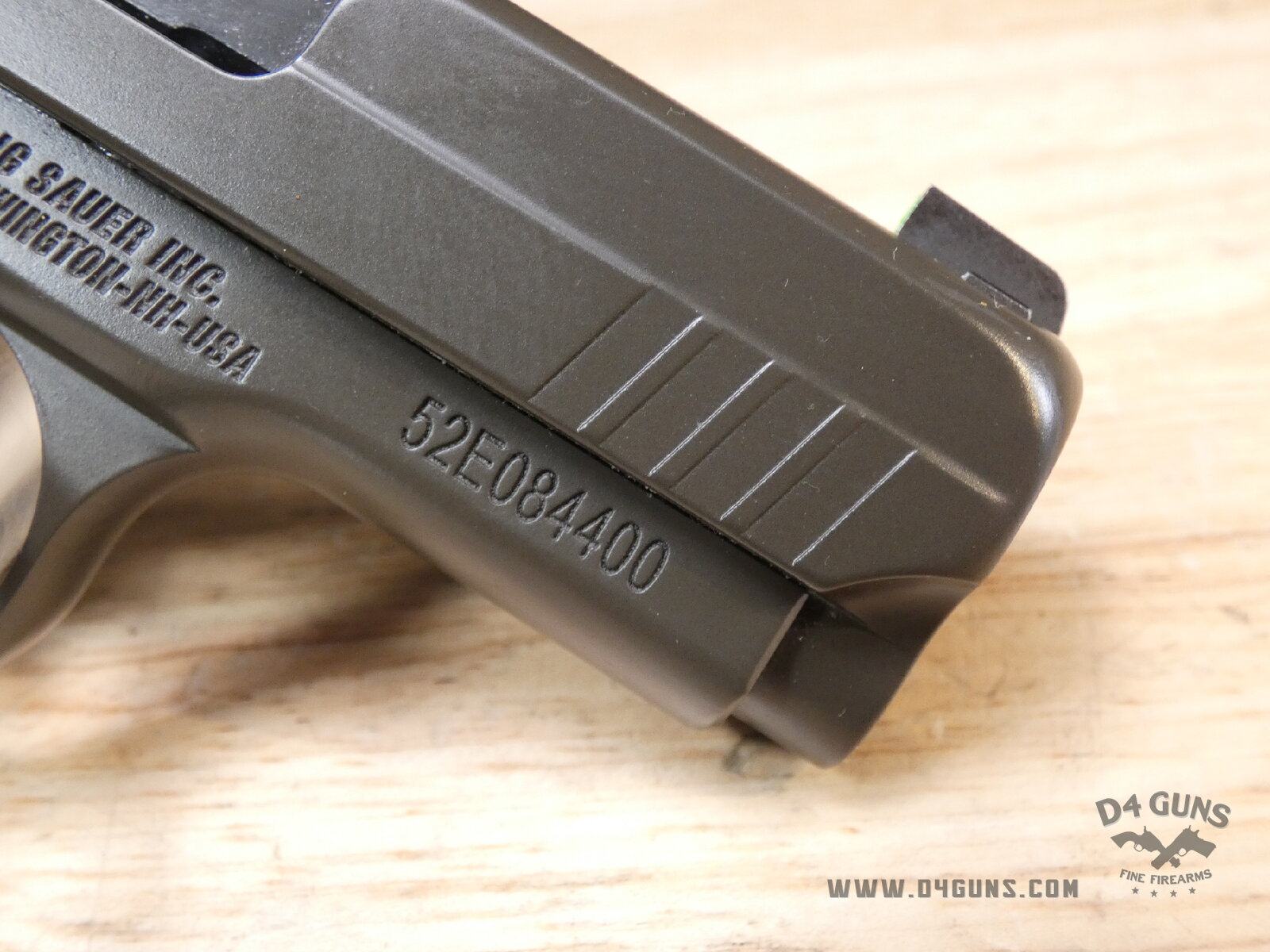 Up for grabs is a Compact Sig Sauer P938 Legion single-action-only semi-automatic in 9mm. Serial number- 52E084400. This P938 is in excellent condition. It comes with the original hardcase with instruction manual and lock inside, 3 seven round steel magazines and a leather holster. The P938 Legion includes a precision machined aluminum trigger and trigger guard checkering along with an ambidextrous thumb safety allowing for easy manipulation and accuracy. The slide features front cocking serrations and X-RAY3 Day/Night sights. The grips are Legion Black G-10 grips with an embedded Legion medallion. With the P938, Sig Sauer offers the ballistic advantage of the 9mm cartridge in a platform similar in size to the best-selling P238 pistol. A single-action-only trigger makes the P938 handle like a much larger pistol, yet is still easy to carry concealed. V2-I2 Barrel Length: 3 Bore condition: Excellent