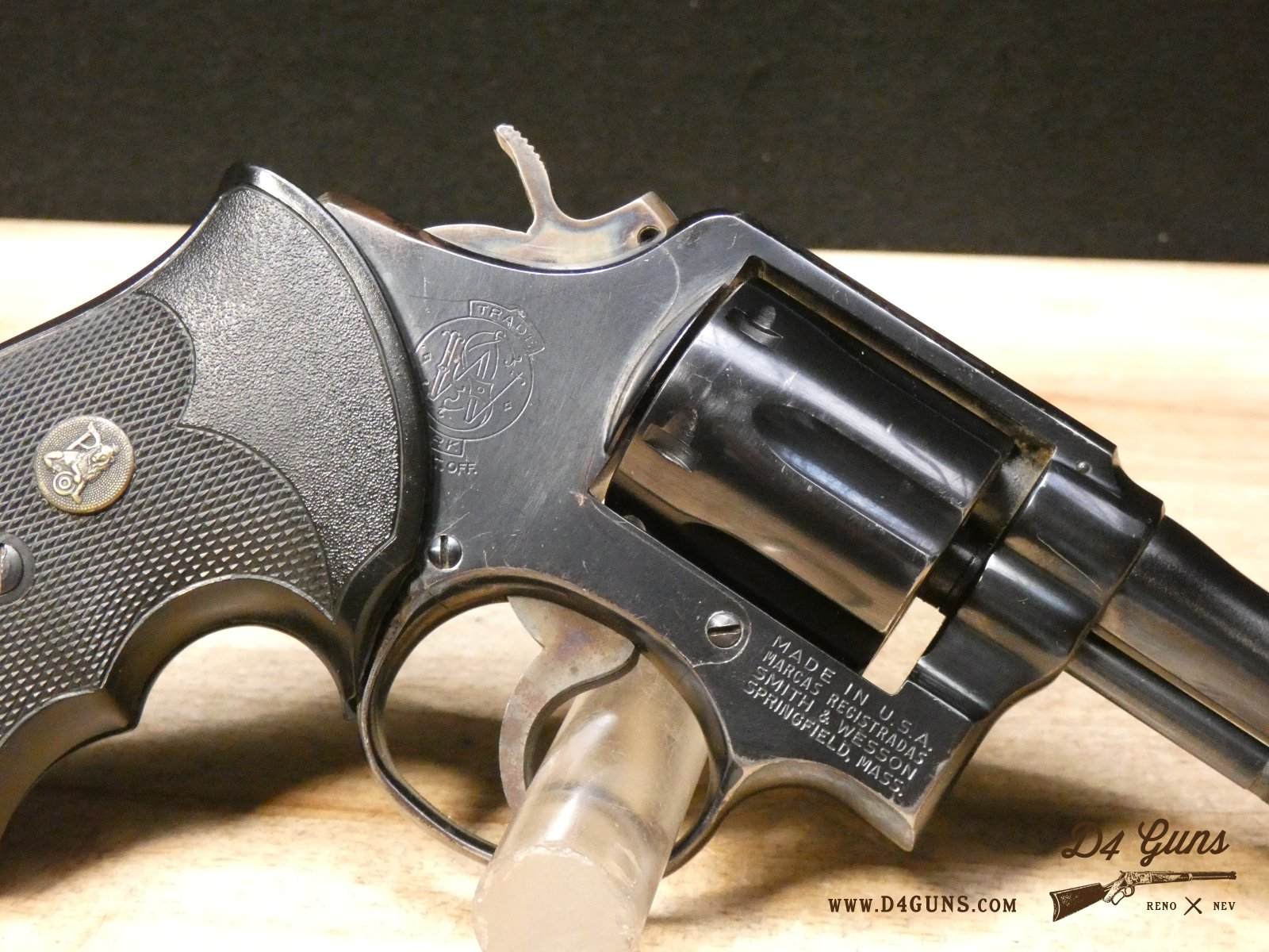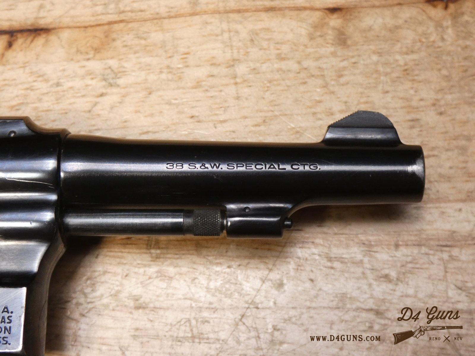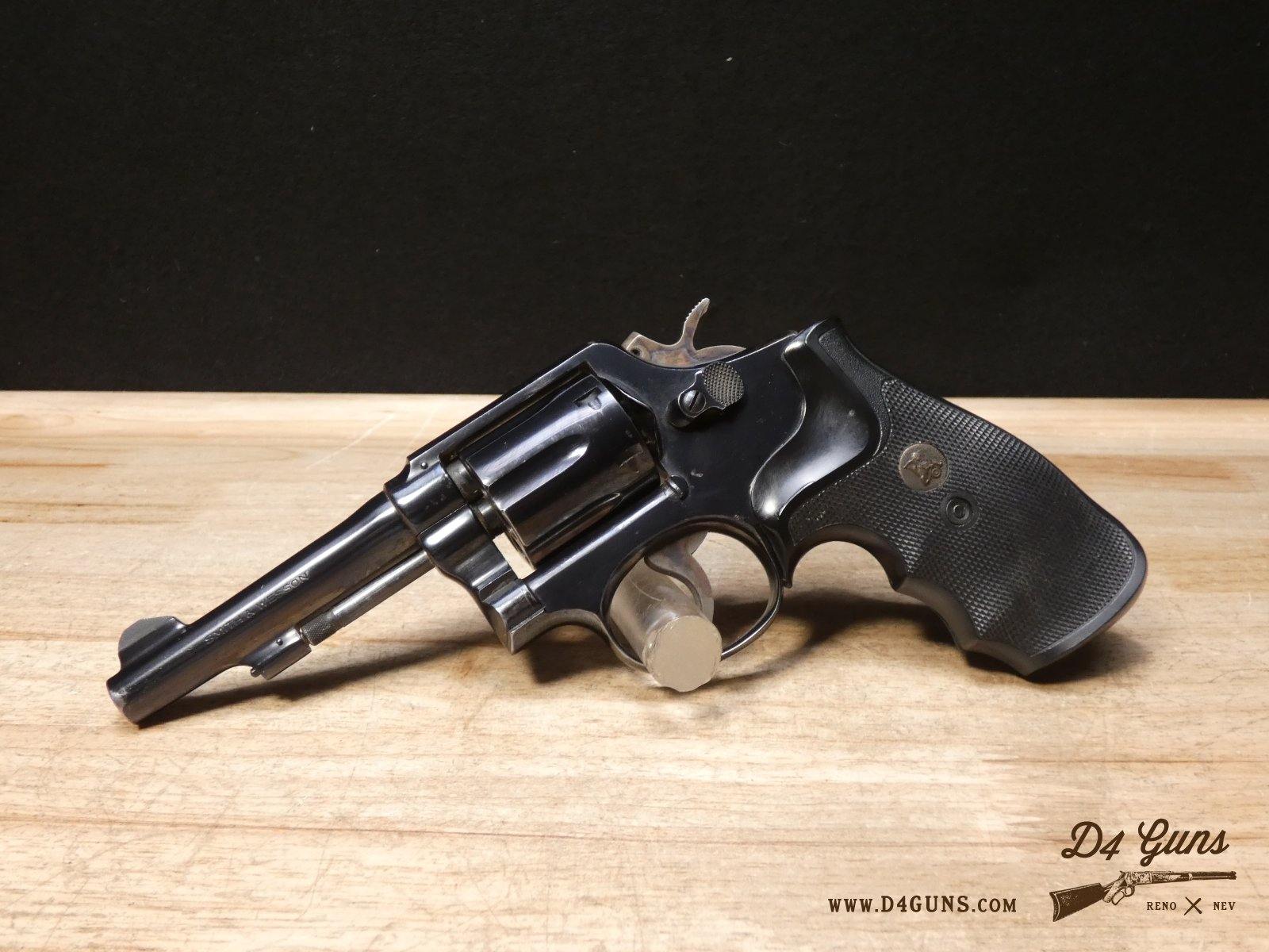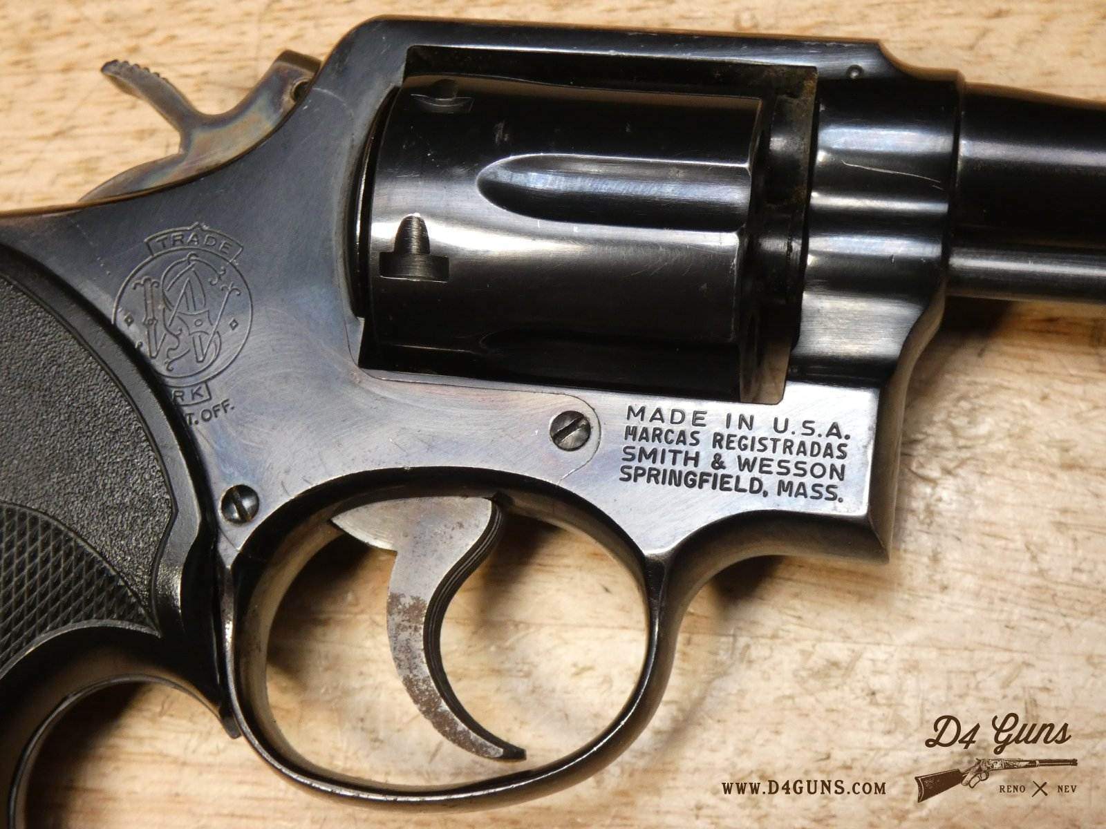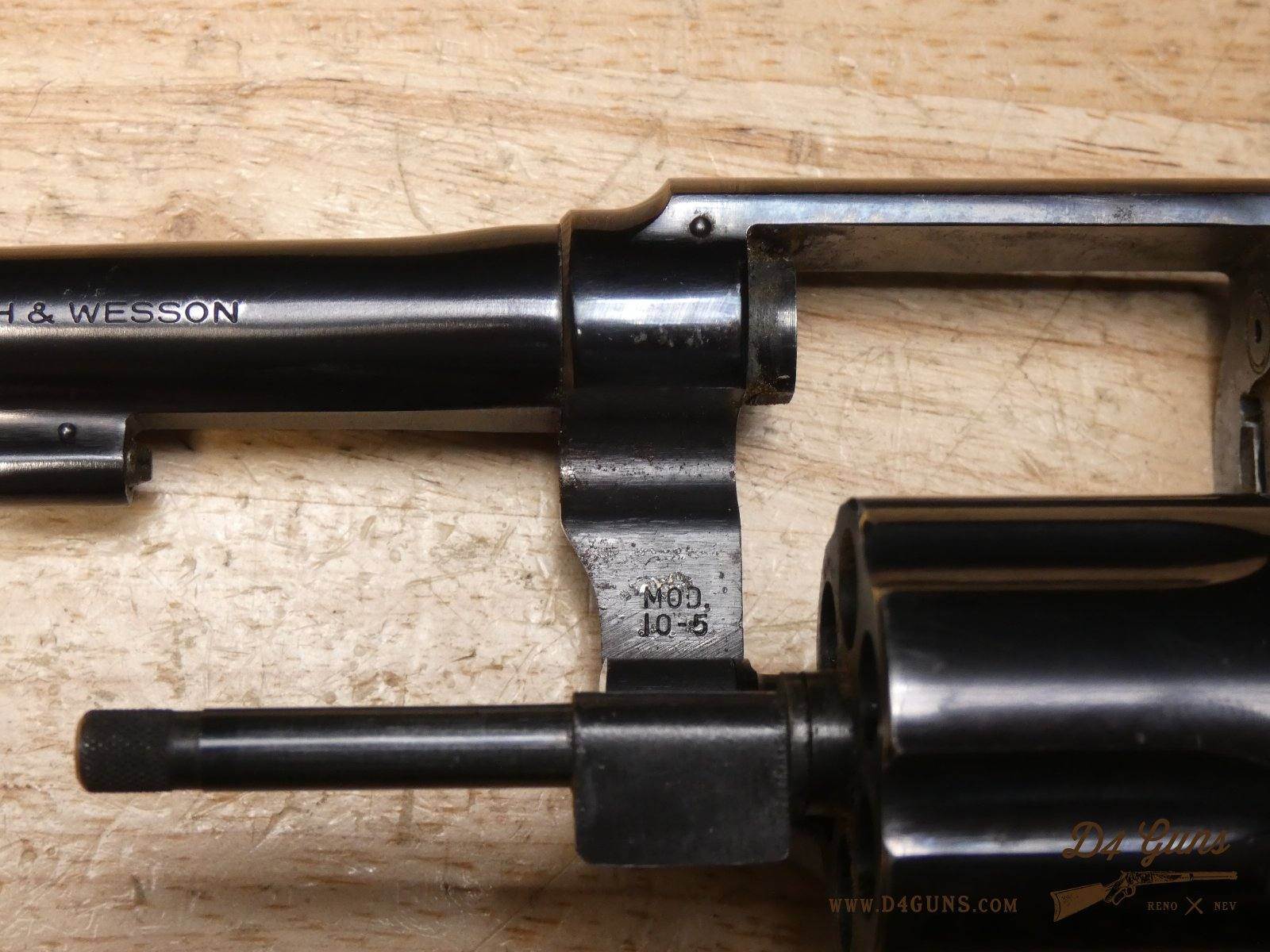 For sale is a Smith & Wesson Model 10-5 revolver pistol in .38 Special. Serial number- D531608. In production since 1899, the Model 10 is a six-shot, .38 Special, double-action revolver with fixed sights. Some 6,000,000 of the type have been produced over the years, making it the most popular handgun of the 20th century. Features Pachmyer rubber grips! V2-E3 Barrel Length: 4 Bore condition: Good