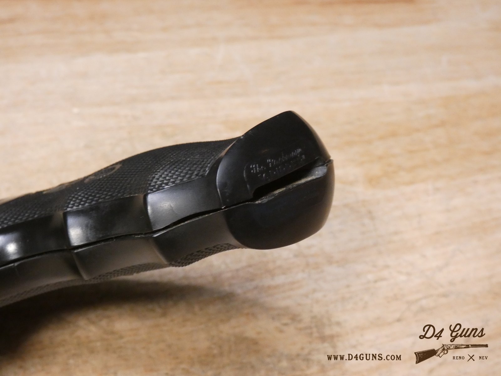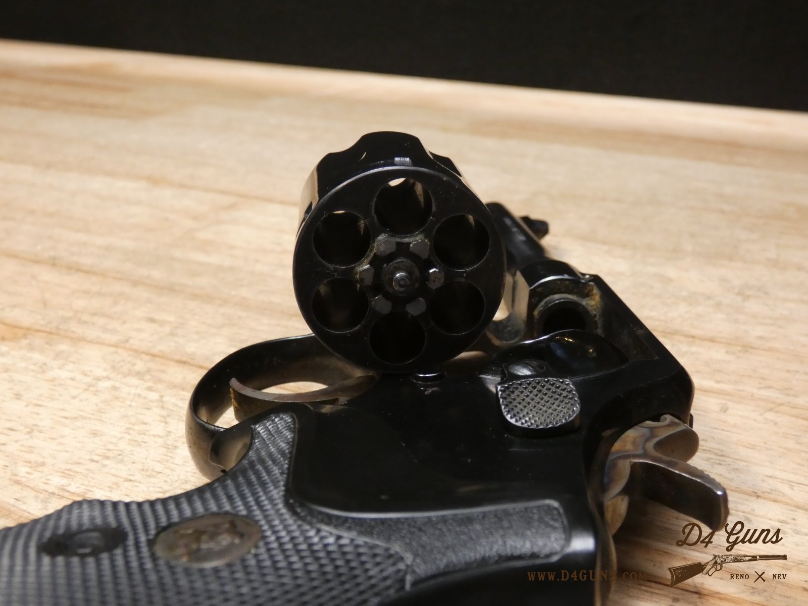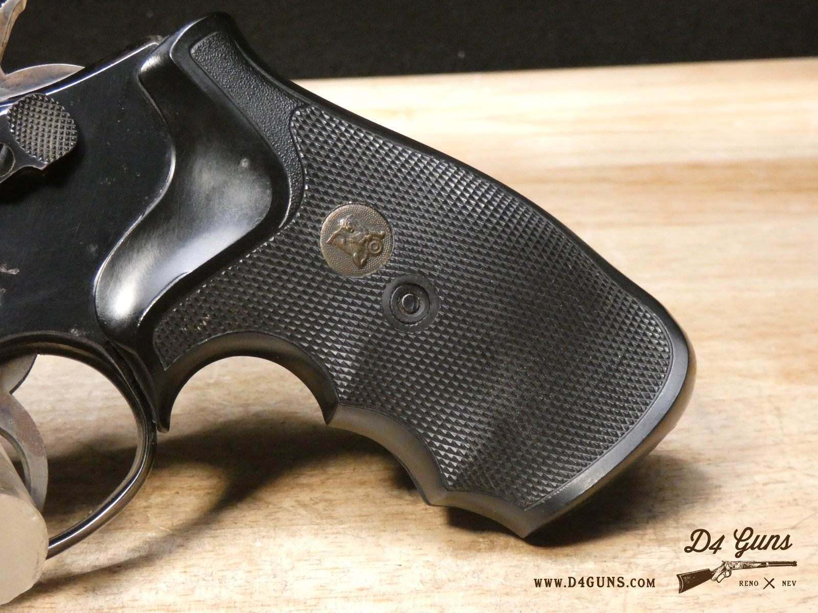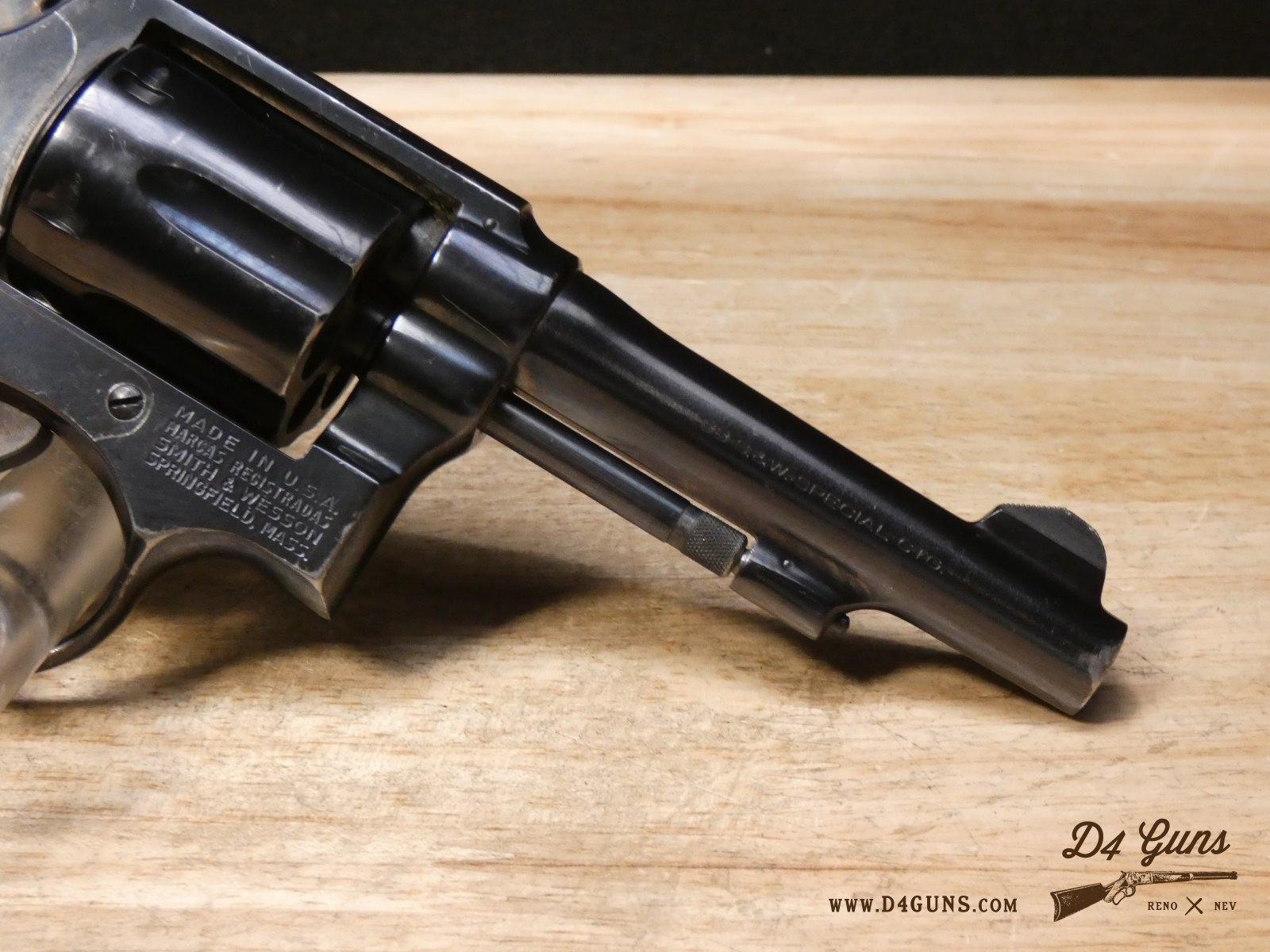 For sale is a Smith & Wesson Model 10-5 revolver pistol in .38 Special. Serial number- D531608. In production since 1899, the Model 10 is a six-shot, .38 Special, double-action revolver with fixed sights. Some 6,000,000 of the type have been produced over the years, making it the most popular handgun of the 20th century. Features Pachmyer rubber grips! V2-E3 Barrel Length: 4 Bore condition: Good