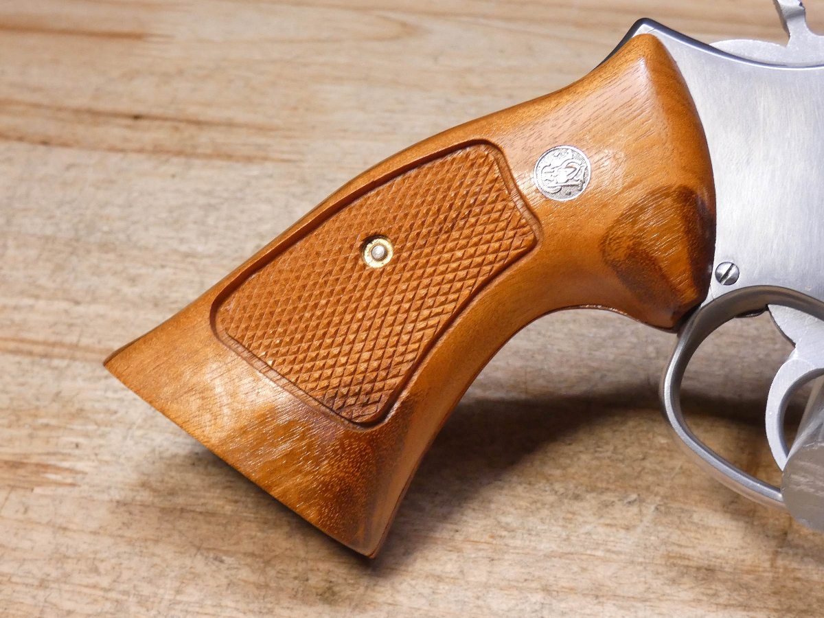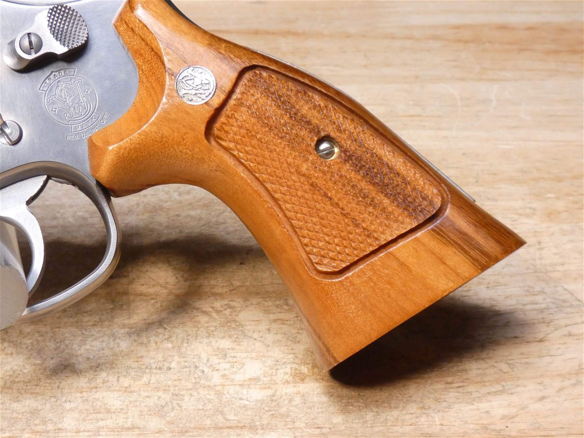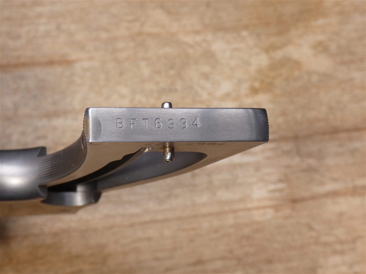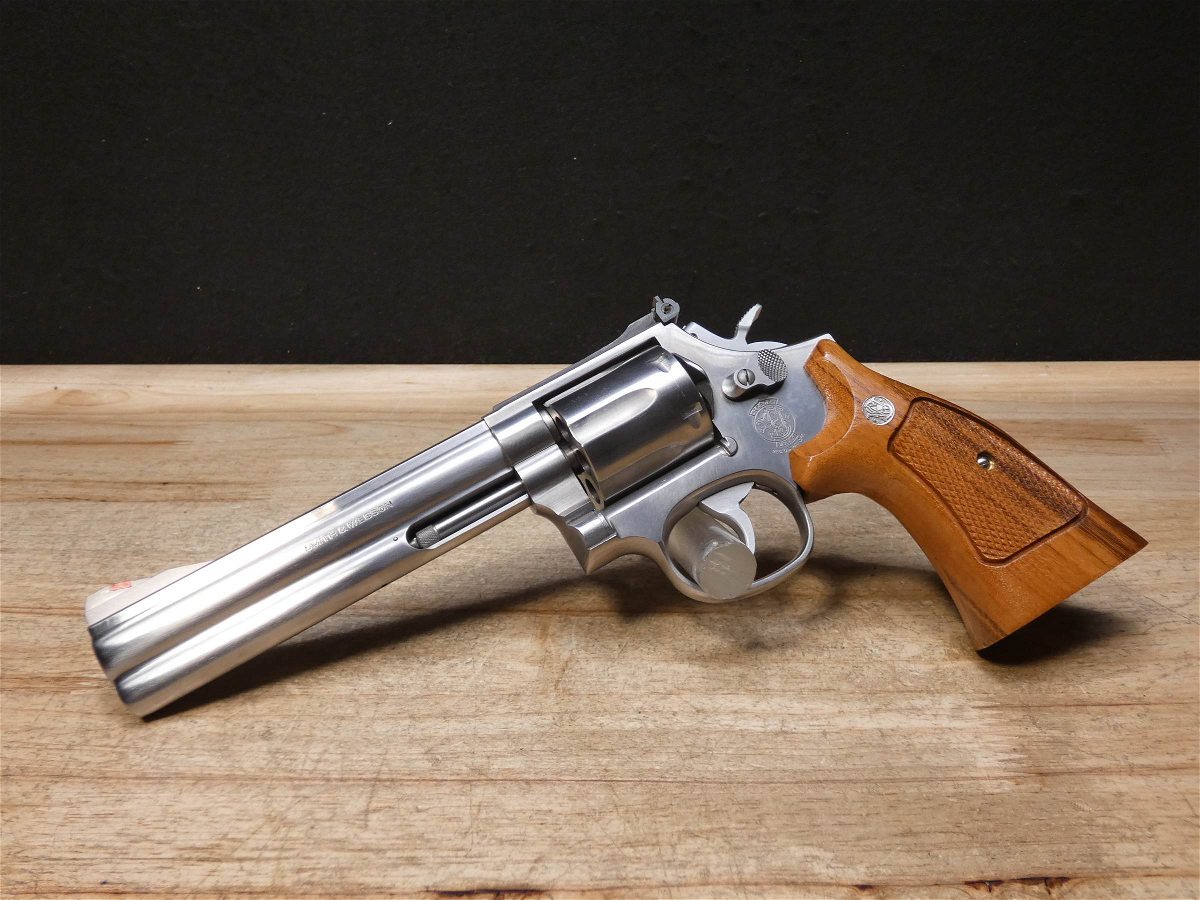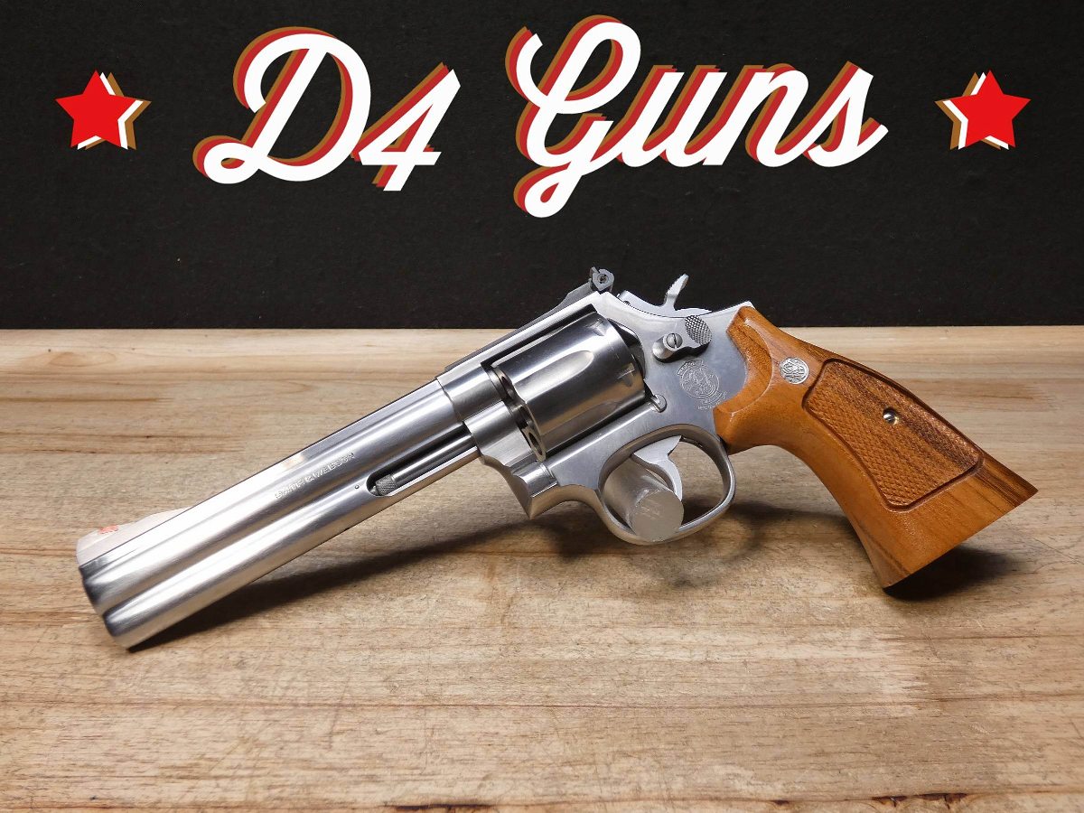 For sale is a Smith & Wesson 686-3 double-action revolver in .357 Mag. Serial number – BFT6934. This pistol is in great condition and sports the original wood grips. Smith & Wesson introduced Model 686 in 1981. It is the stainless steel version of the 586, which was a blued steel finish. It was chambered for .357 Magnum and .38 S&W calibers. The Model 686 is based on S&W's K/L (medium) revolver frame. V2-I3 Barrel Length: 6 Bore condition: Good