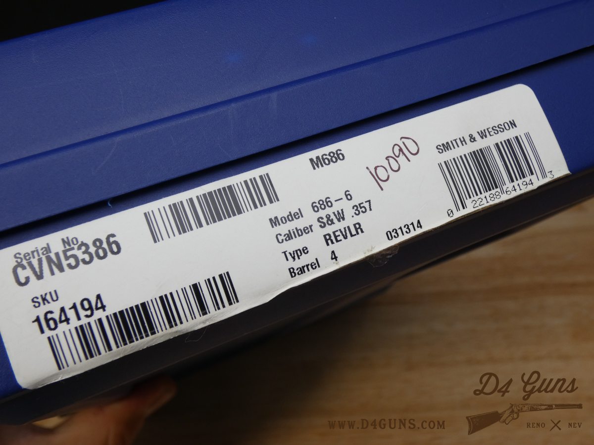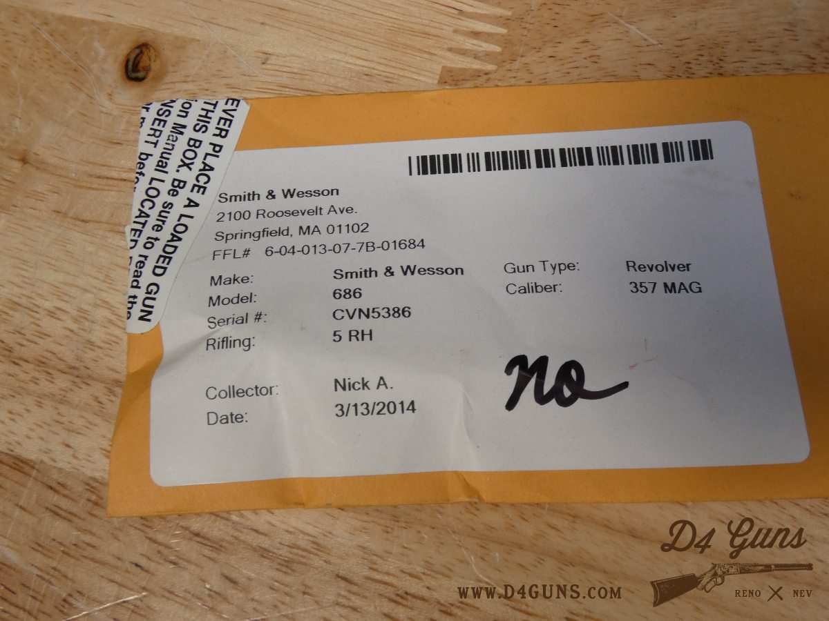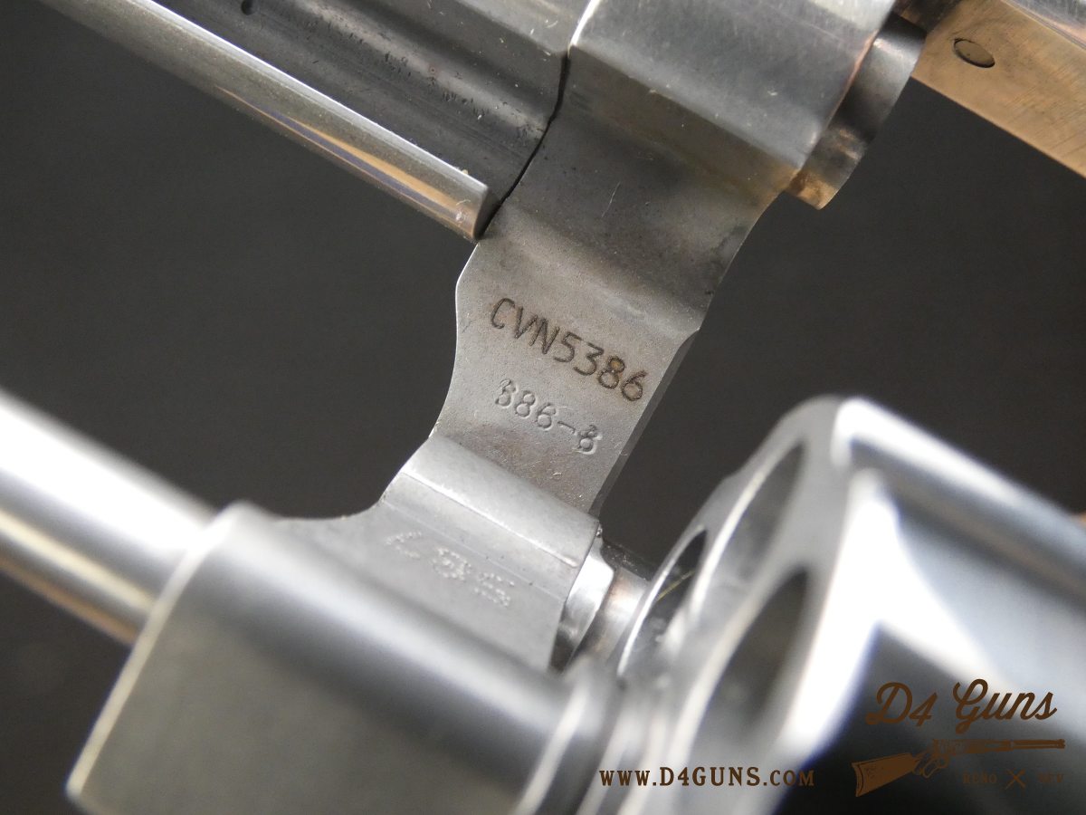 For sale is a Smith & Wesson 686-6 revolver in .357 Mag. Serial number-CVN5386. This revolver is in great condition and comes with the original case, manual, and cable lock. Features include a 6 round cylinder, orange ramp sight, and rubberized grips. Smith & Wesson L-Frame revolvers are built to suit the demands of the most serious firearms enthusiast. As police officers and hunters will attest, this firearm is made to withstand heavy use. V2-J1 Barrel Length: 4 Bore condition: Excellent