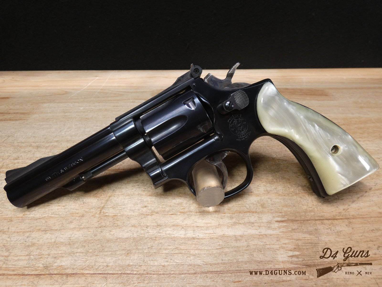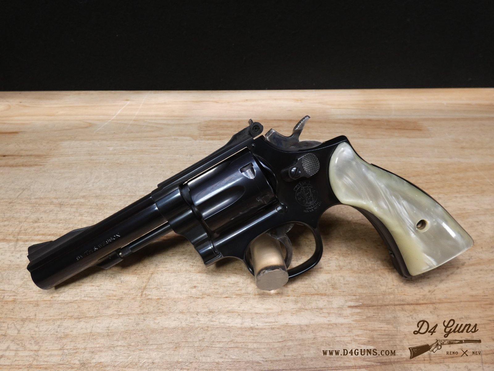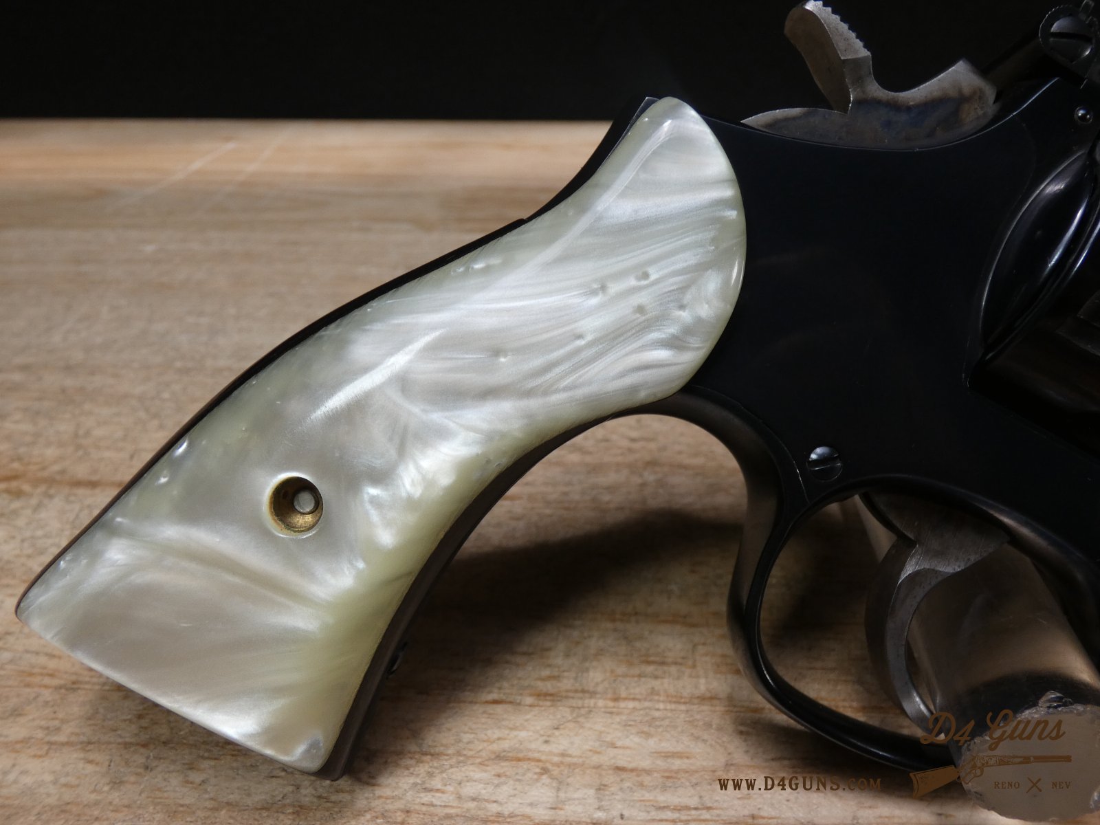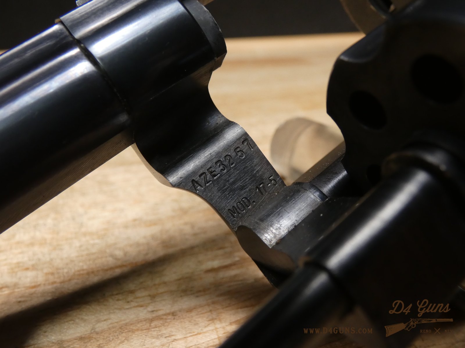 For sale is a Smith & Wesson Model 17-5 double-action revolver in .22 LR. Serial number- AZE3257. This 17-5 is in good condition and features a 4" barrel, a six round cylinder and "pearl" grips. The Smith & Wesson Model 17 is a six-shot double-action revolver built on Smith & Wesson's medium-sized K-frame. The Model 17 is a timeless revolver that was often used for competition shooting. The Model 17 was revived by Smith & Wesson in 2009 as the Model 17 Masterpiece (this is not a recontinued revolver). V2-J3 Barrel Length: 4 Bore condition: Good