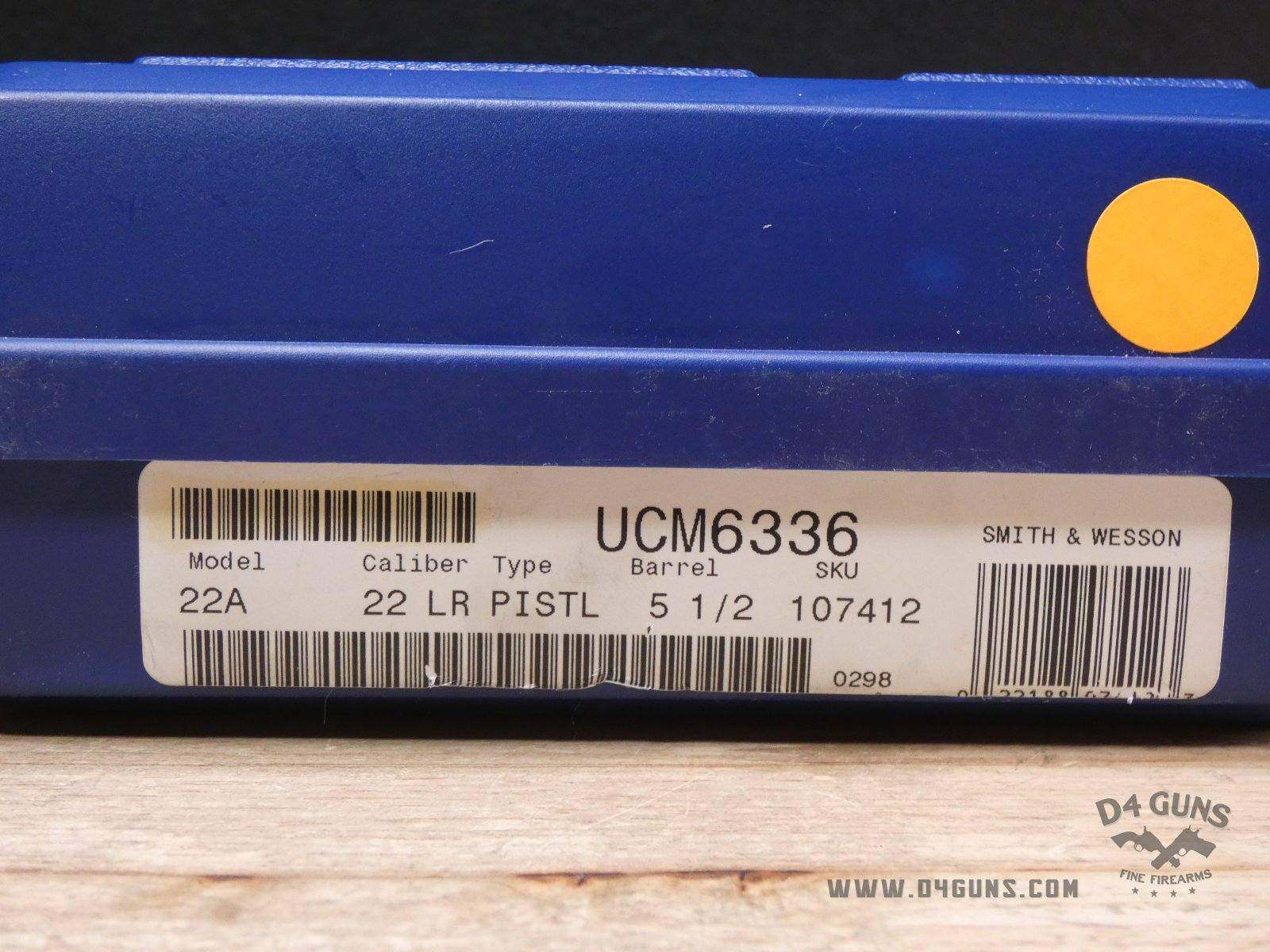 Up for grabs is a Smith & Wesson Model 22A-1 semi-automatic pistol in .22 LR. Serial number- UCM6336. This pistol is in excellent condition and comes with the original case, and 2 magazines. Smith & Wesson's series of rimfire pistols are ideal for competitive target shooting or recreational shooting. Known for their superior performance. Whether a first handgun purchase or a tool to hone shooting skills, these extremely accurate target pistols are perfect for shooters at all skill levels. V2-H2 Barrel Length: 5.5 Bore condition: Excellent