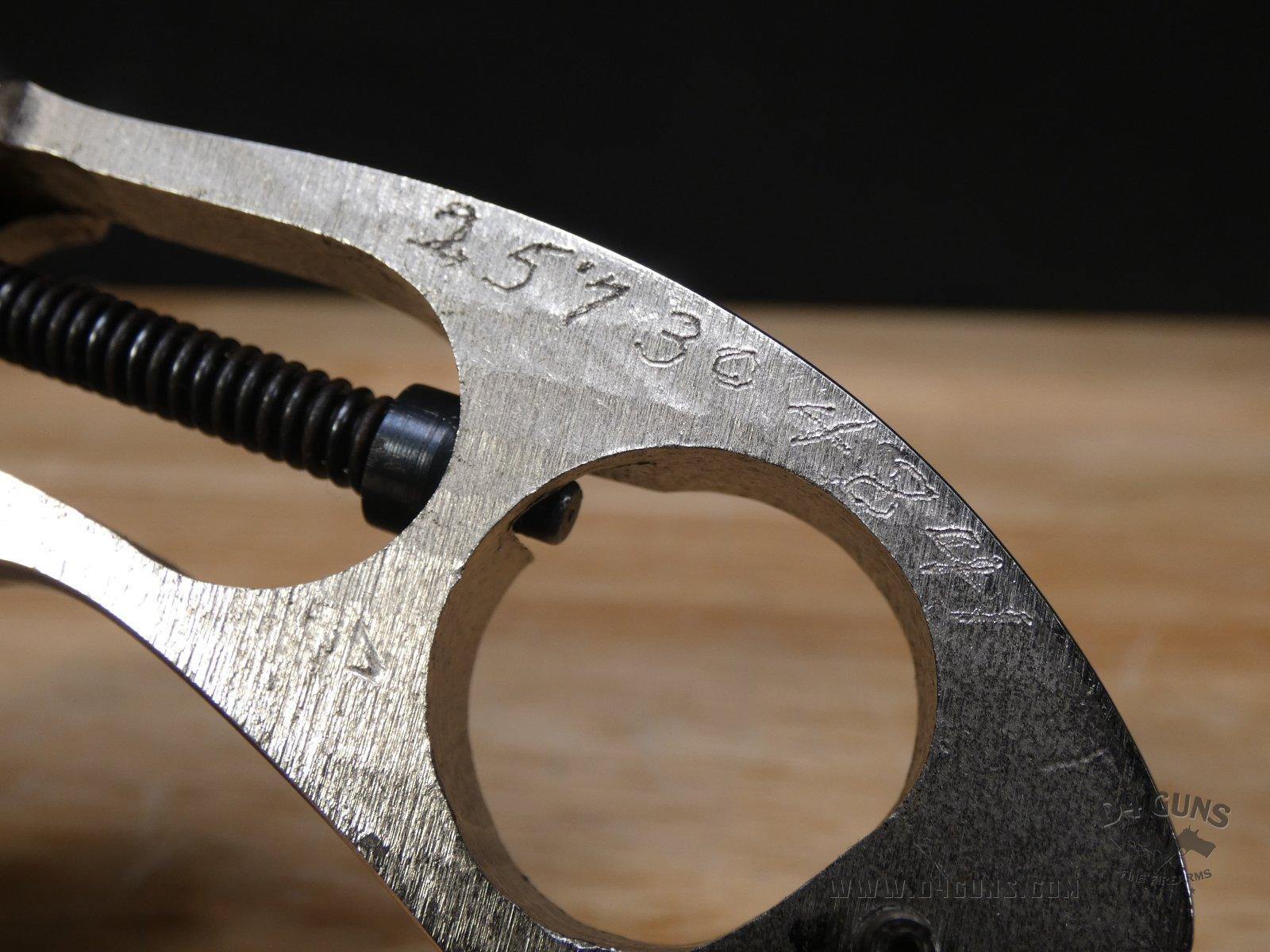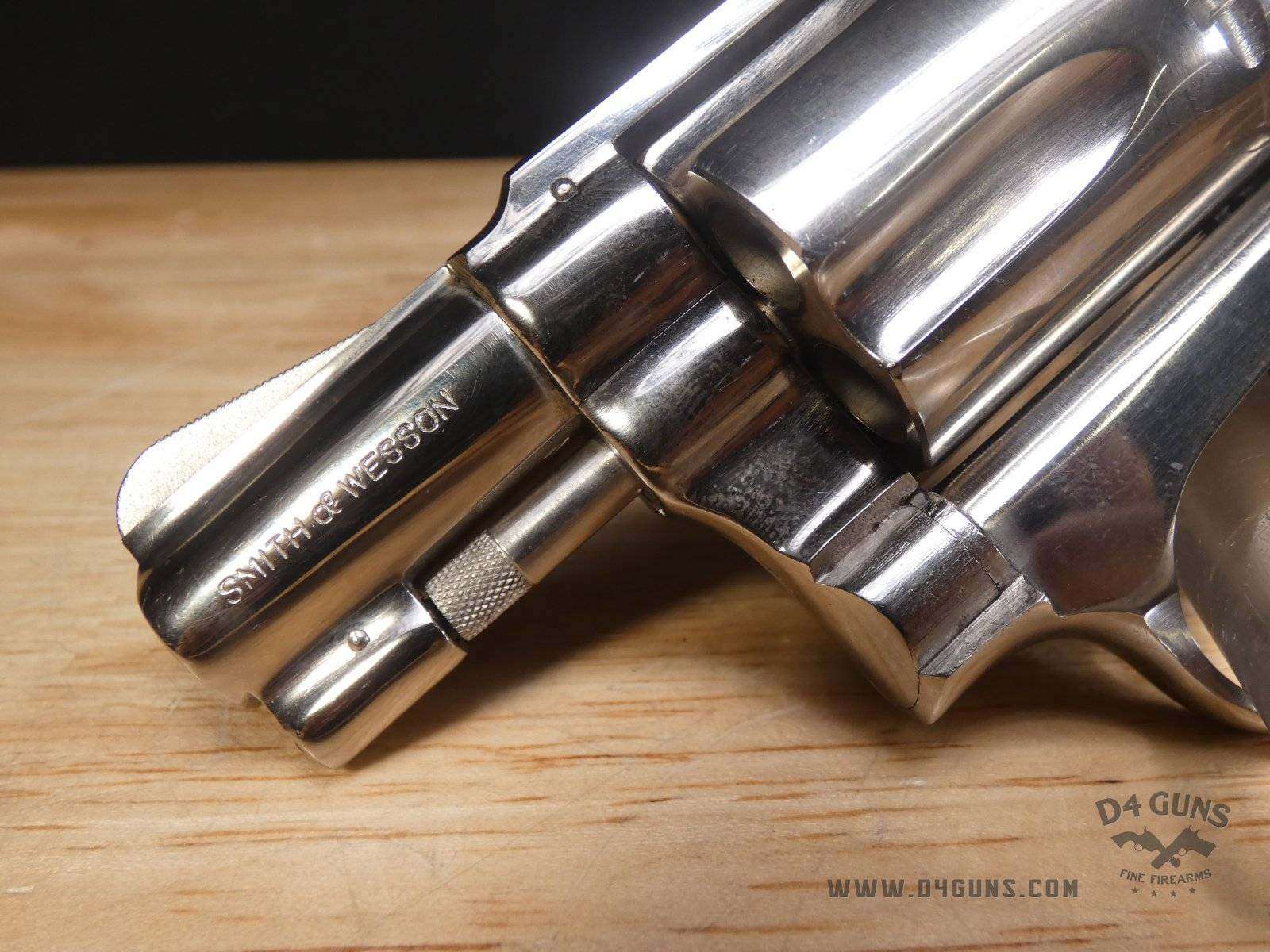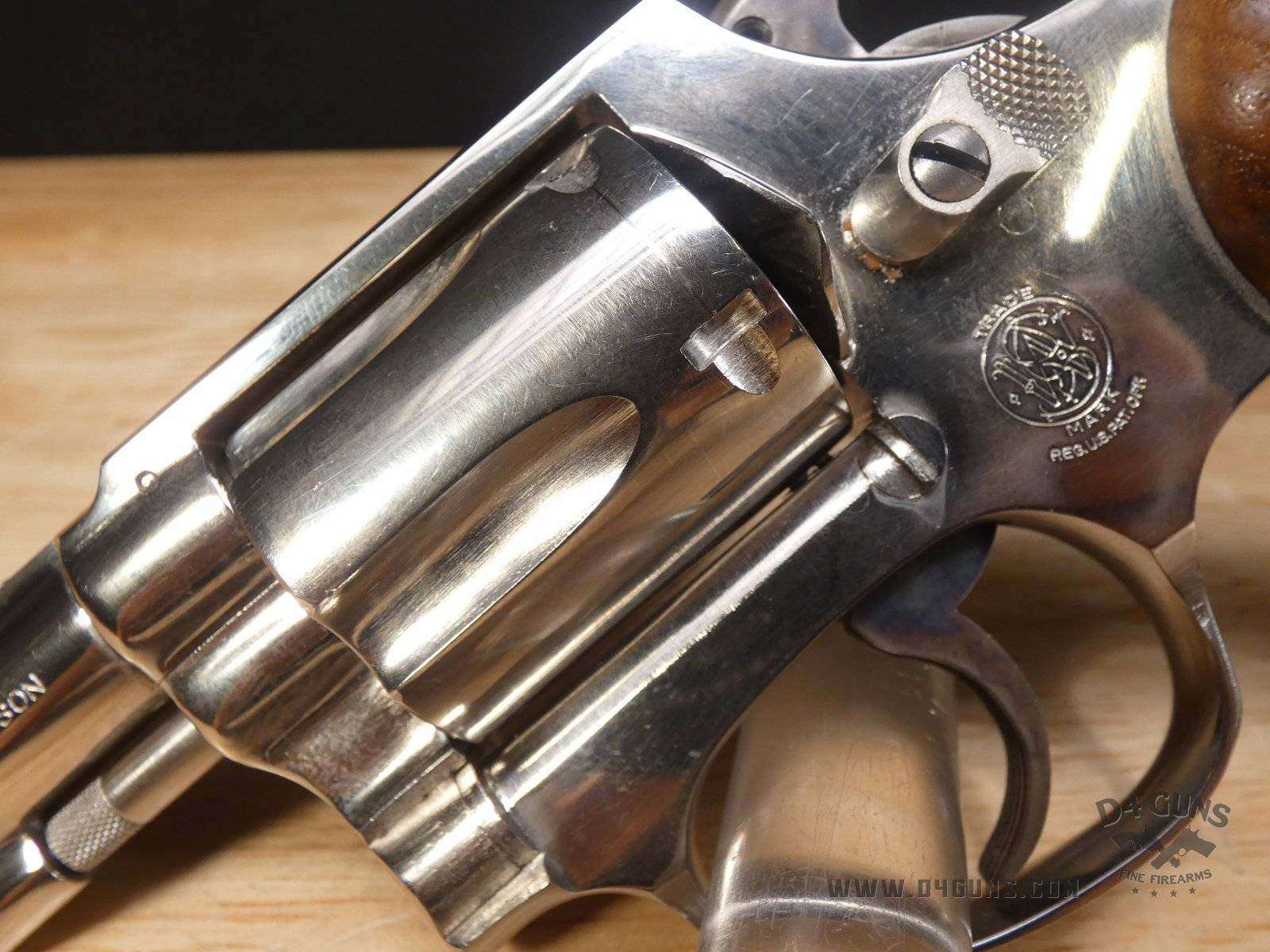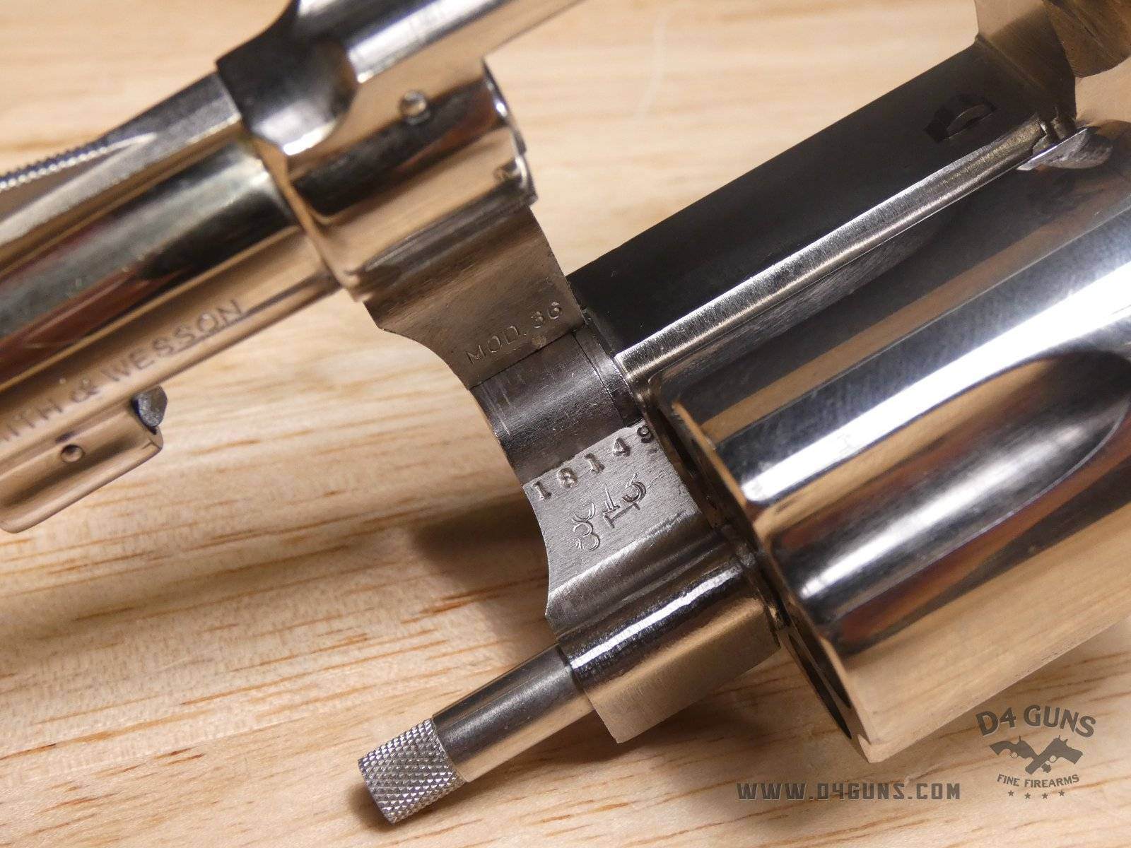 For sale is a Smith & Wesson Model 36 revolver in .38 S&W SPL. Serial number- 367J58. This 5 shot Model 36 is in good condition and features a nickel plated finish with wood grips. The Model 36 was designed in the era just after World War II, when Smith & Wesson stopped producing war materials and resumed normal production. For the Model 36, they sought to design a revolver that could fire the more powerful .38 Special round in a small, concealable package. The new design was introduced at the International Association of Chiefs of Police (IACP) convention in 1950, and was favorably received. A vote was held to name the new revolver, and the name "Chiefs Special" won. It was produced as the "Chiefs Special" until 1957, when it then became the Model 36. This revolver has proved to be reliable and popular for personal protection due to its size and weight. V2-E1 Barrel Length: 2 Bore condition: Excellent